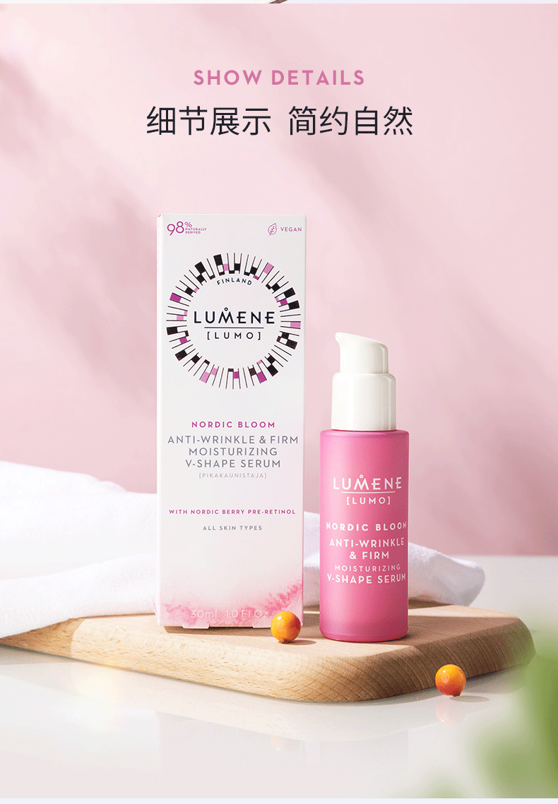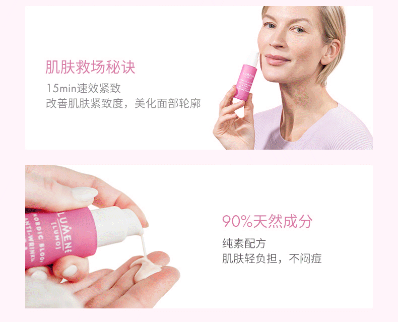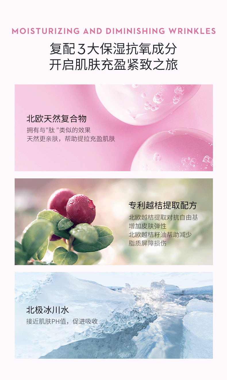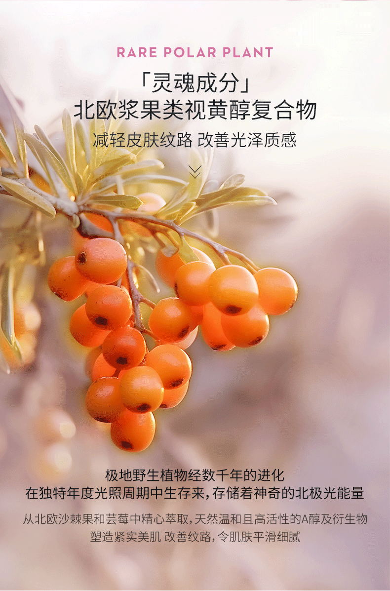 在成分上,除了刚在介绍绽放早晚面霜时,提到的北欧野生植物越橘的提取物以外,还添加了在北欧沙棘果及北欧芸莓提取的100%纯植物A醇,可以帮助皮肤抵御光损伤,同时改善皮肤的光泽和质感。