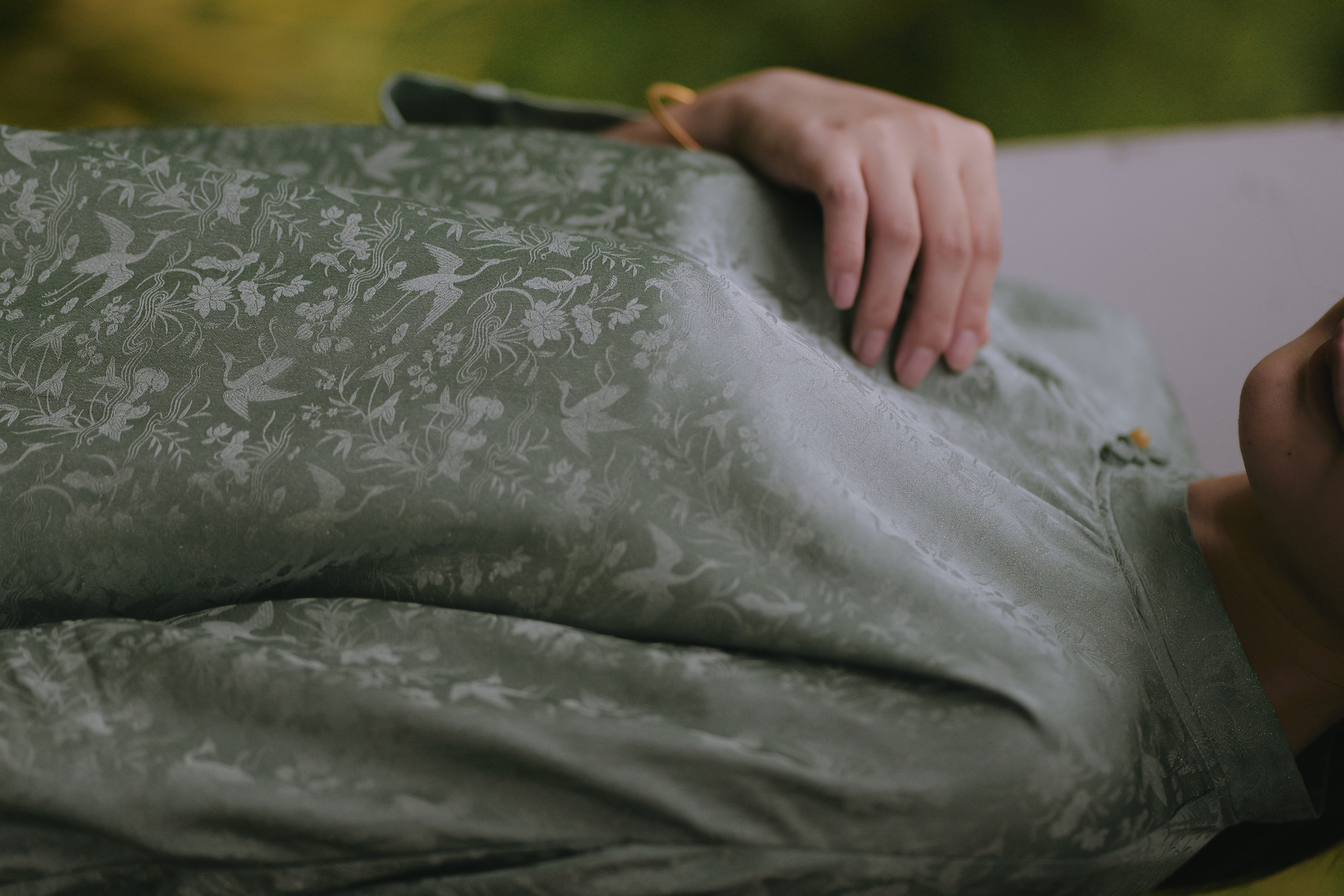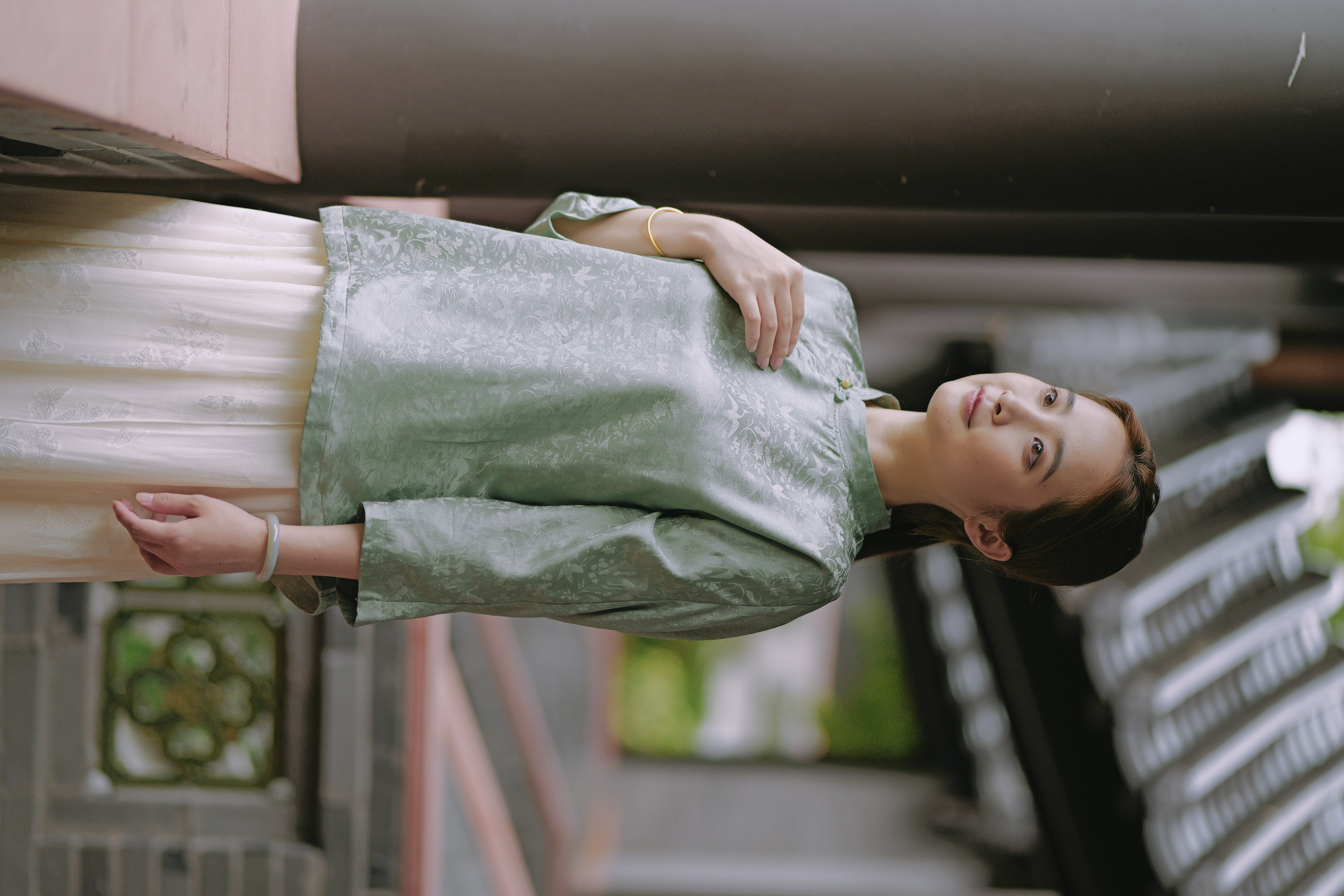 【漫物记】 丝棉绿条纹平肩四分袖旗袍