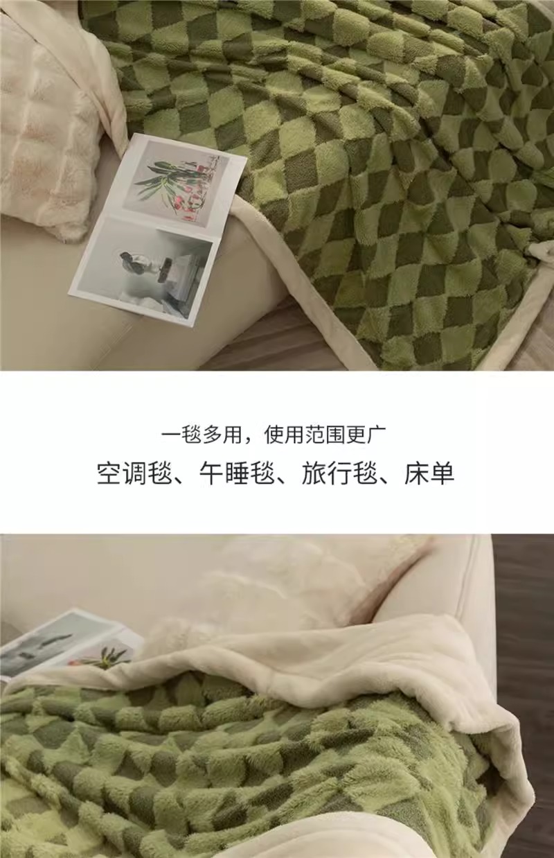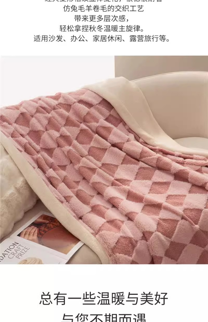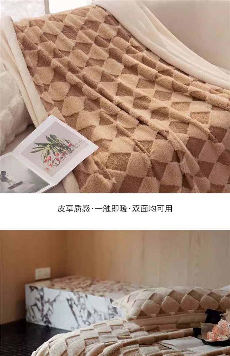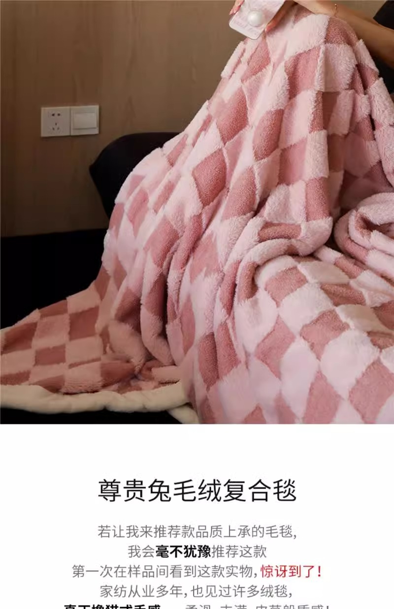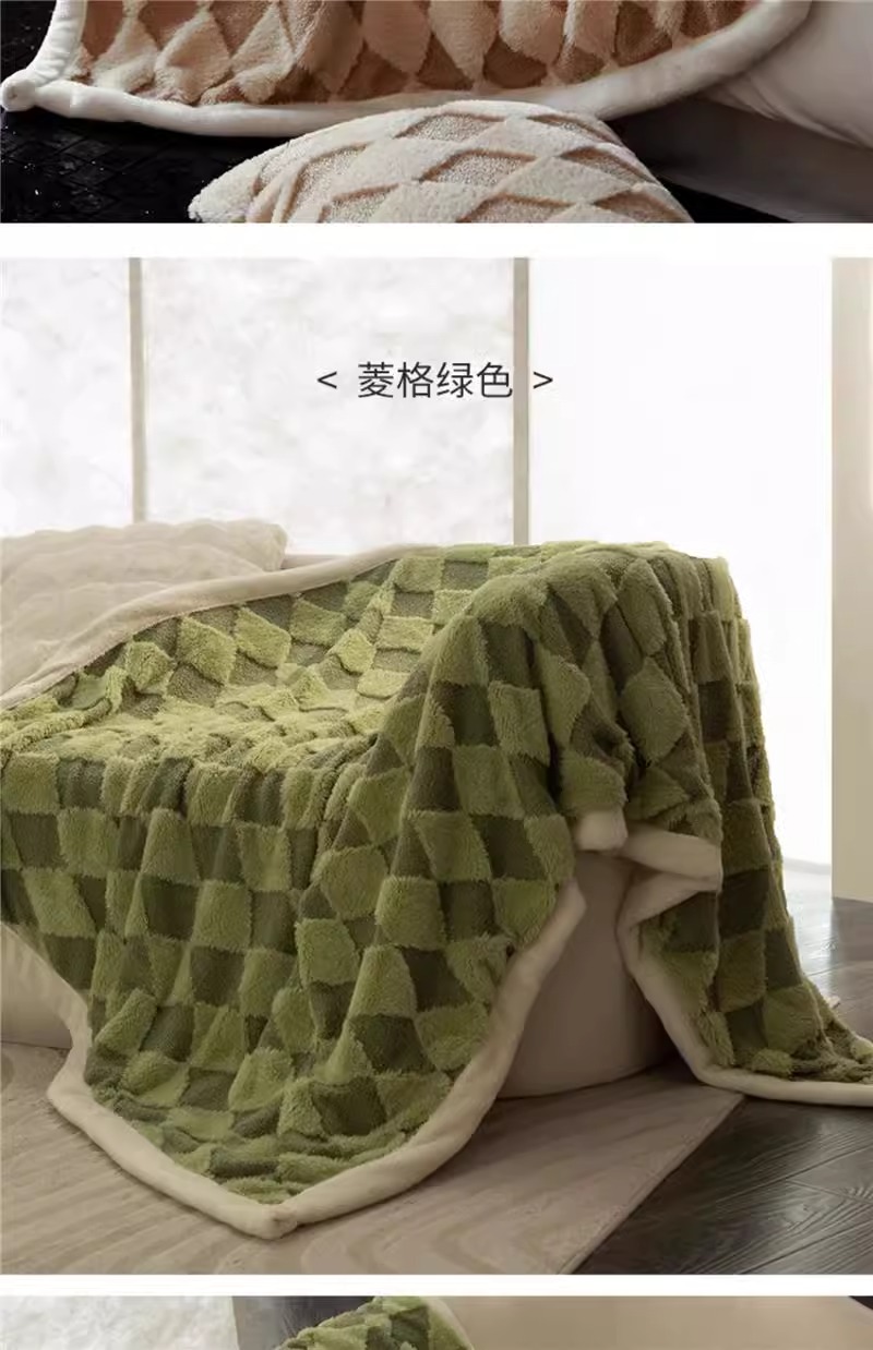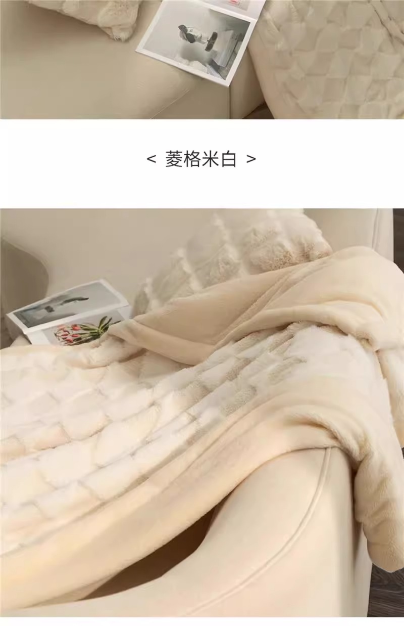 自然醒ins兔毛菱形格交织立体提花双层加厚可机洗毛毯沙发休闲膝盖毯双人卧室毯子MT