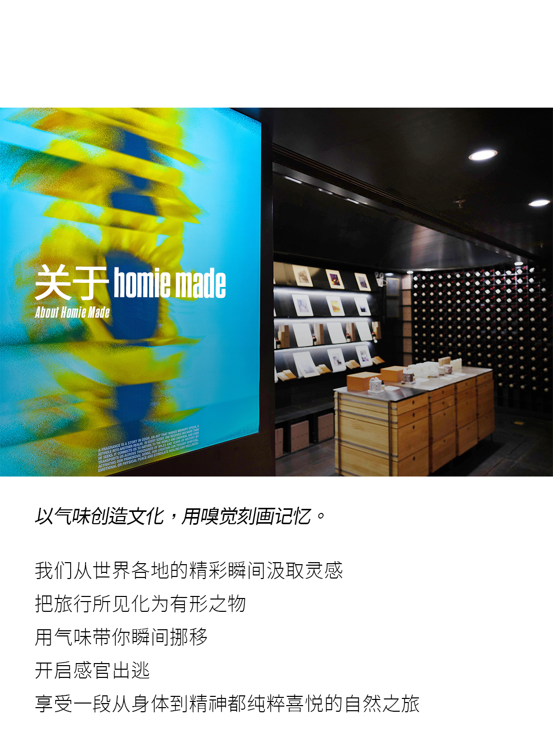 Homie Made 是以户外为灵感的香氛与个护品牌,灵感来源于世界各地正在发生的精彩瞬间。我们以哲学角度关注人与自然的连接,对生活与生命充满敬意的思考,让气味拥有一种思辨气质。
