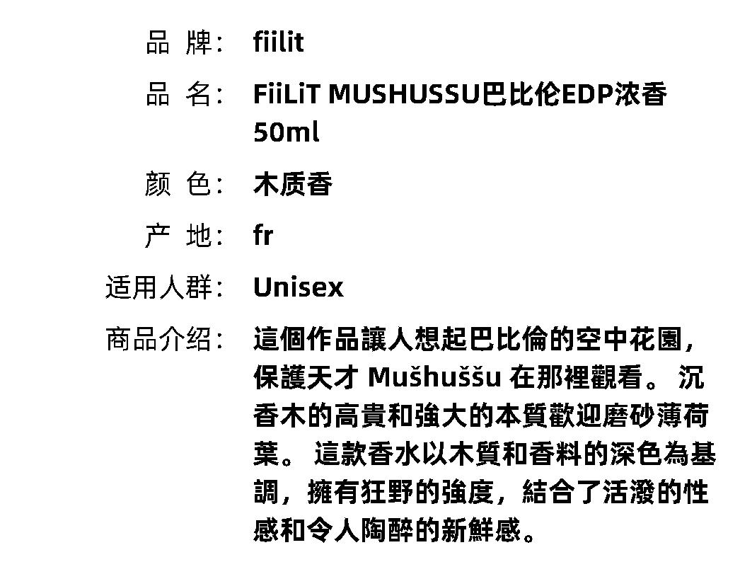 【保税仓】FiiLiT MUSHUSSU巴比伦EDP浓香50ml可补充