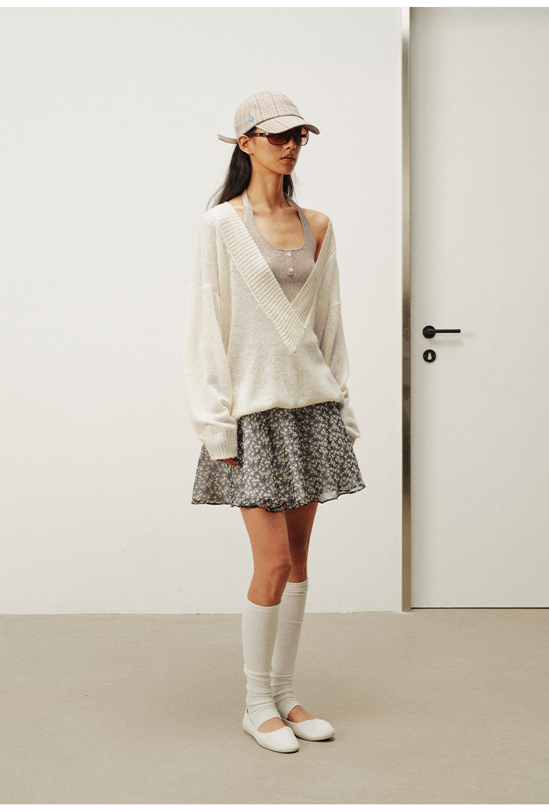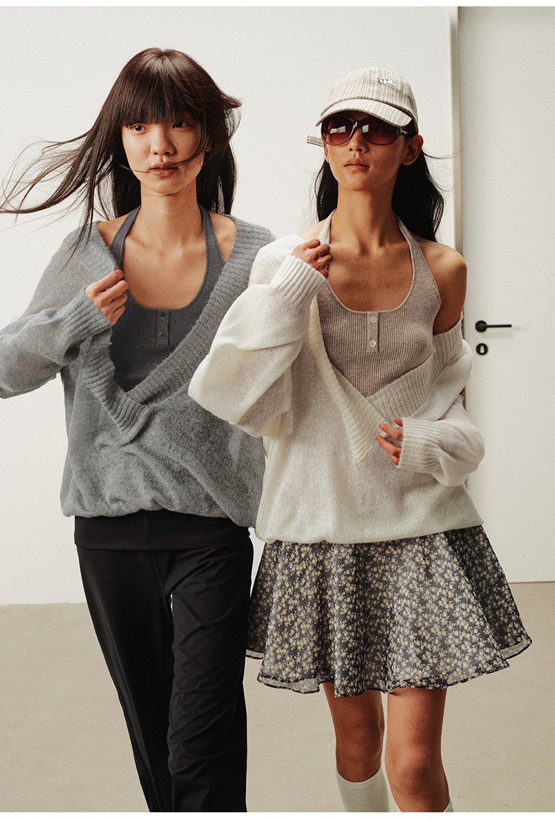 NUTH 假两件宽松深V领毛衣针织衫女 灰色/米白色(发货时间同步天猫)