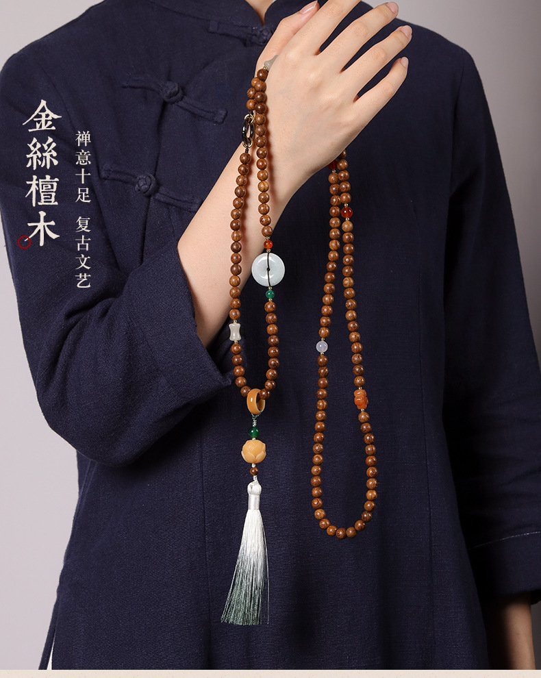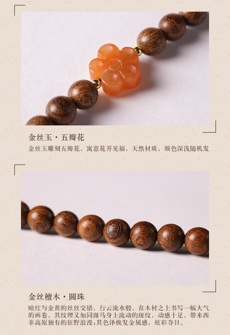 【产品尺寸】金丝檀木直径约8mm、周长约120cm、平铺总长度约62cm