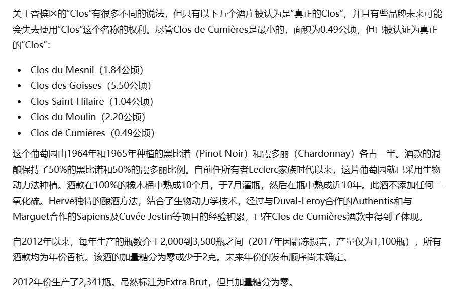 在香槟区,一般“Clos” 指的是封闭式、单园、通常围围墙的小块葡萄园 而Clos de Cumières 是香槟区少数真正以 “Clos” 名义经营的园之一,可以视其为香槟中的“独占园”!