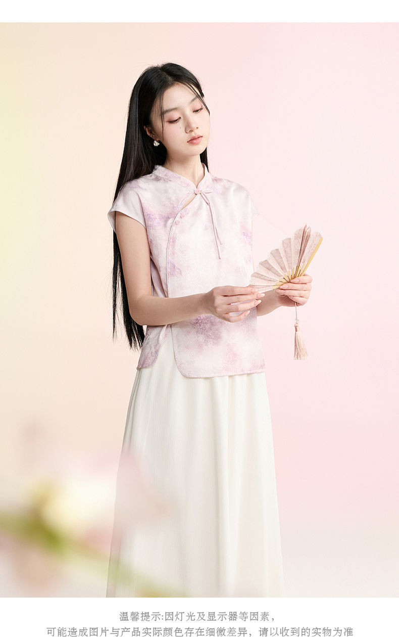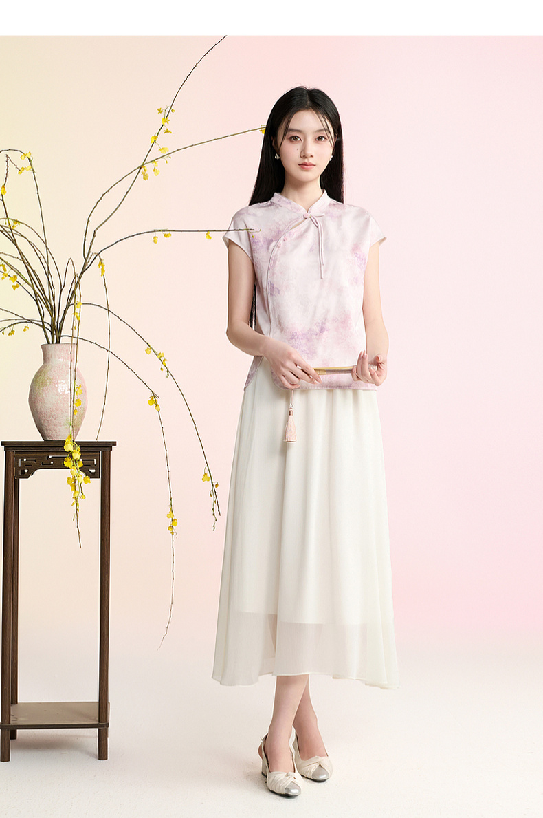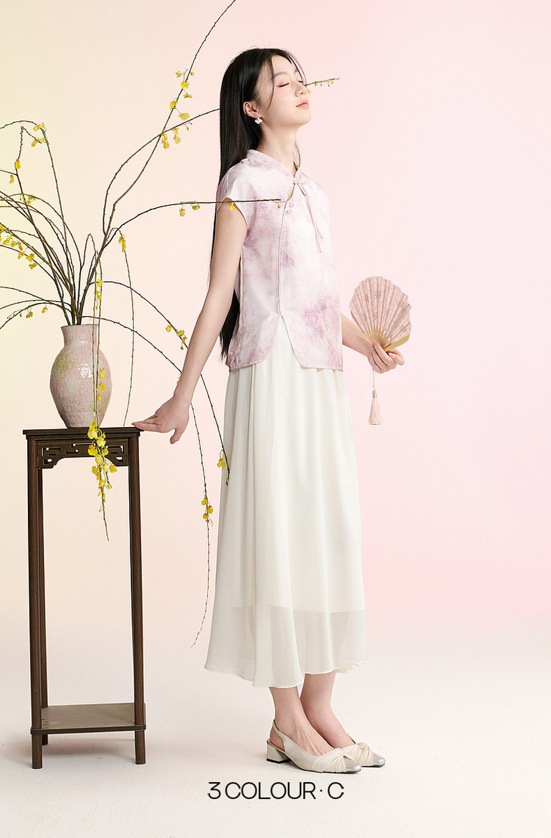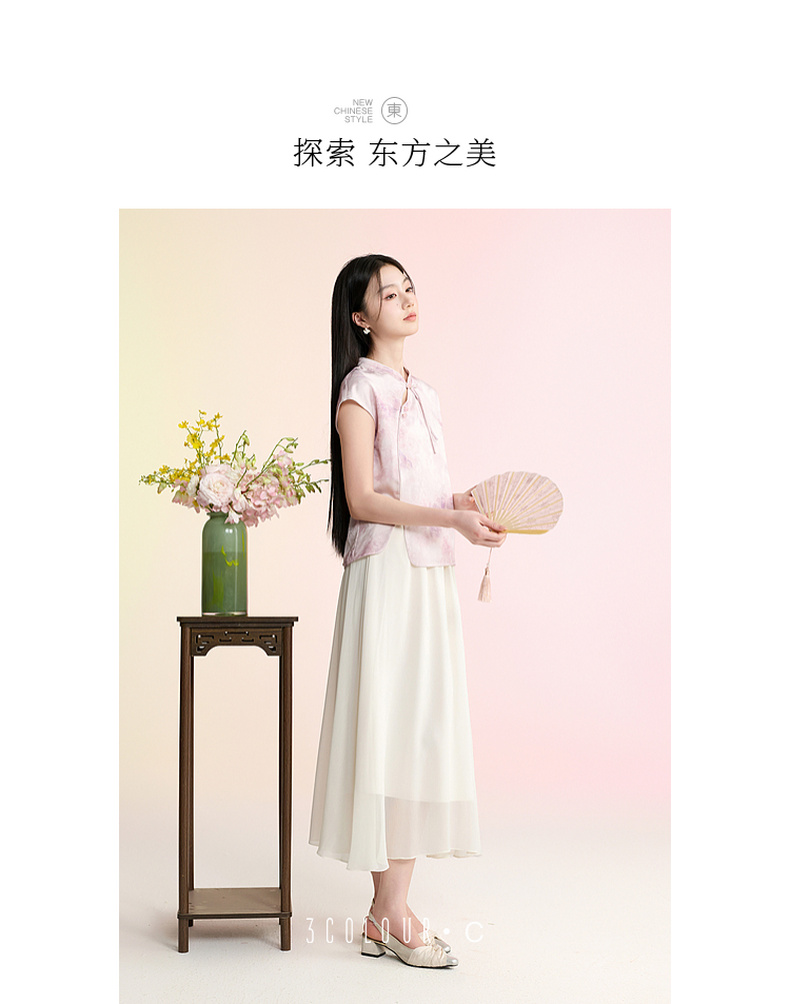 三彩【时夏有风】2026夏季新款新中式上衣雪纺长裙半身裙两件套C