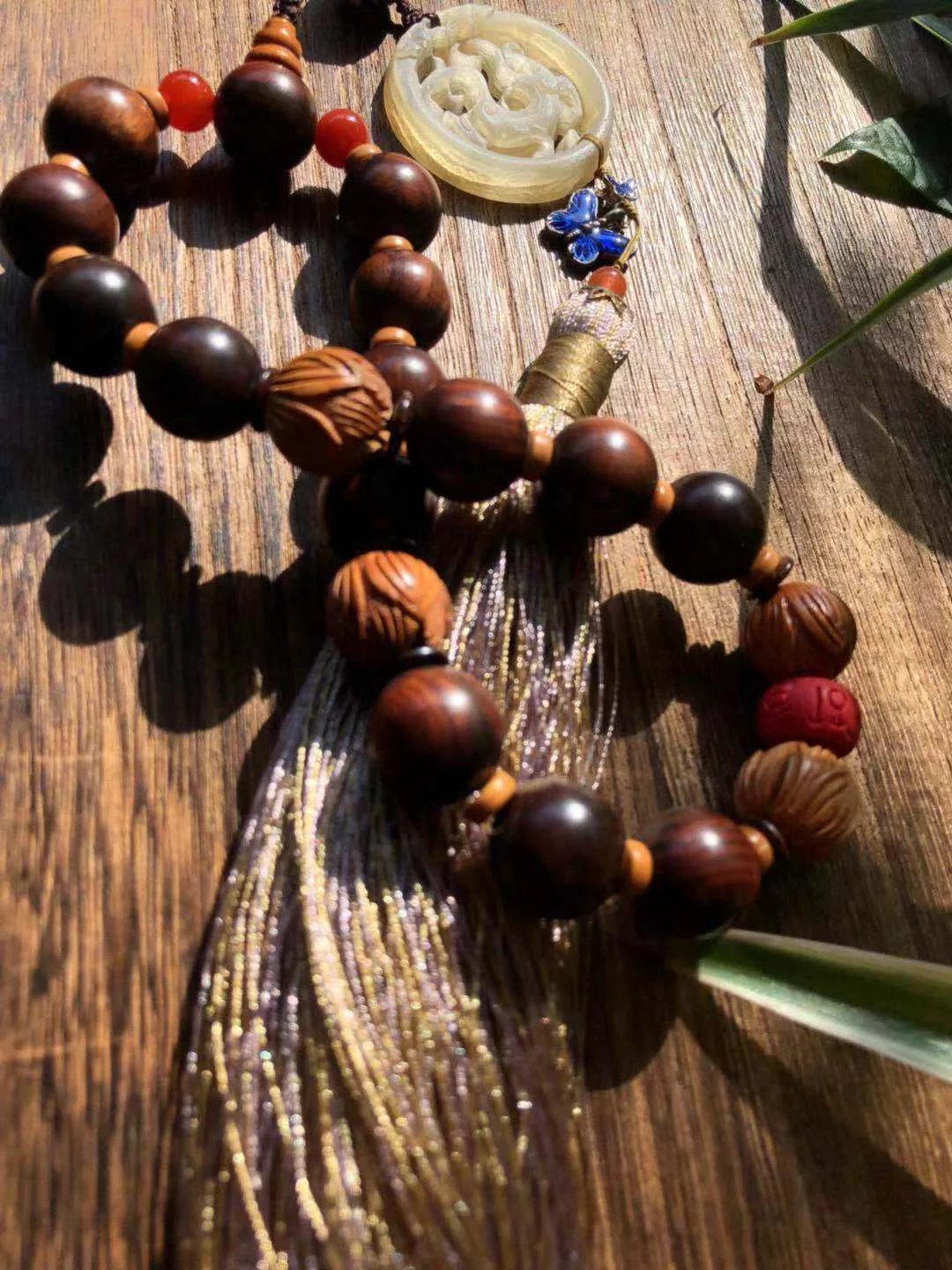 此款十八子由檀木为主珠,配以桃木莲花隔珠,顶部由六字朱砂相隔,三通处配以两颗天然红玛瑙。