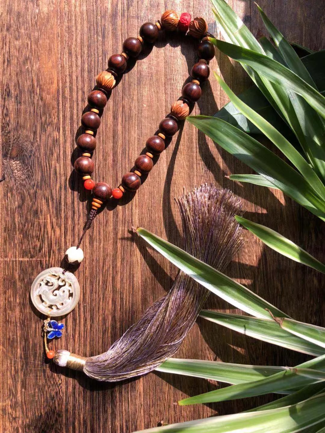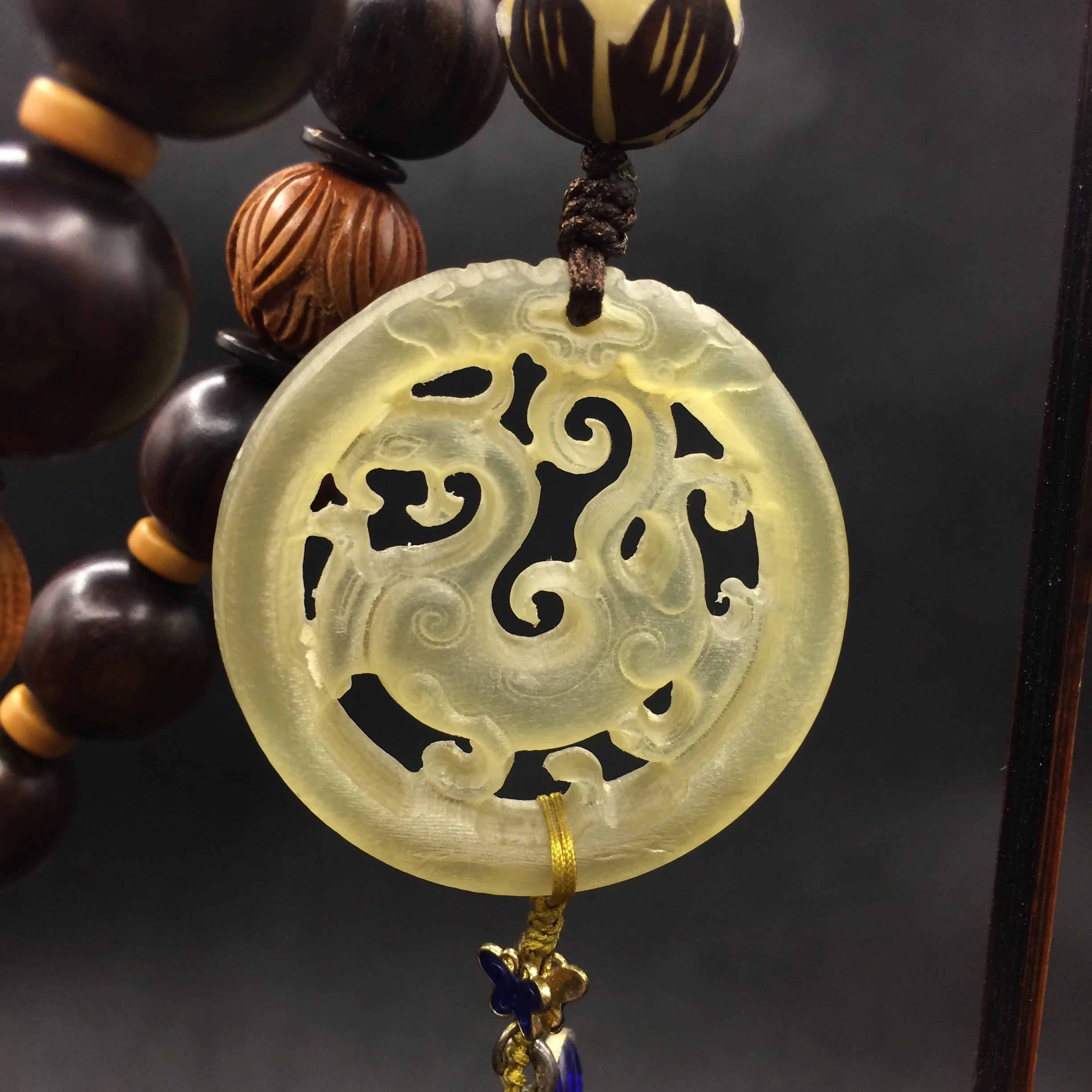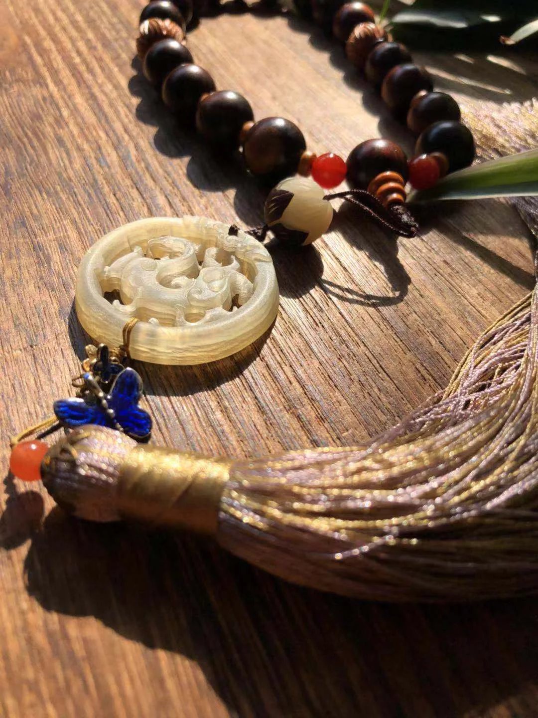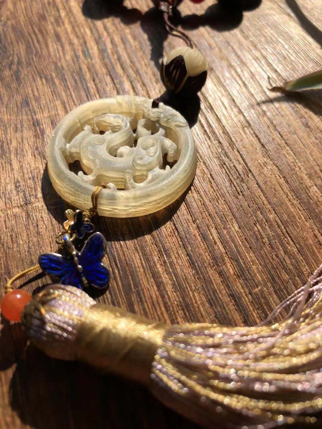 背云是此款车挂的主佩饰古龙牌,由天然羊角雕刻而成。龙牌上承天然菩提根莲花珠,下启景泰蓝蝴蝶佩饰。