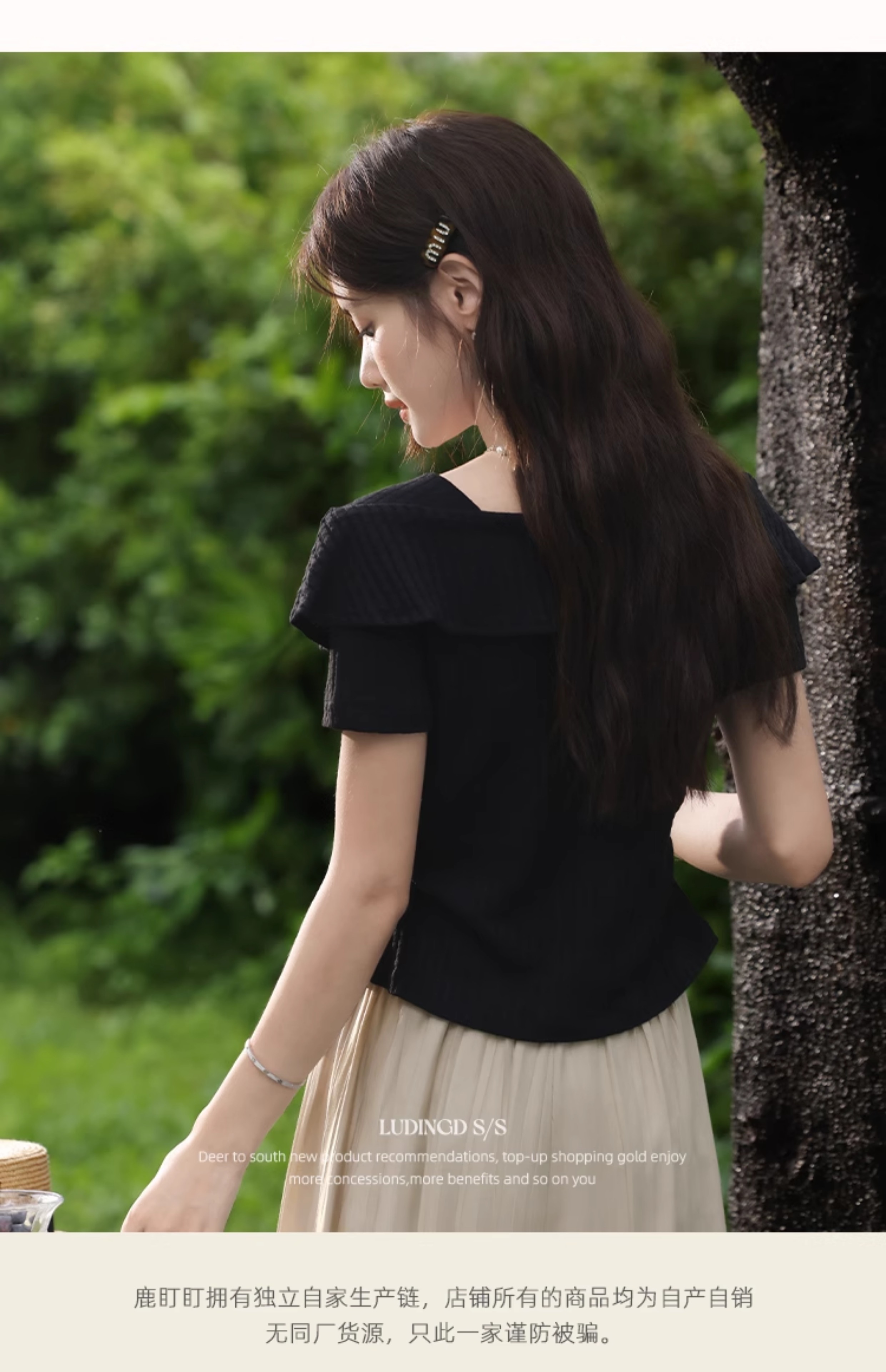 鹿向南漂亮独特气质荷叶边黑色T恤设计感收腰短袖法式上衣女夏季