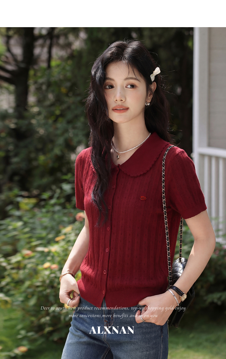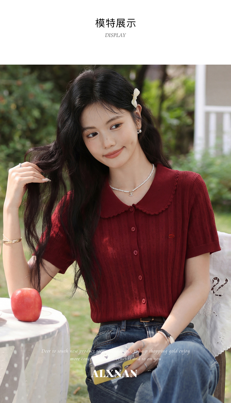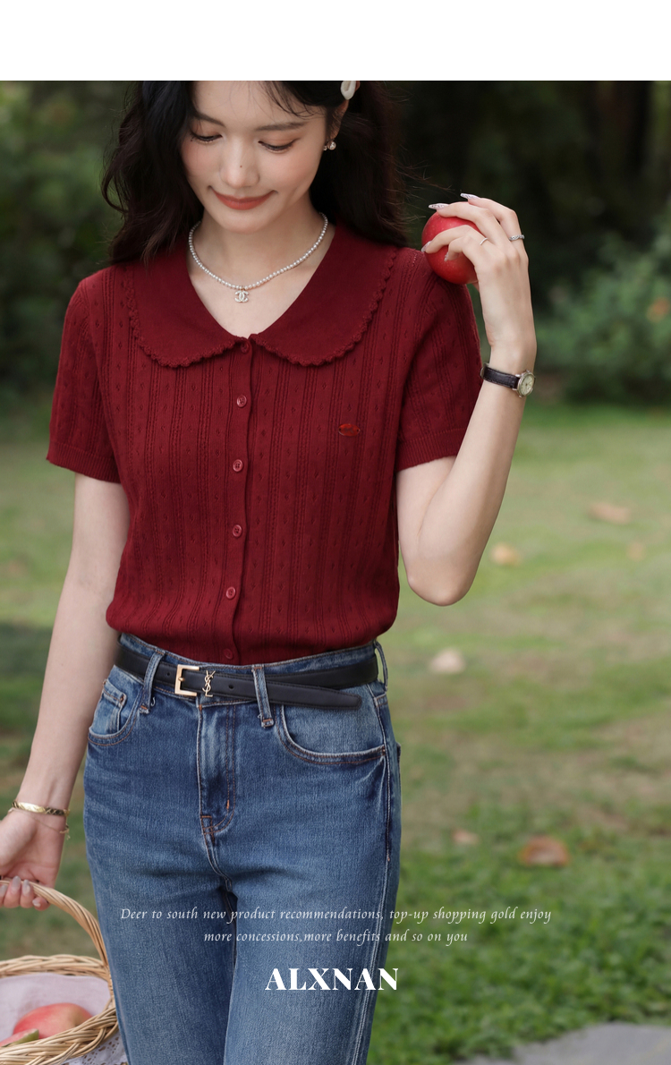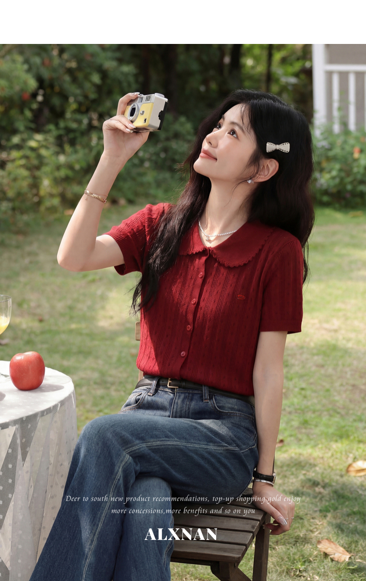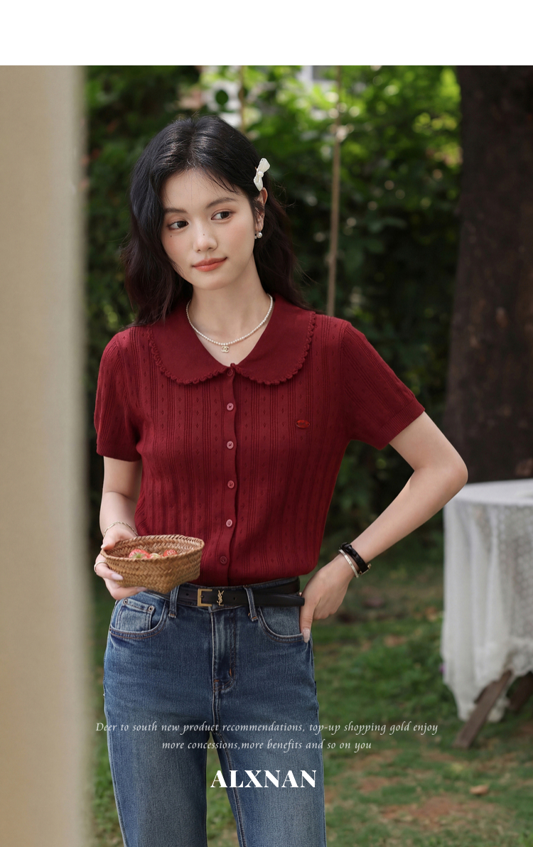 鹿向南「慕斯柔风」复古娃娃领红色针织衫短袖T恤女显瘦开衫上衣