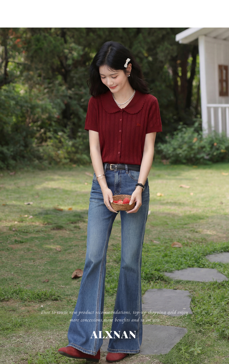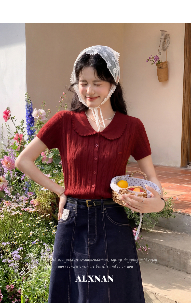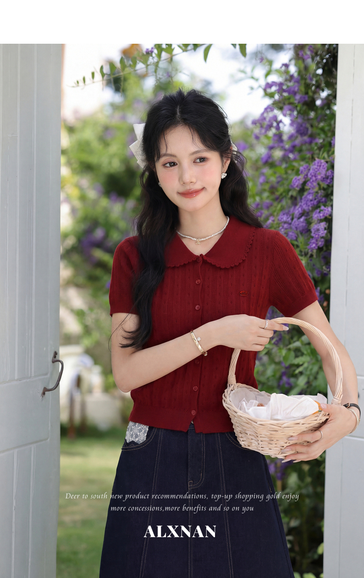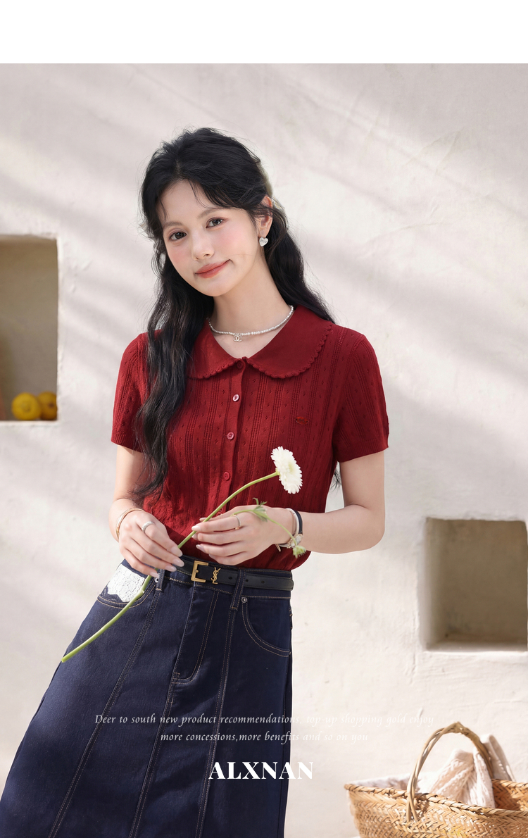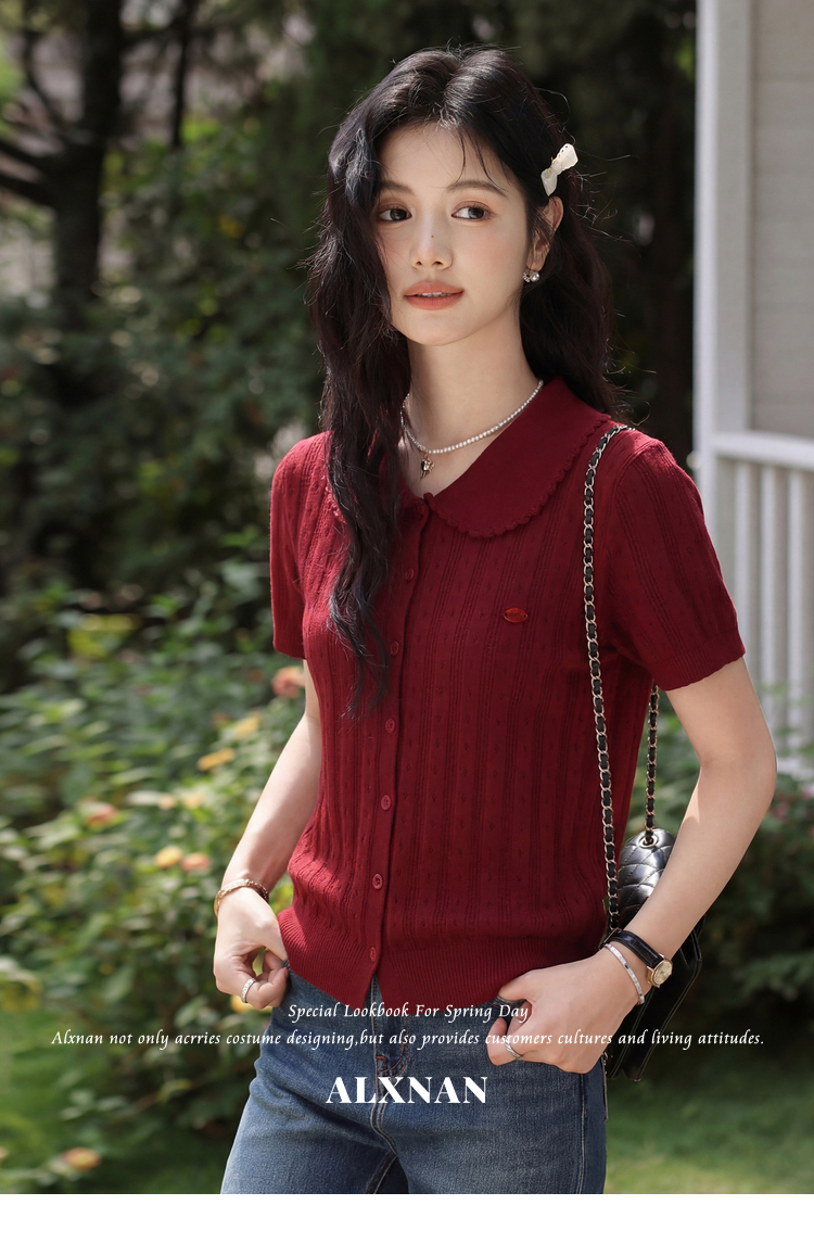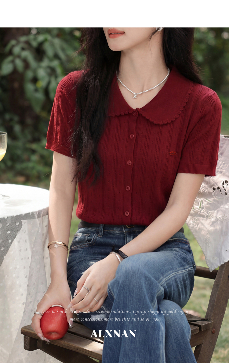鹿向南「慕斯柔风」复古娃娃领红色针织衫短袖T恤女显瘦开衫上衣