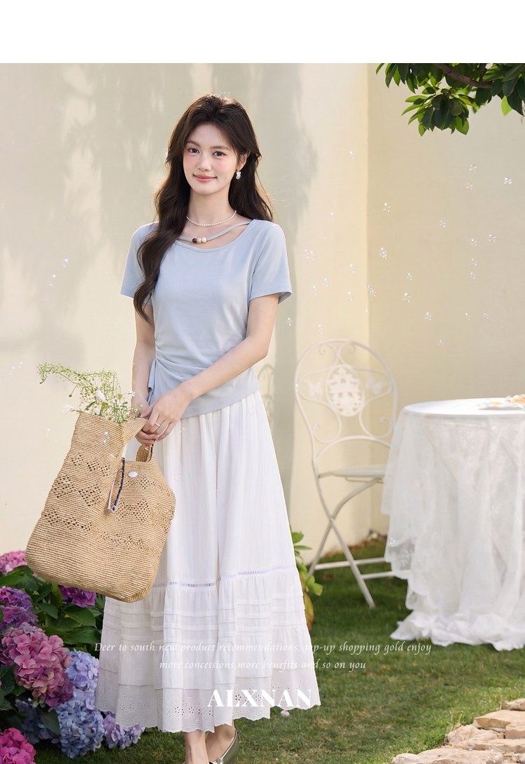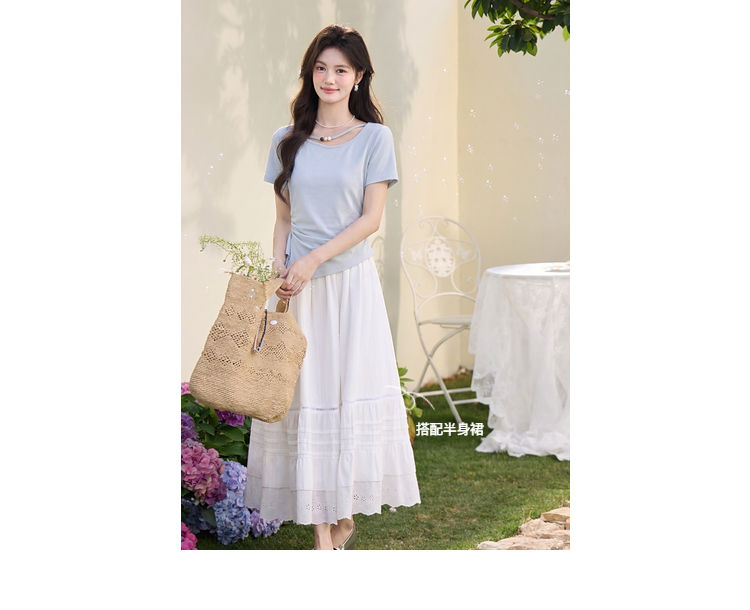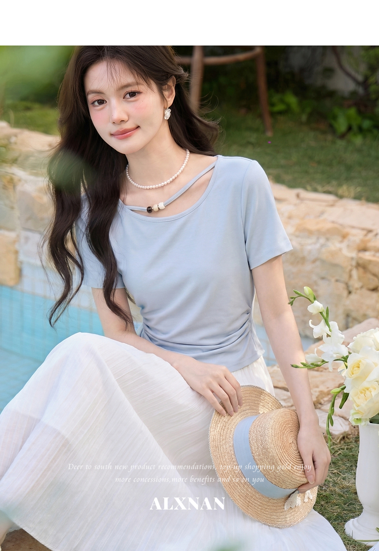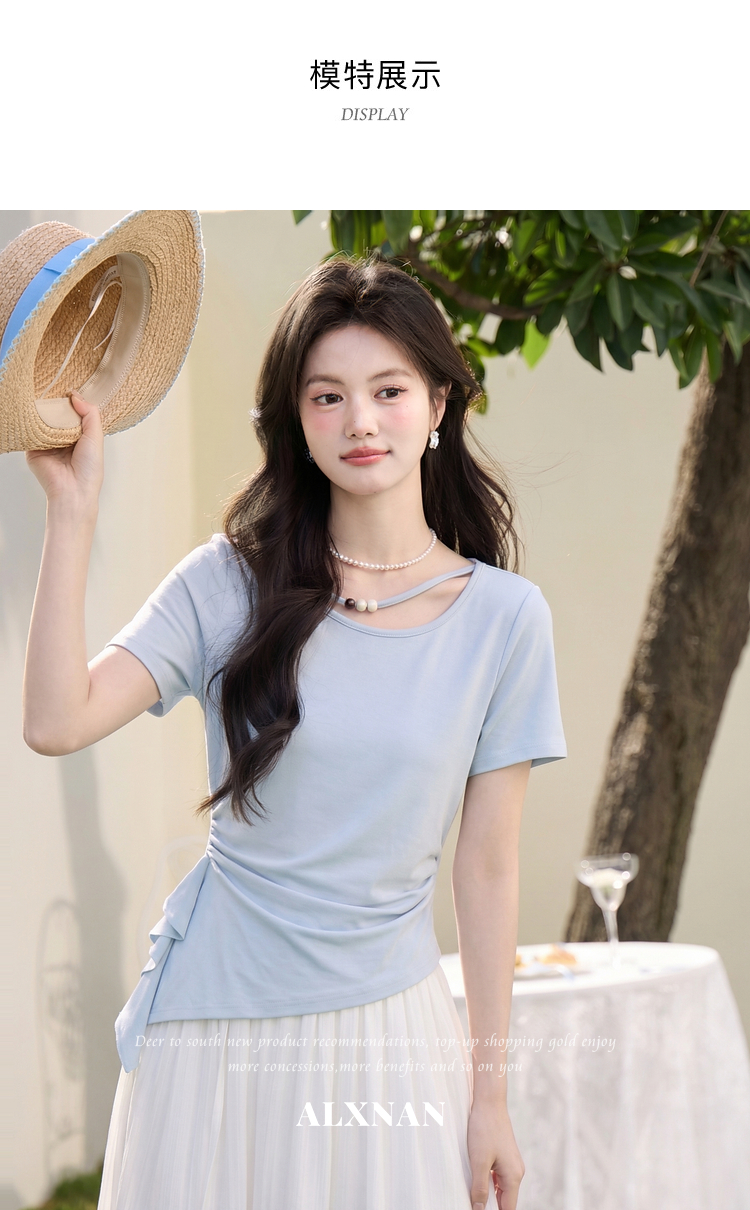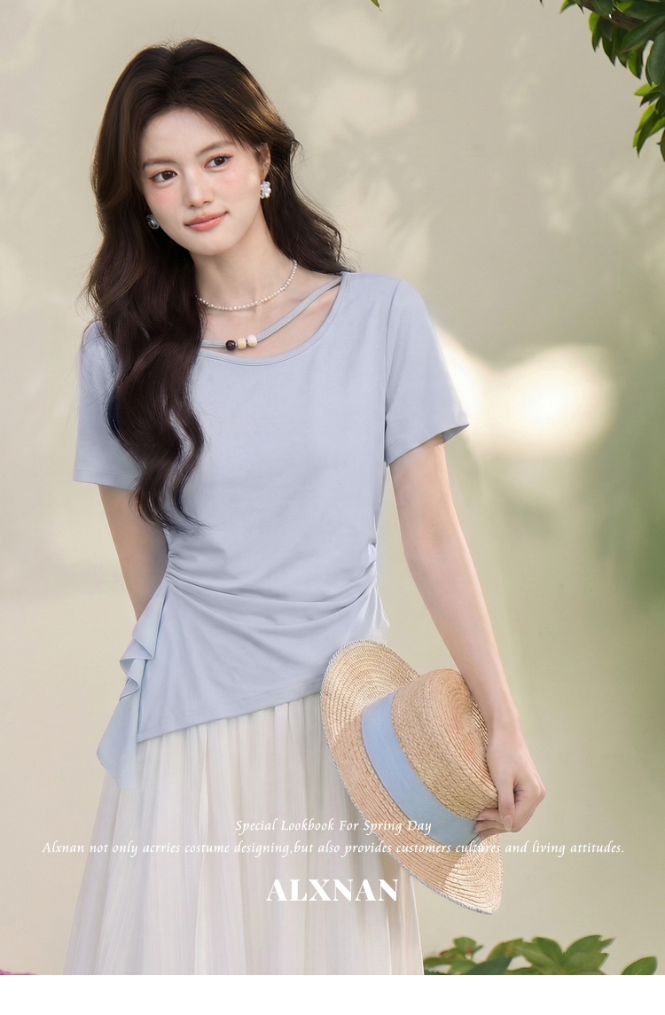 鹿向南「茉莉清晨」蓝色短袖T恤女夏季气质不规则掐腰修身小上衣