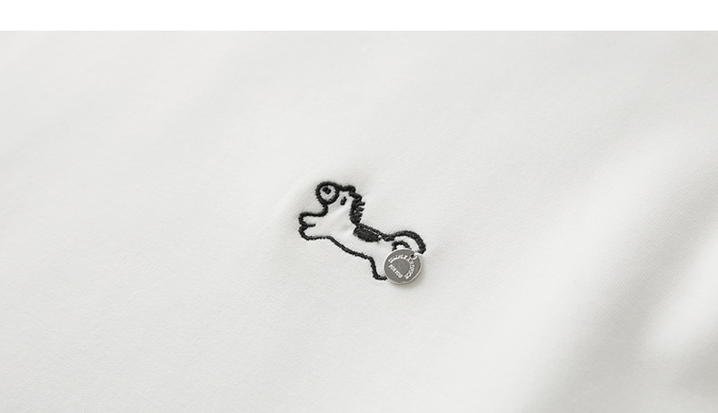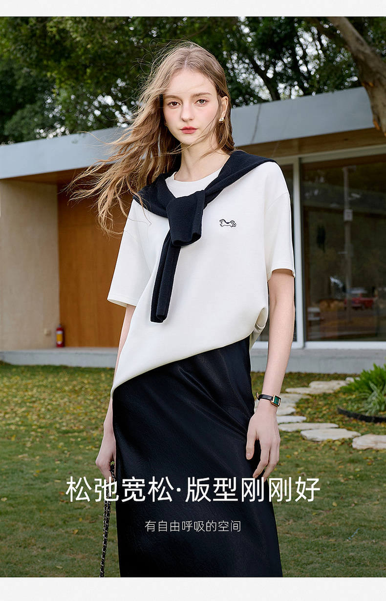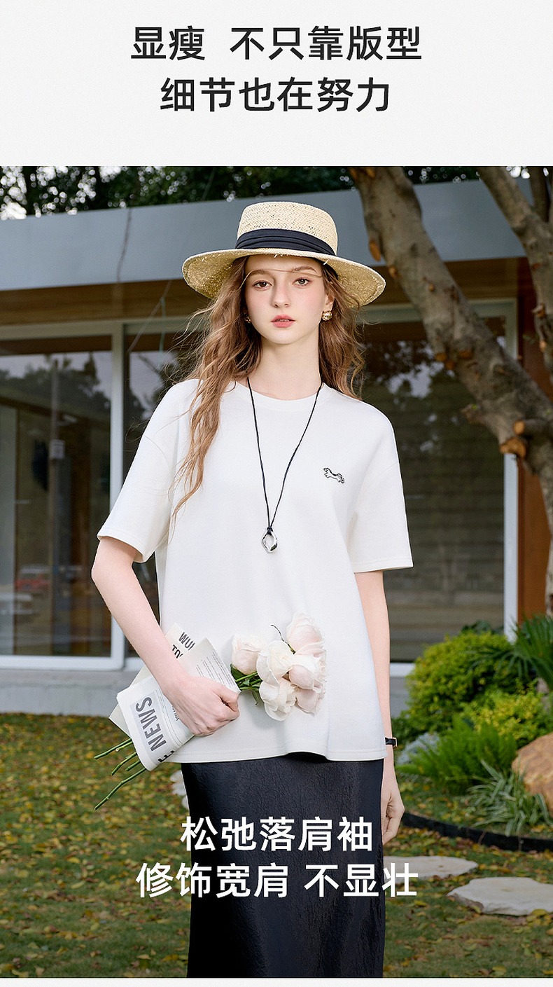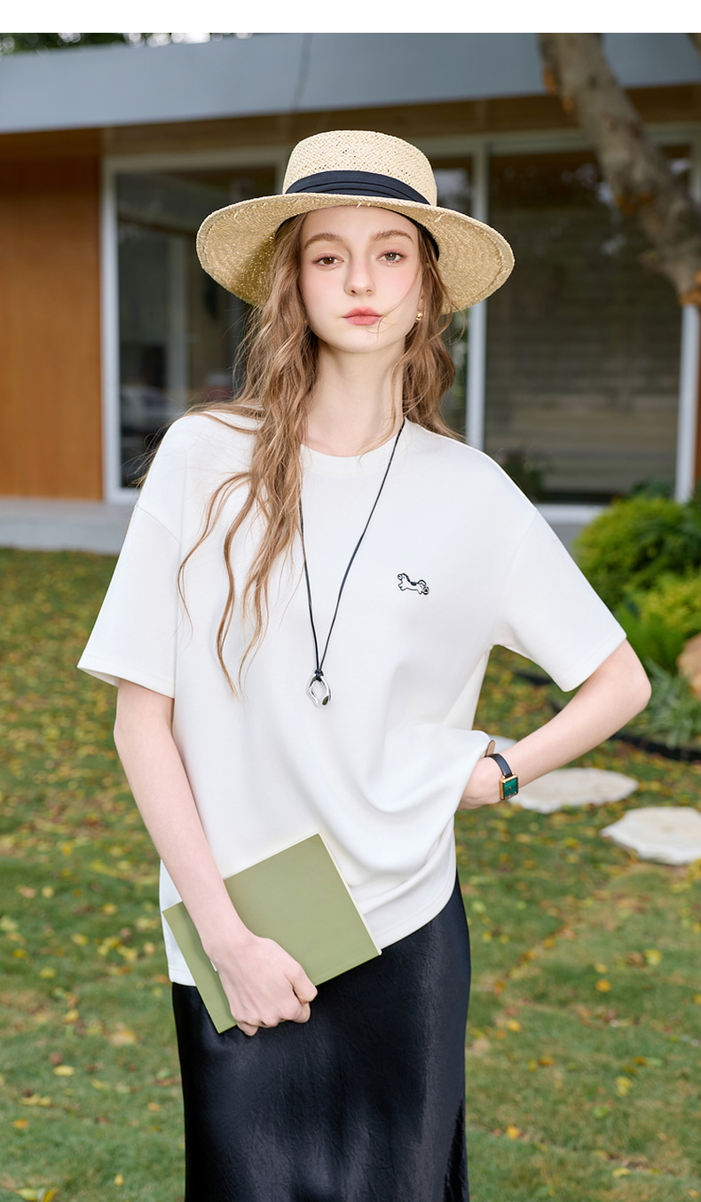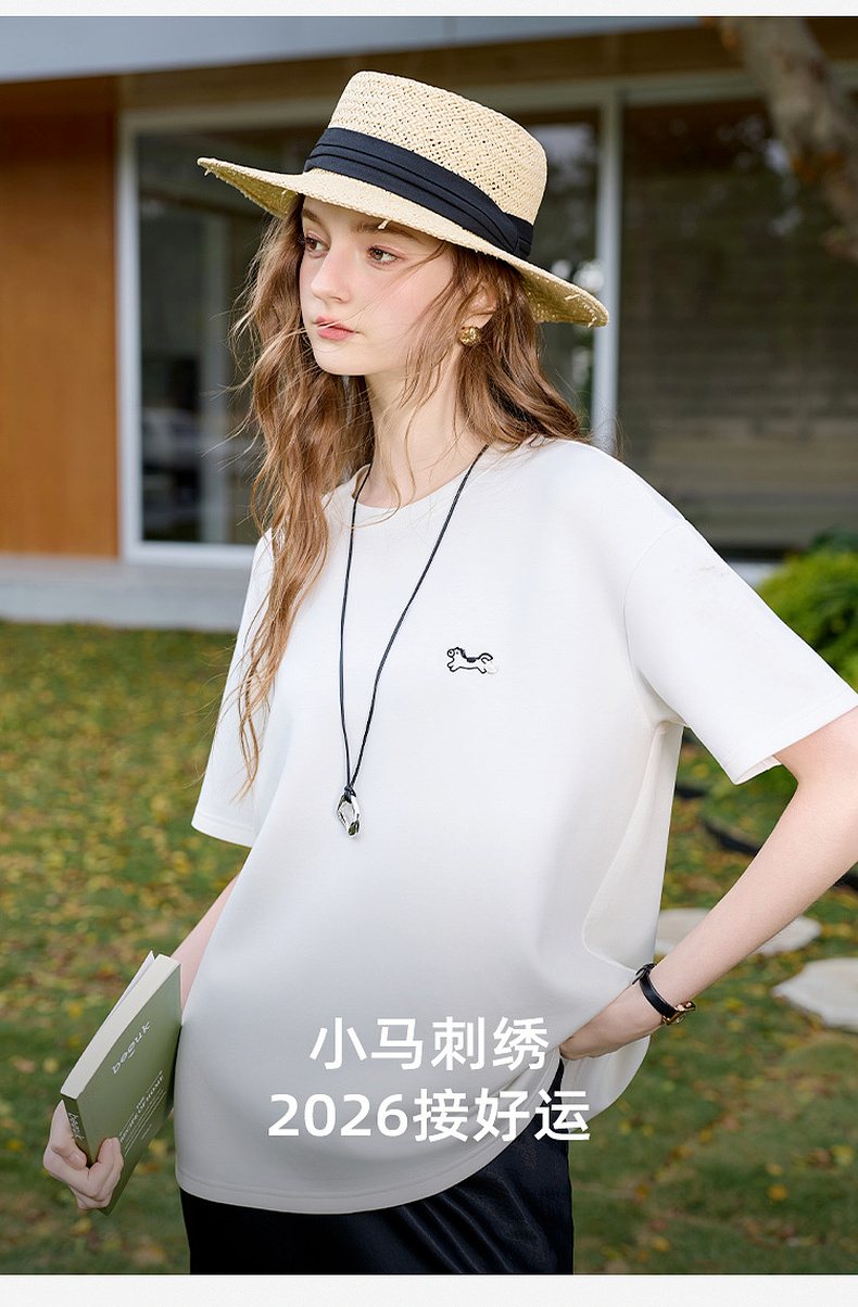 【莱赛尔】三彩2026春季新款短袖圆领宽松小马绣花T恤上衣套头衫M
