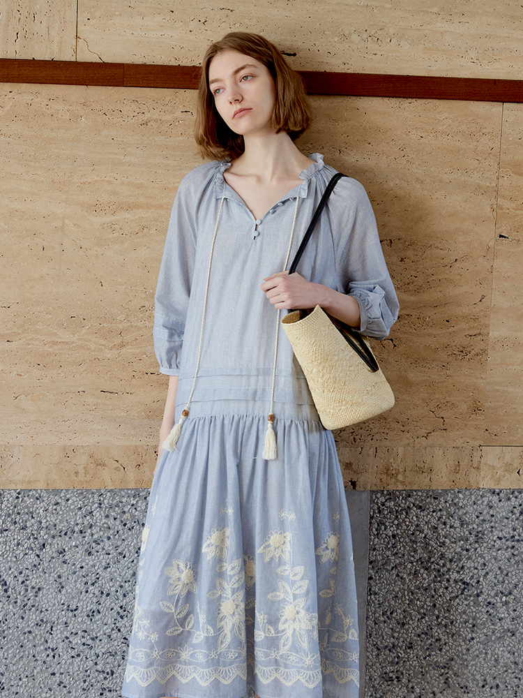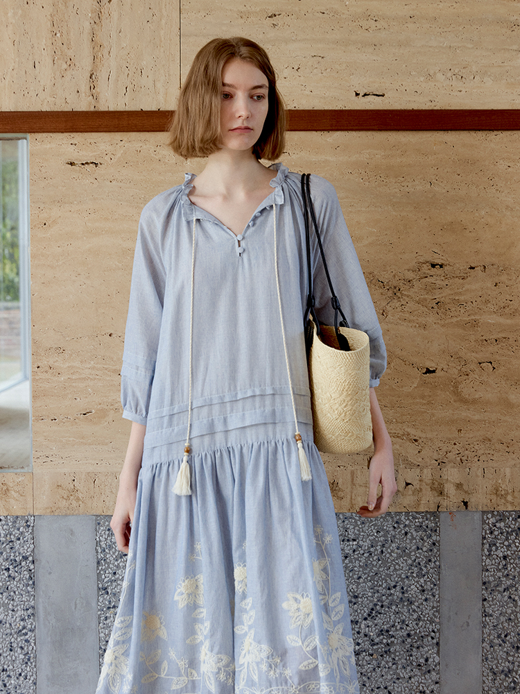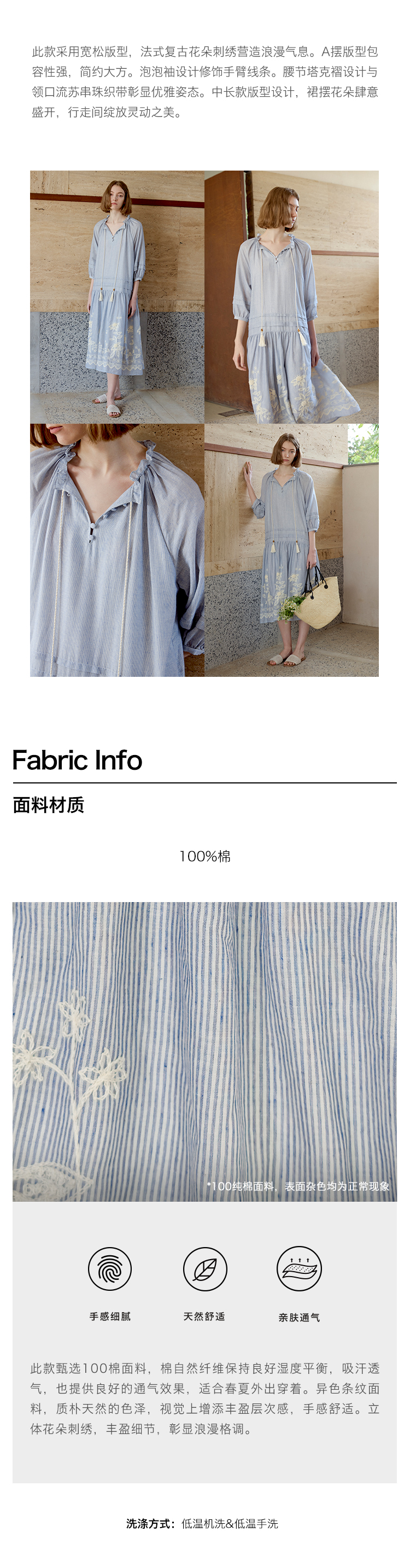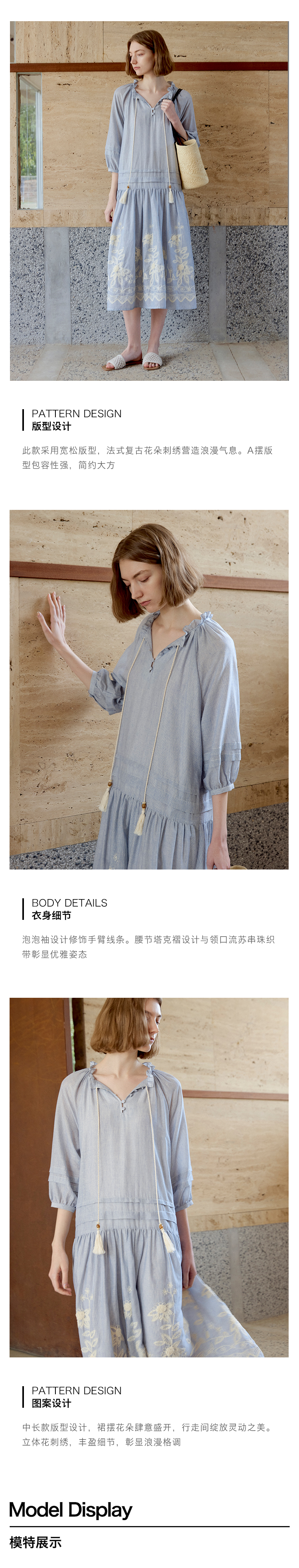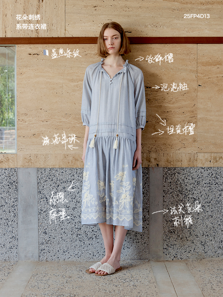 ForPoem 现货 25/SS原创设计100棉落肩泡泡袖花朵刺绣系带连衣裙