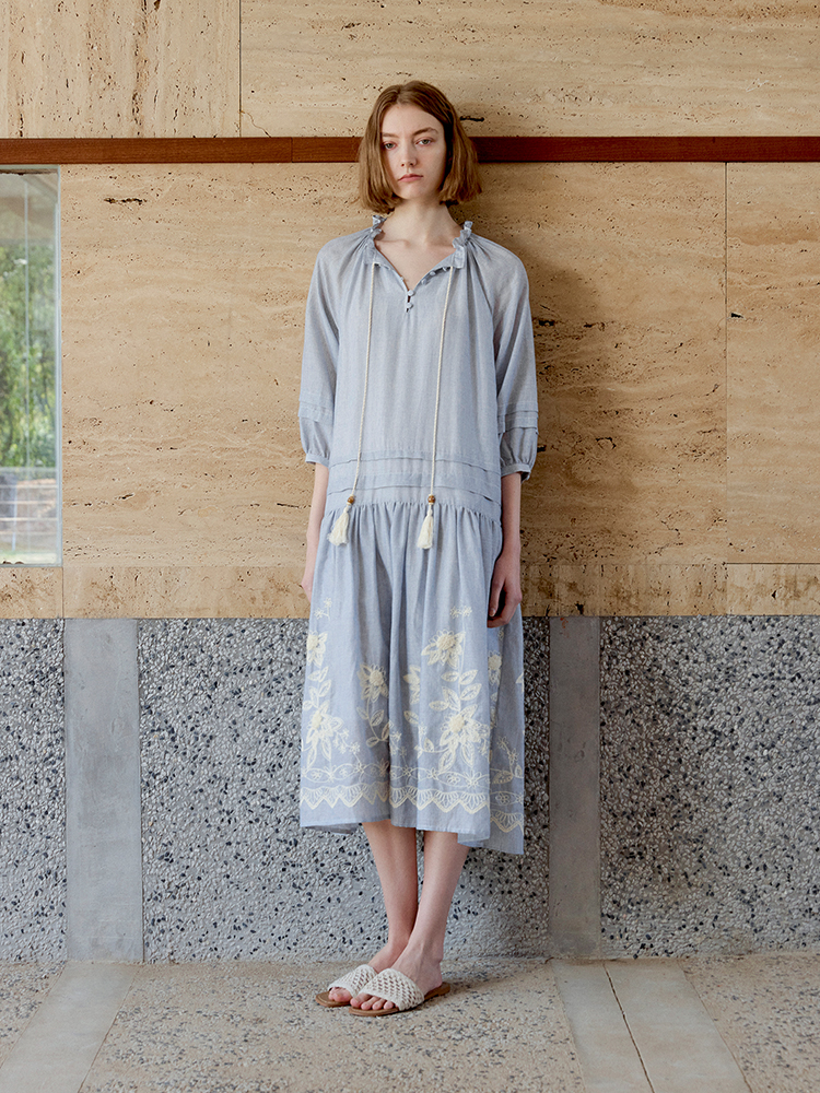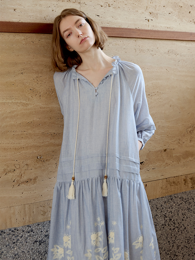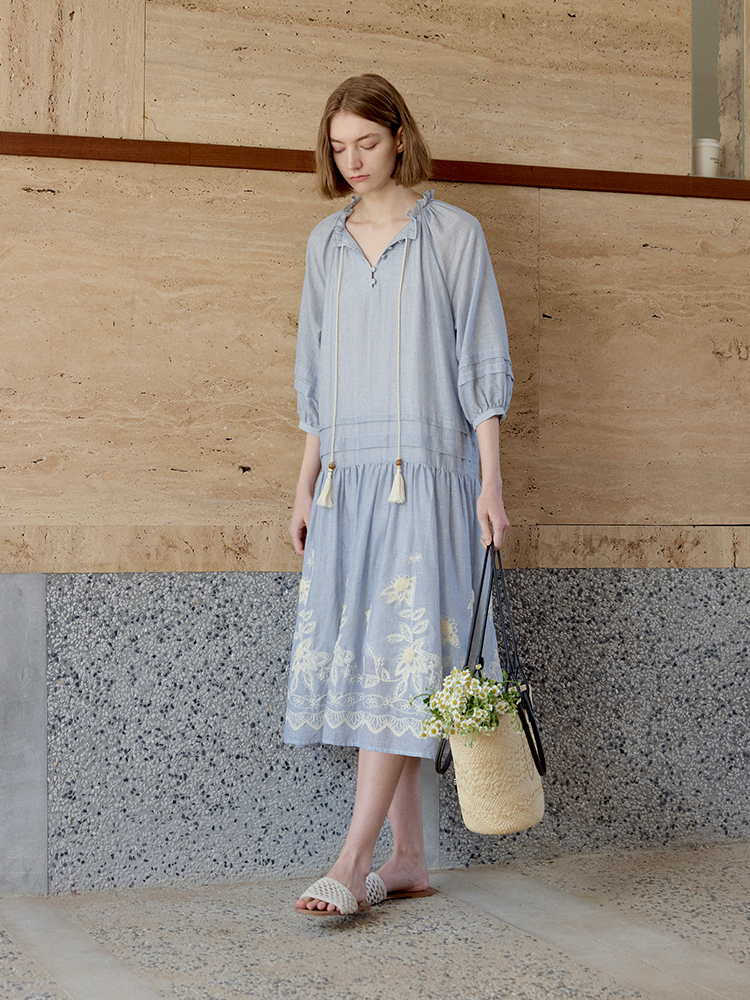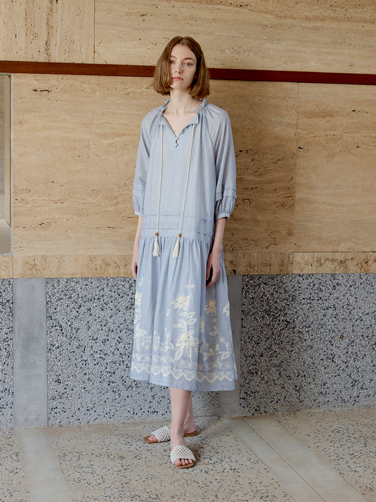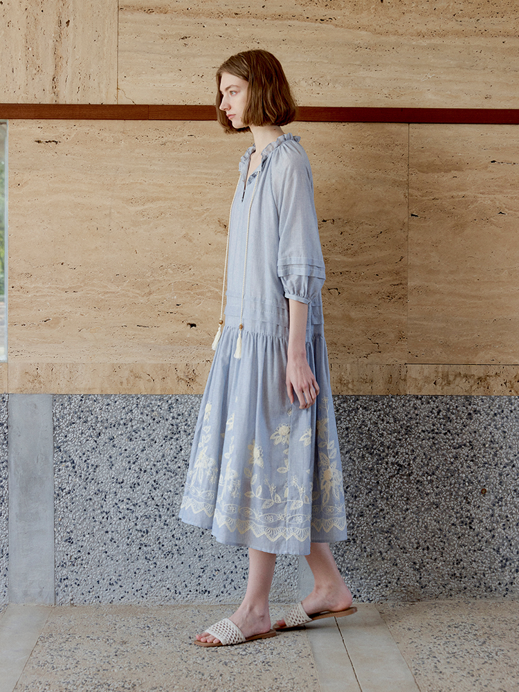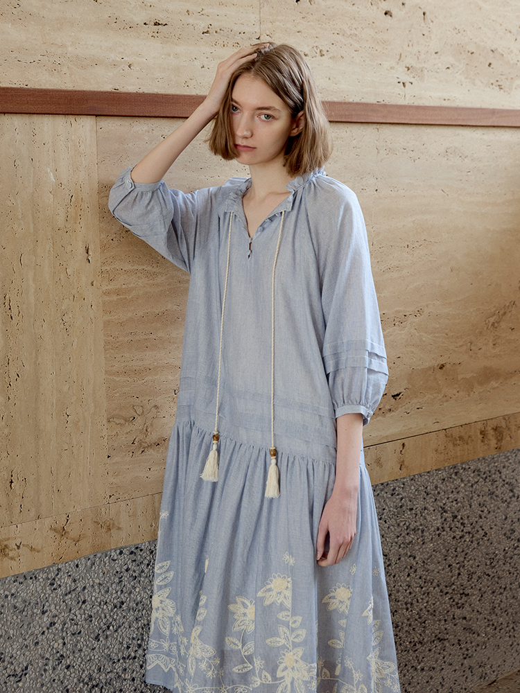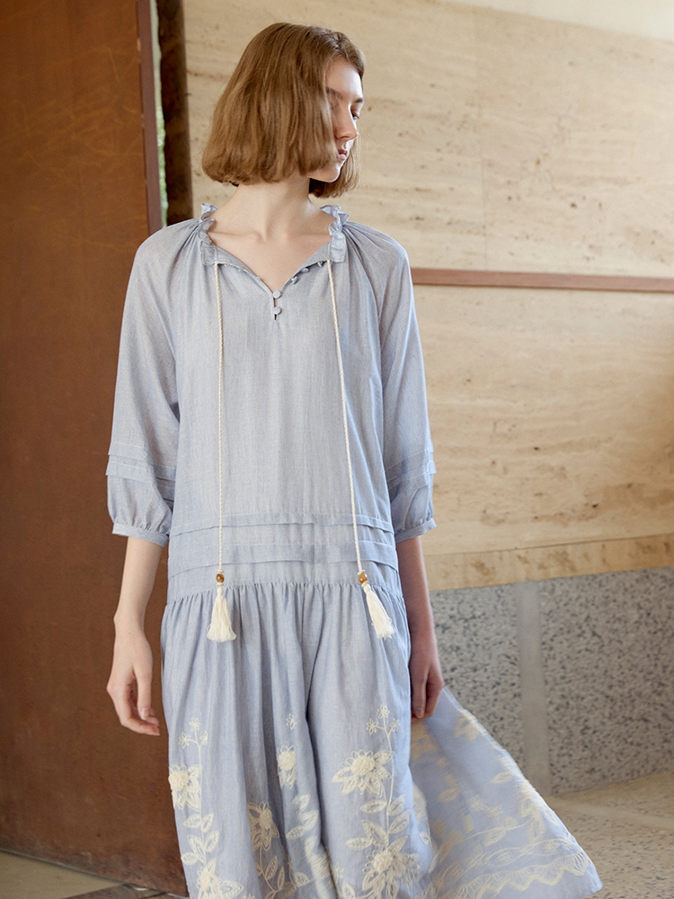 ForPoem 现货 25/SS原创设计100棉落肩泡泡袖花朵刺绣系带连衣裙