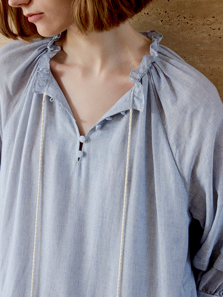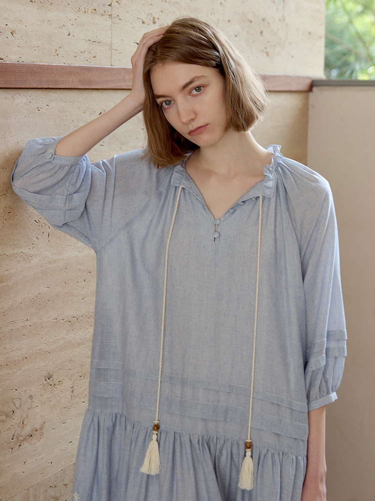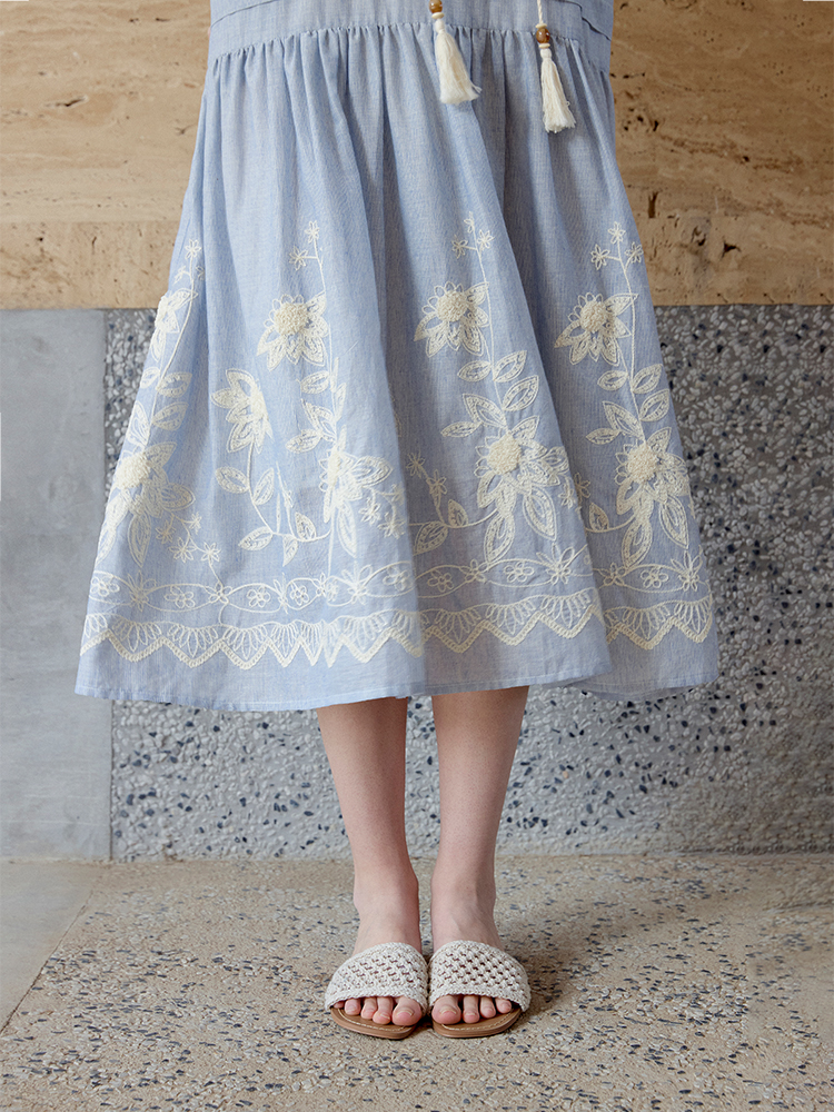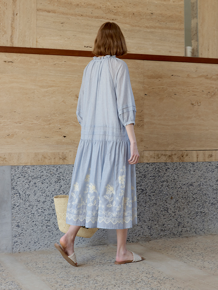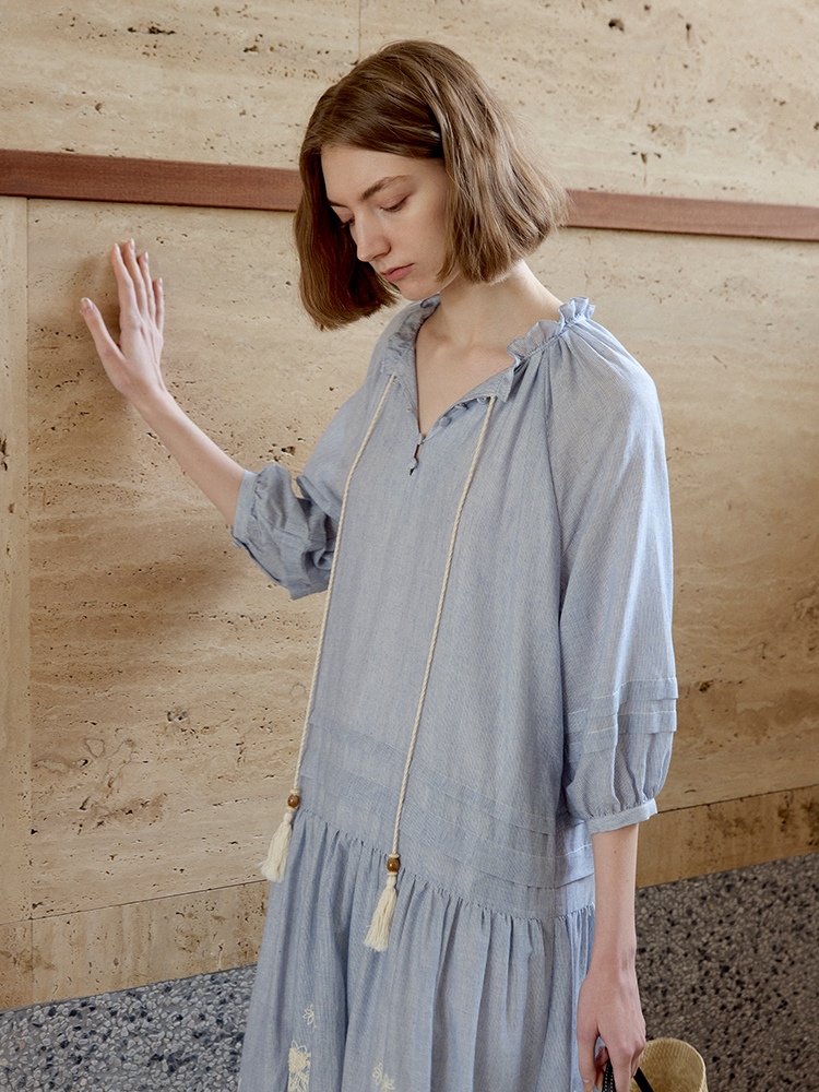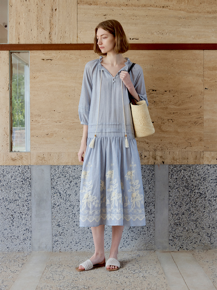 ForPoem 现货 25/SS原创设计100棉落肩泡泡袖花朵刺绣系带连衣裙