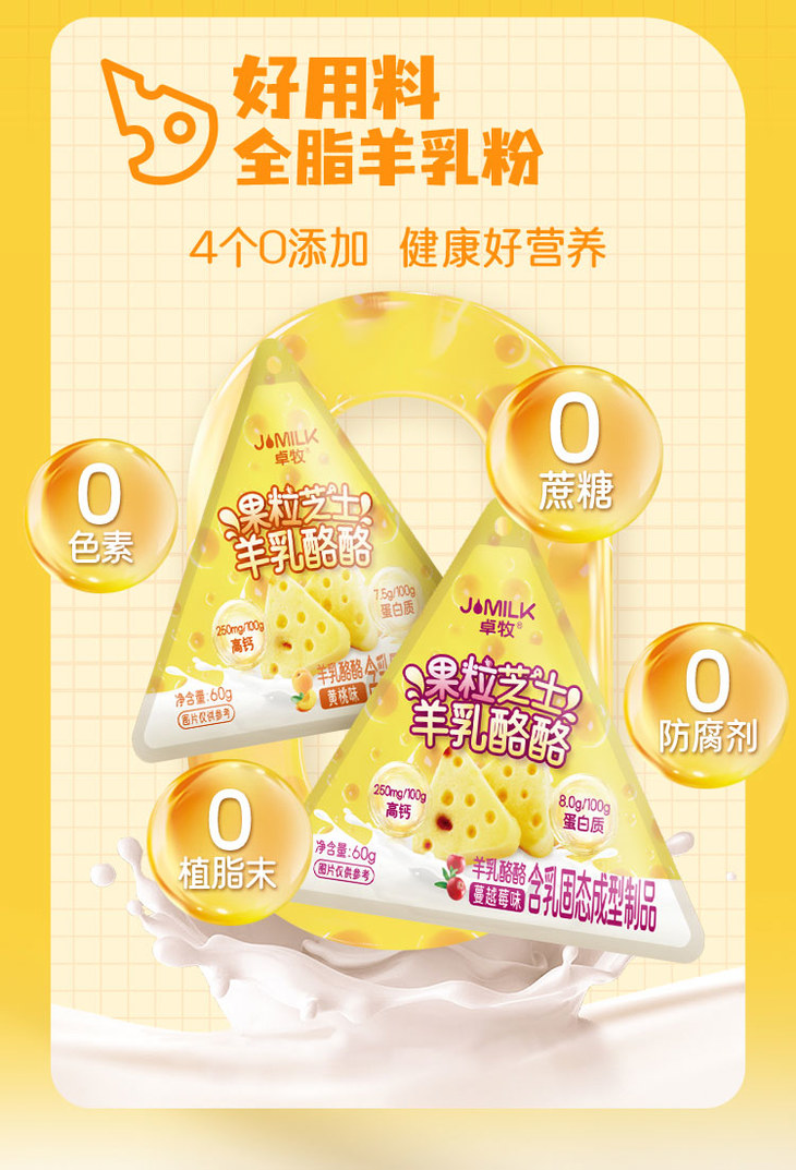 高钙羊乳乳酪!卓牧(JOMILK)高钙果粒芝士羊乳奶酪酪 儿童健康零食 三角芝士酪酪 60g/袋