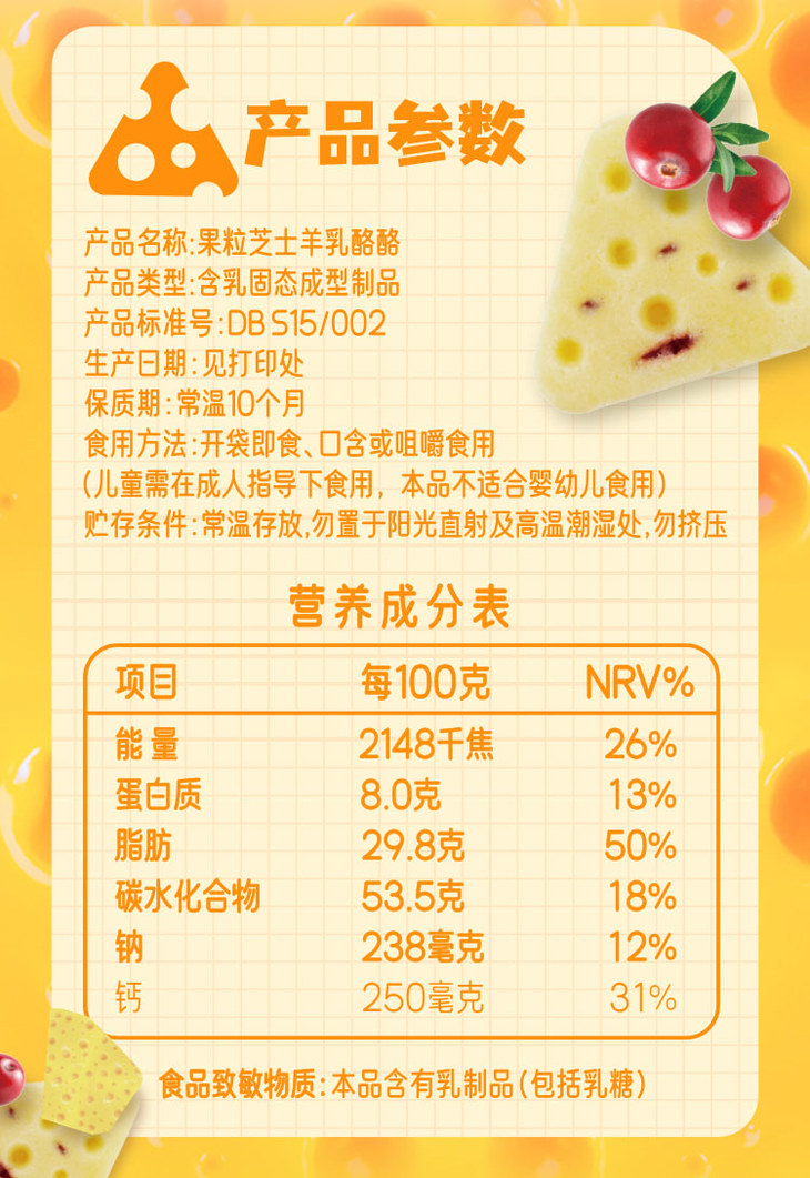【配料表】全脂乳粉、含乳食品基料粉(生牛乳、葡萄糖浆、植物油、全脂乳粉)、低聚异麦芽糖、海藻糖、奶油、纯牛奶、蔓越莓果粒、全脂羊乳粉、干酪粉