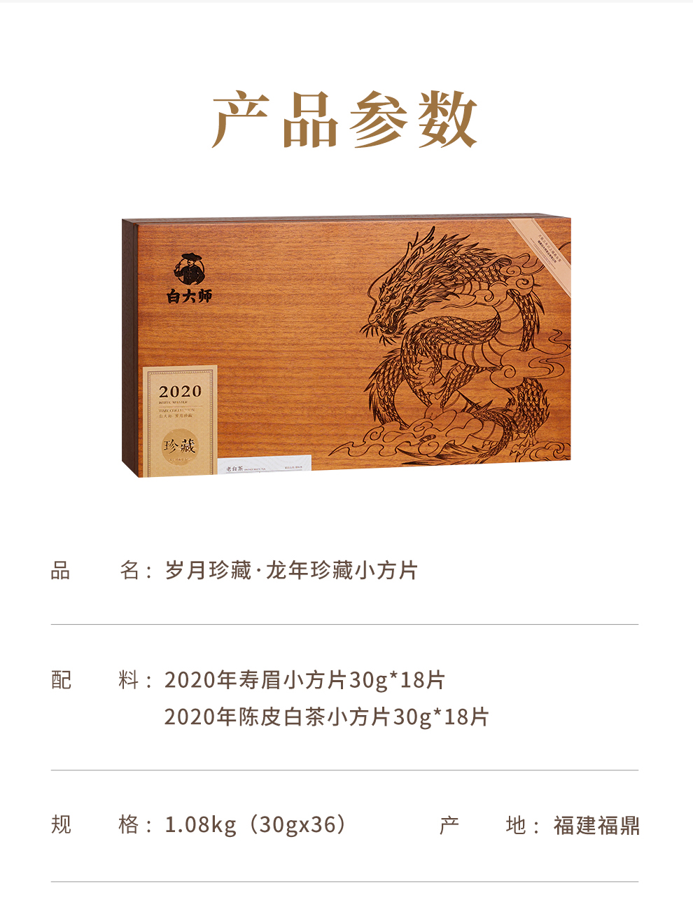 白大师正宗高山福鼎白茶2020年一级寿眉陈皮白茶礼盒小方片36片装