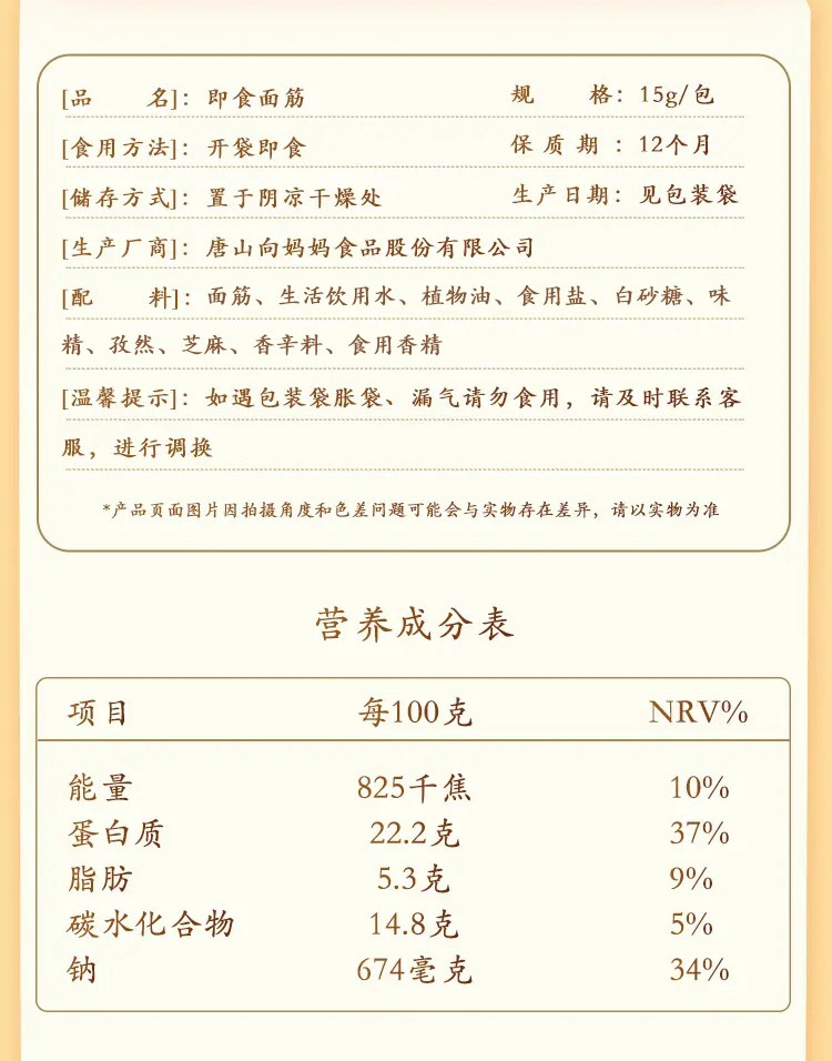 【品名】向妈妈即食面筋 【规格】15g/包 【生产日期】新日期 【保质期】1年 【产地】河北唐山 【发货地|快递】河北唐山|中通 【不发货地区】港澳台、新疆、西藏及偏远地区不发货 【发货时间】下单后72小时内发货