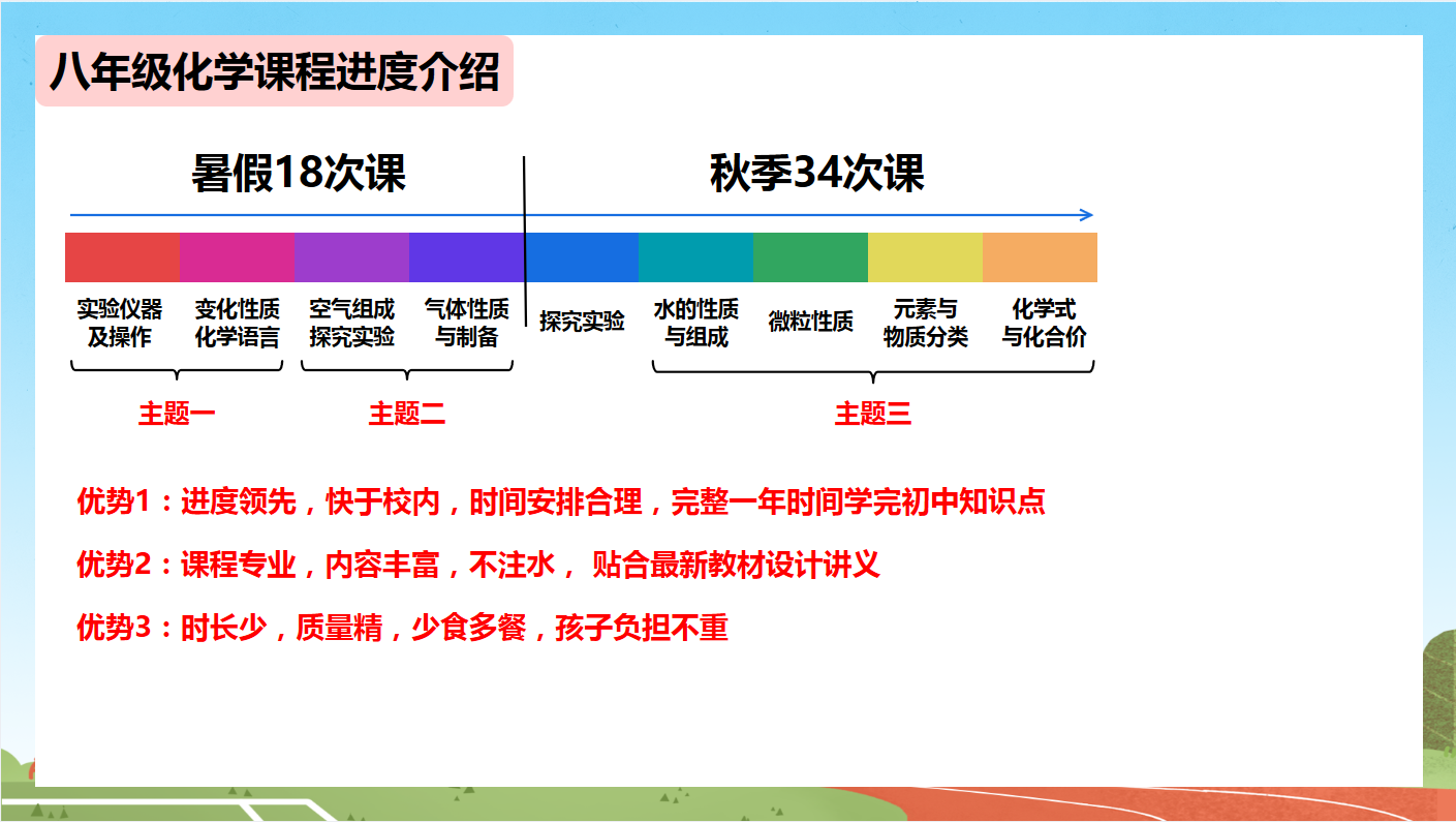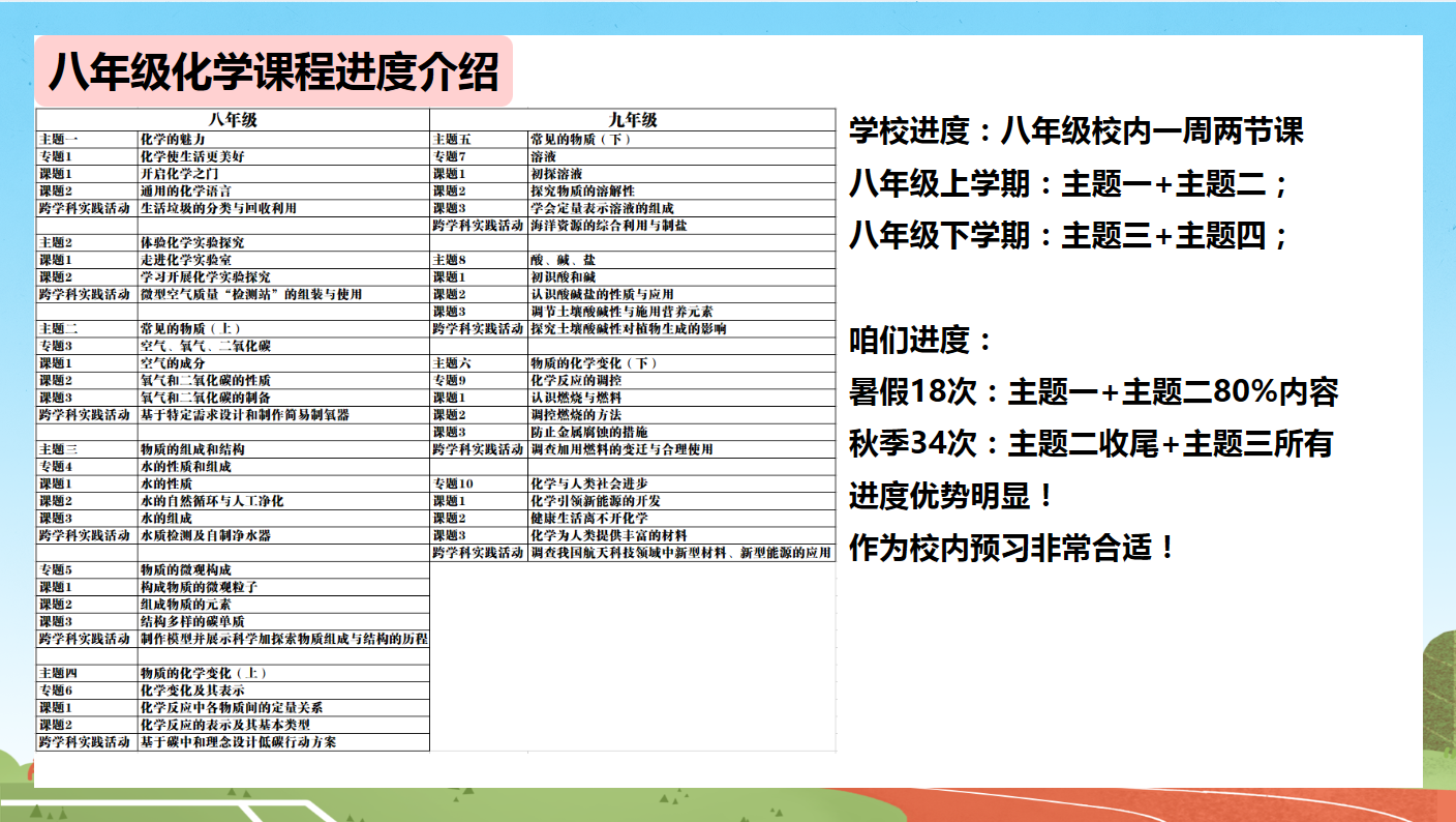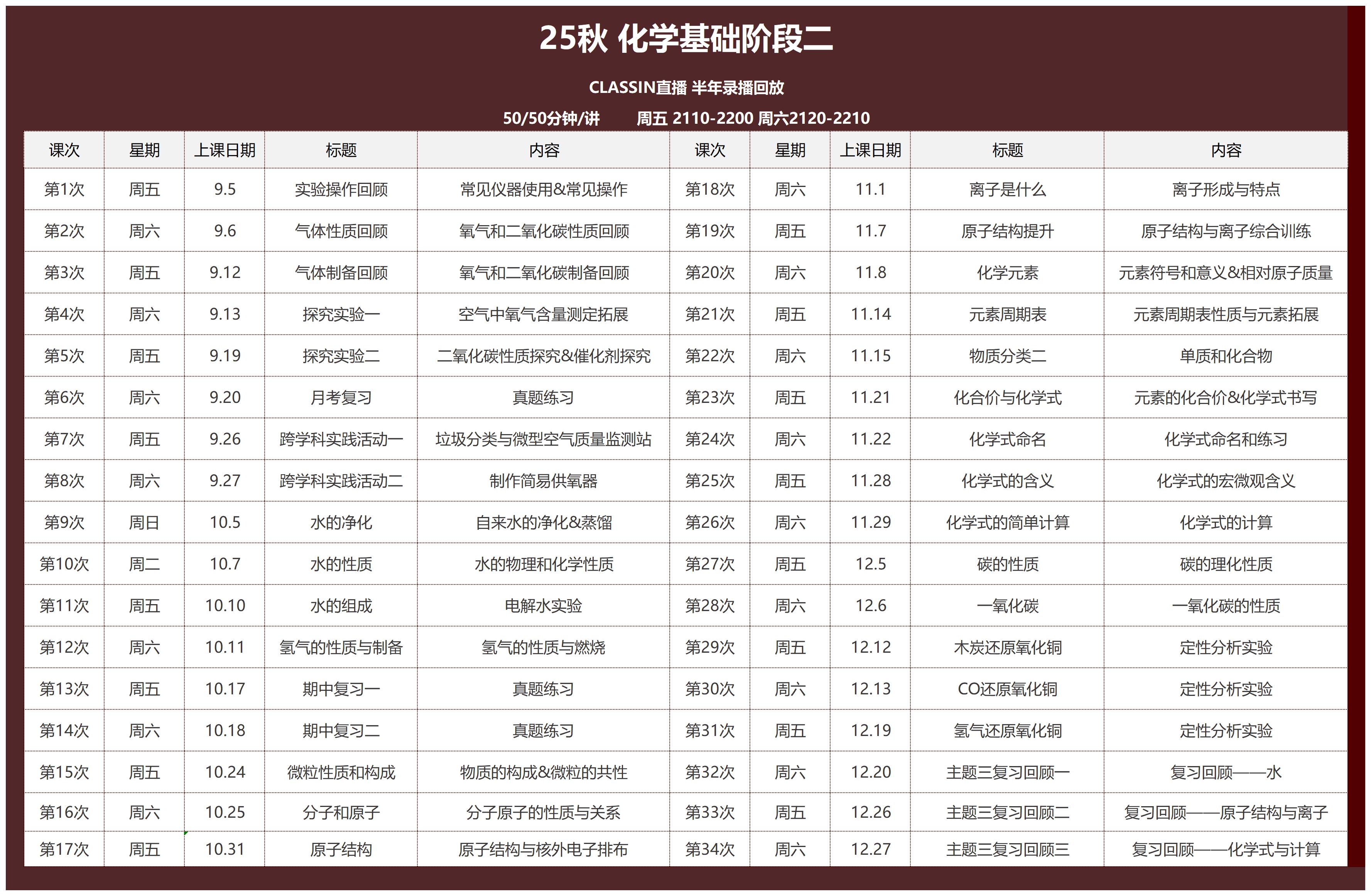 从暑假开始分4期(一年左右)学完整个初中化学基础课。