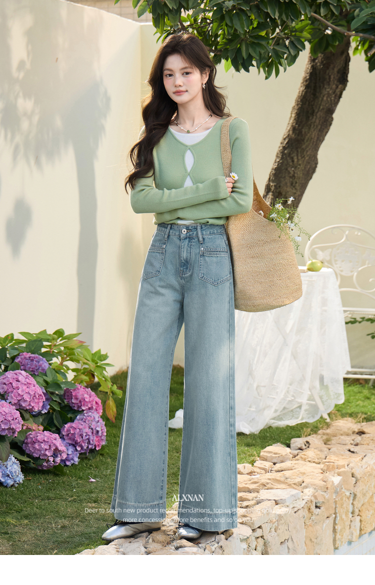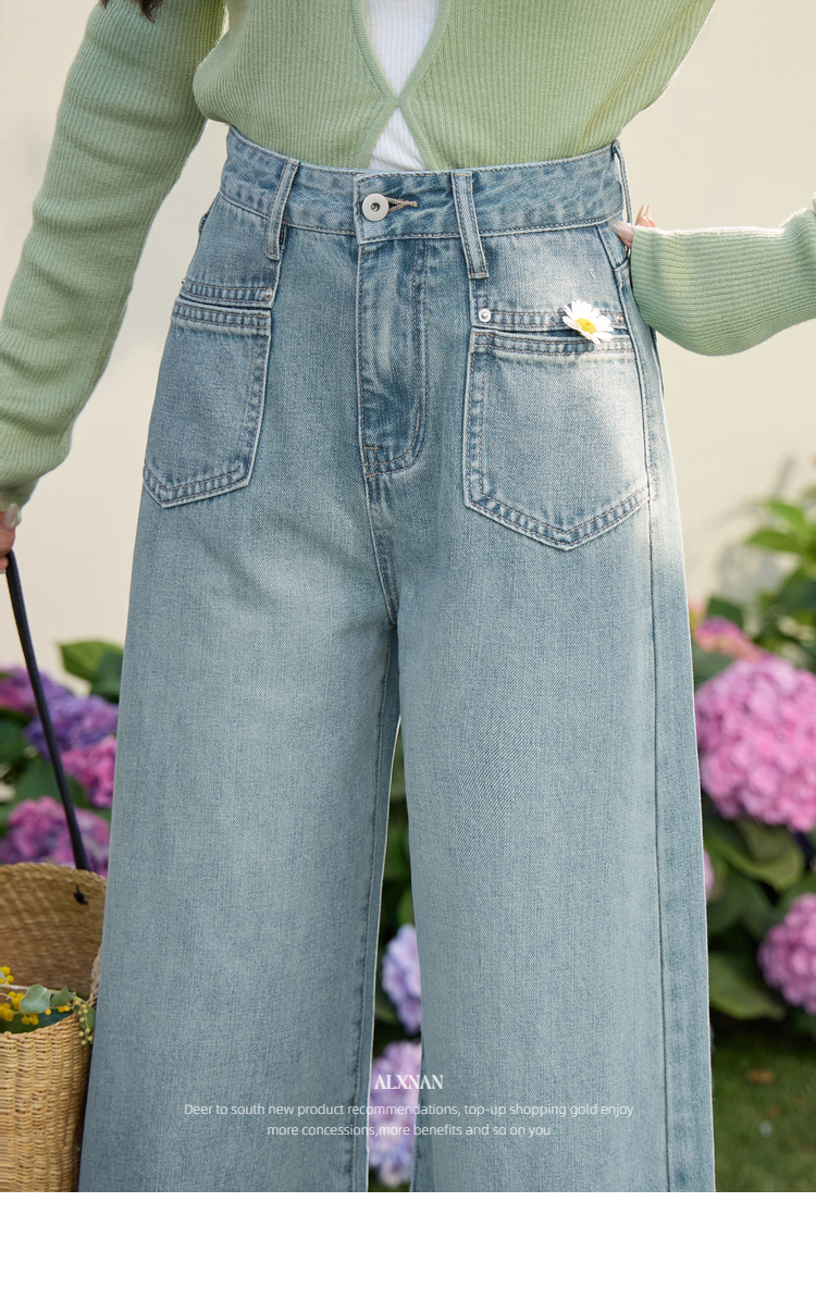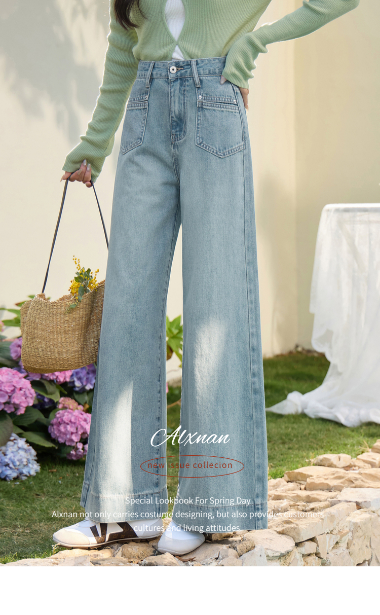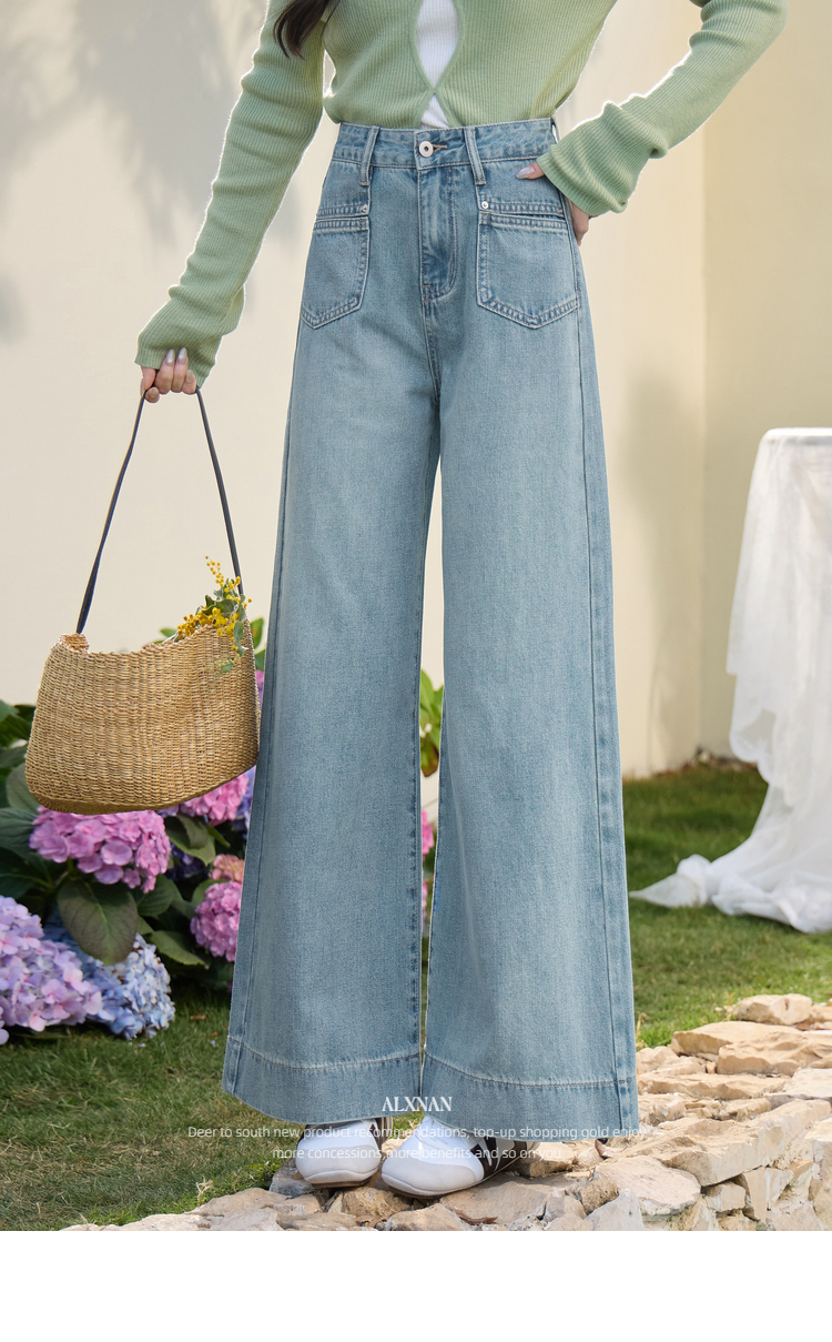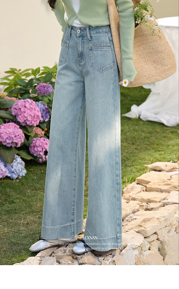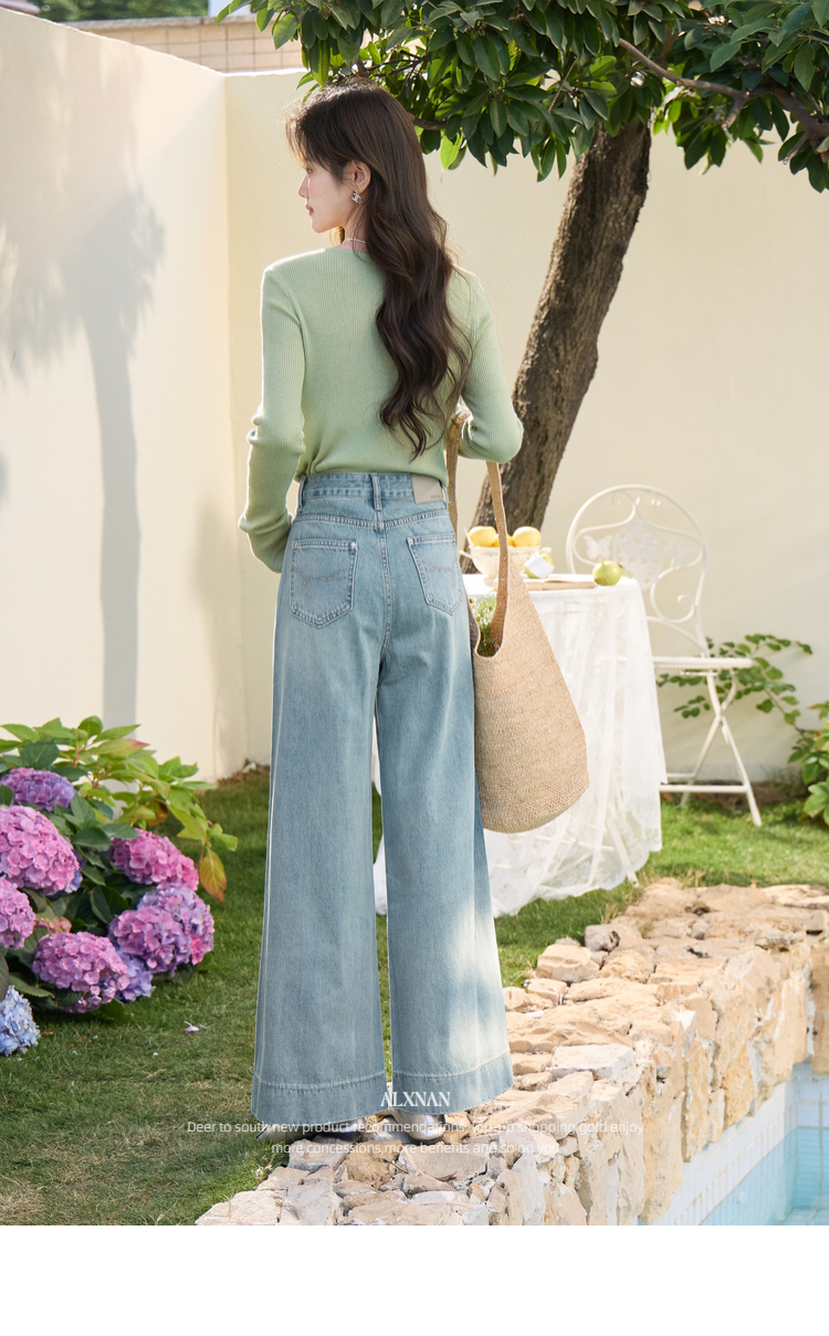鹿向南「晴岸织蓝」蓝色直筒牛仔裤春新款时尚百搭高腰修身长裤女