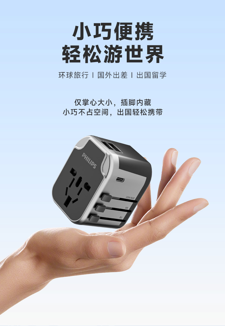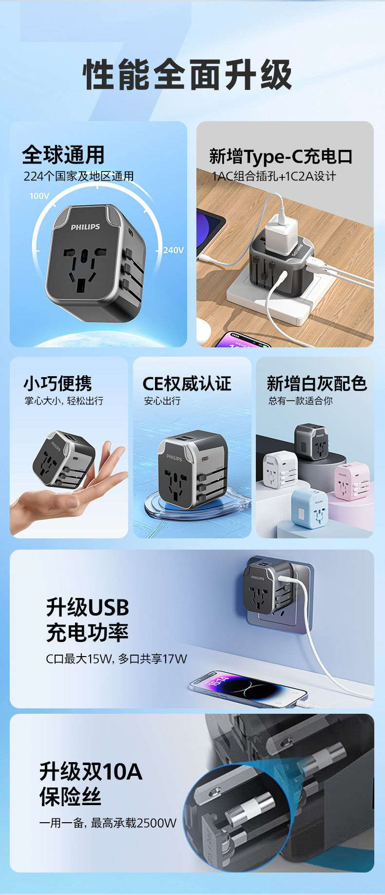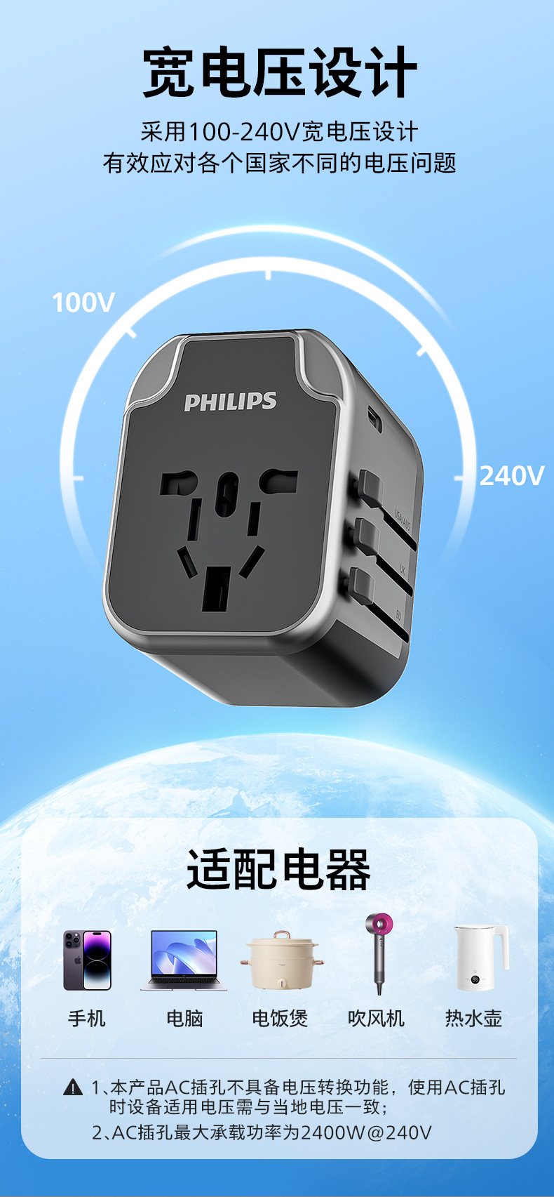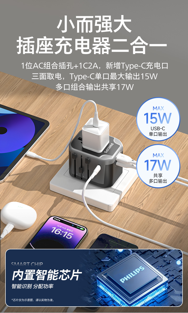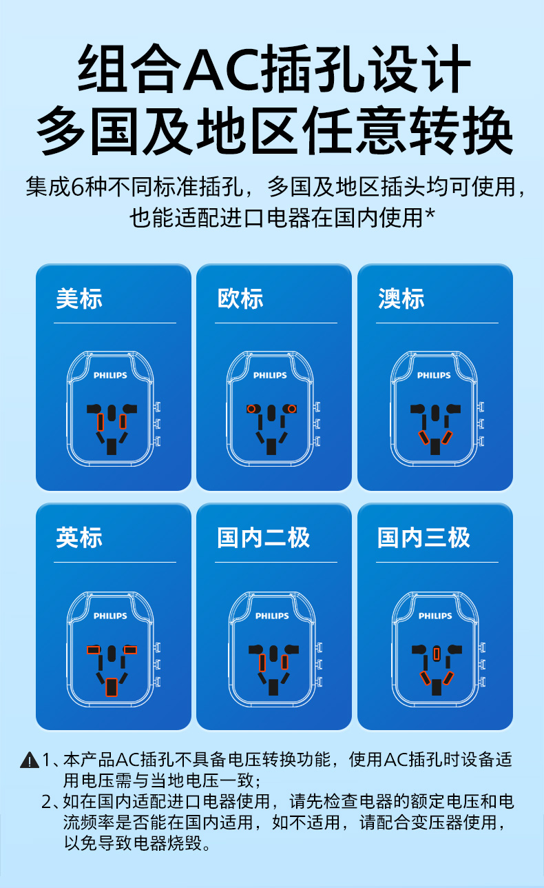 飞利浦(PHILIPS) 插座欧标插座全球通用德标插排韩国排插巴厘岛泰国插头转换器转换插头全球通用转换插头 【全球通】升级15W多C口