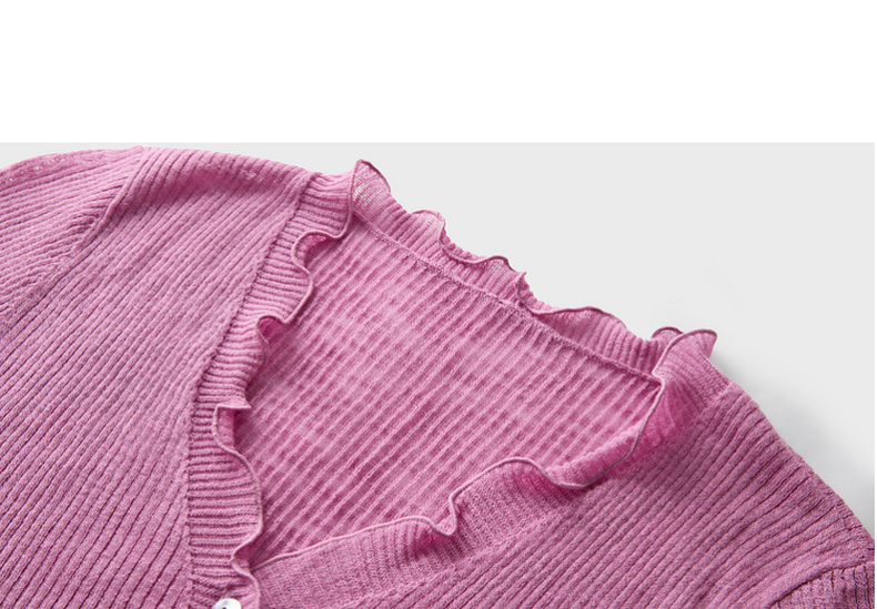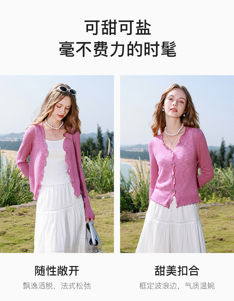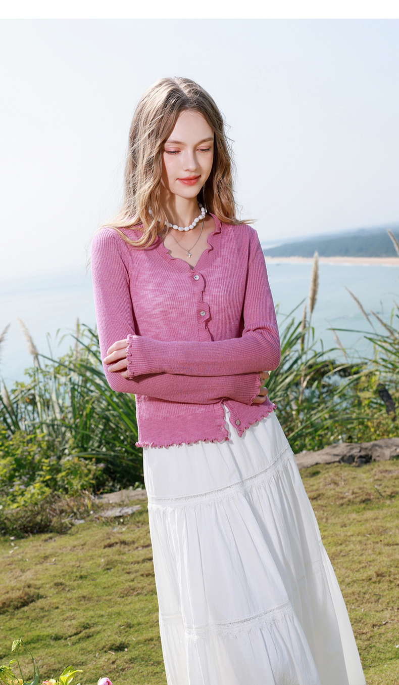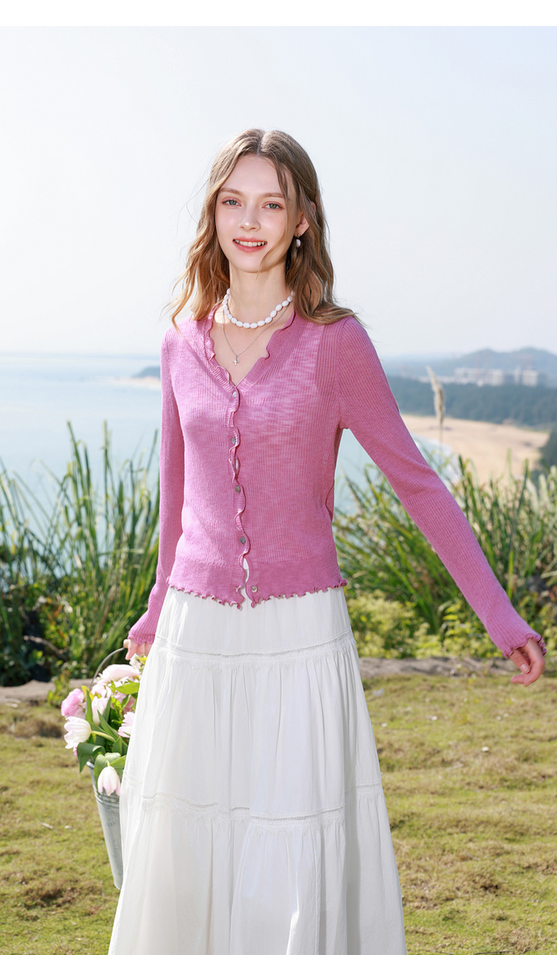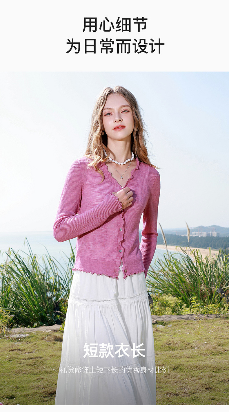 三彩2026春季新款木耳边针织衫V领毛衫短款开衫修身M
