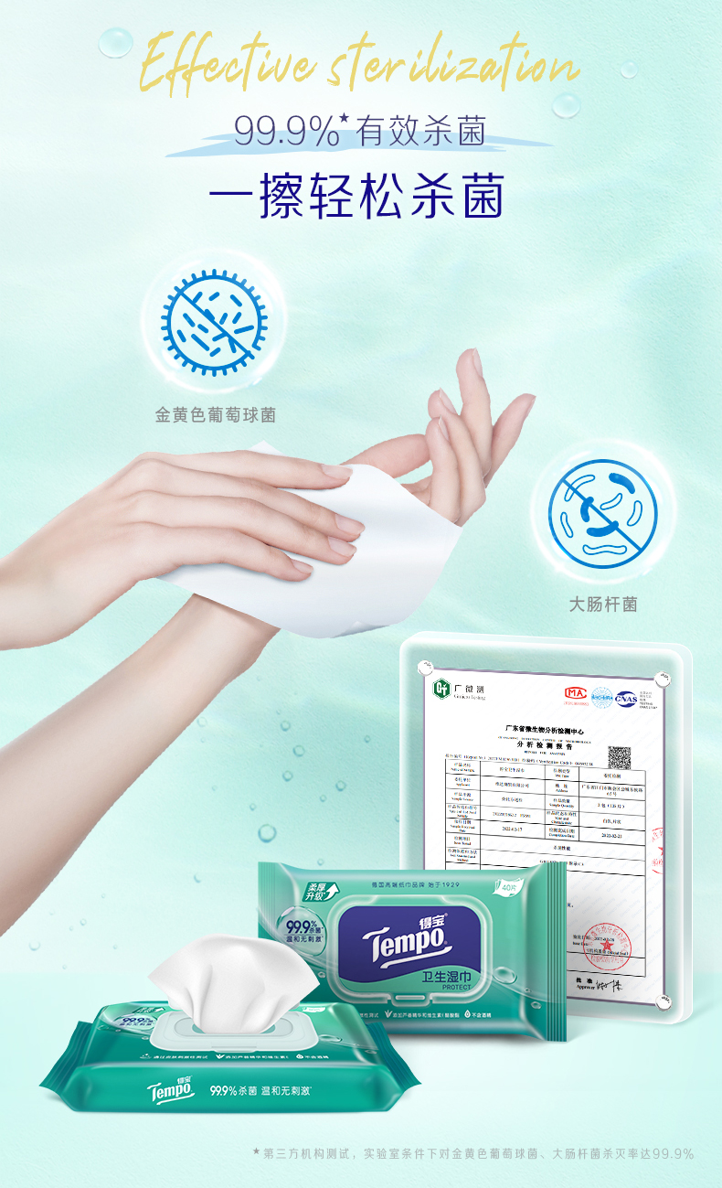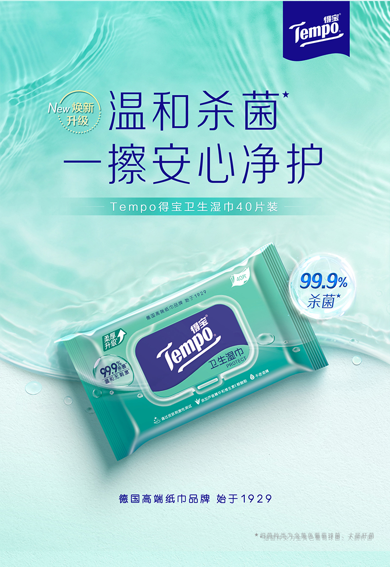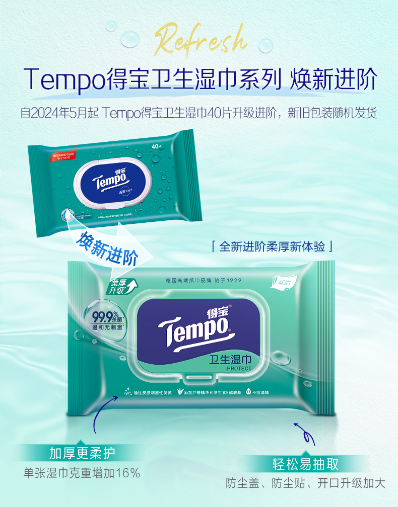 得宝(Tempo)便携卫生湿巾40片装*5包 共200片