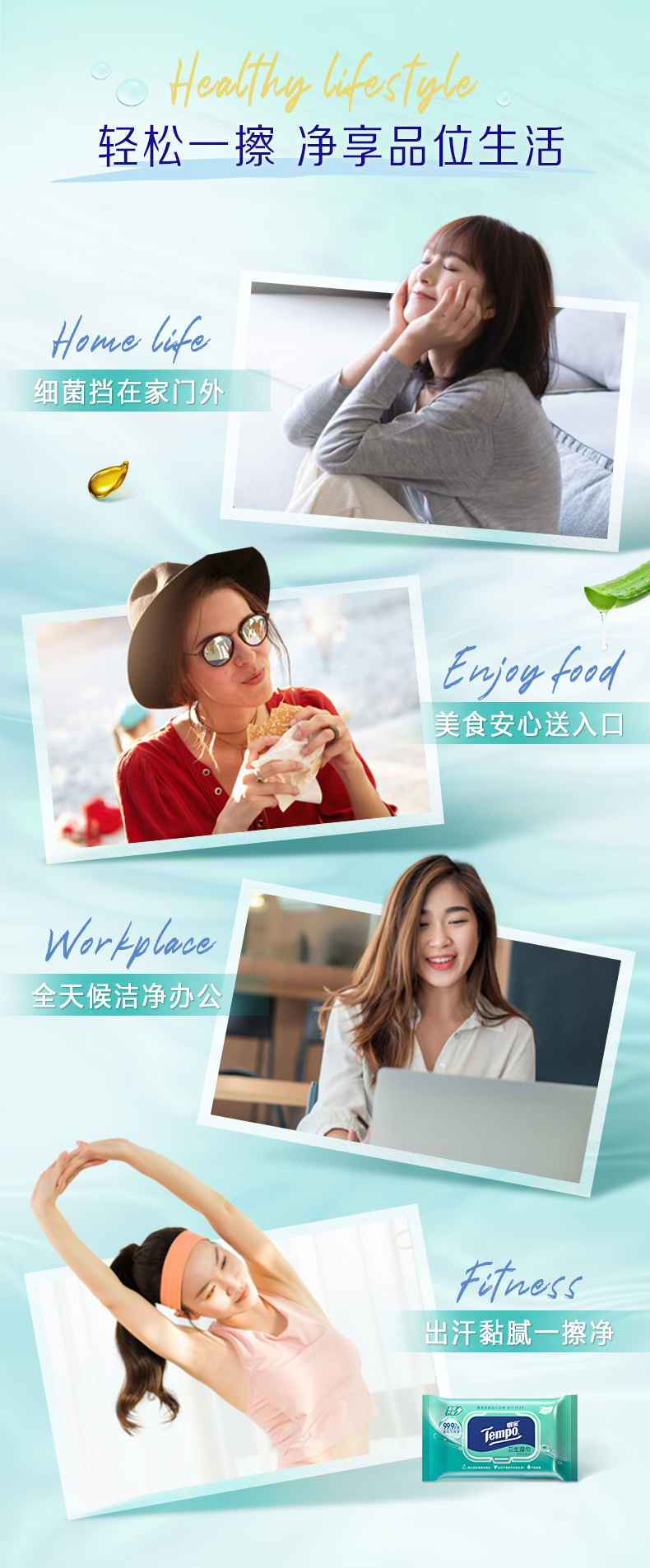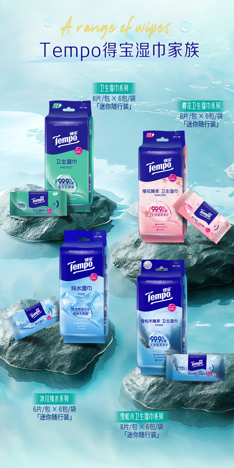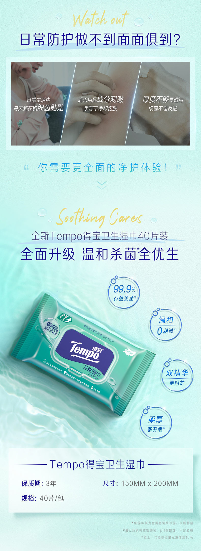 得宝(Tempo)便携卫生湿巾40片装*5包 共200片