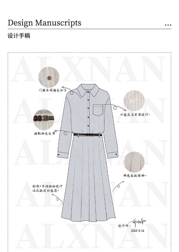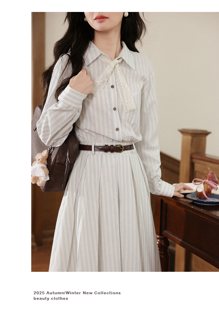 鹿向南「济州晚风」法式条纹长袖衬衫连衣裙女秋季高级通勤长裙子