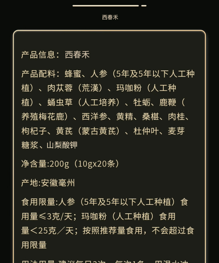 西春禾有可以缓解体力疲劳的作用功效,因为产品中添加了人参,可以大补元气,为身体补充多种营养,所以可以帮助改善体力疲劳引起的相关症状。其次它具有补肾壮阳的功效,因为产品中添加脑肉苁蓉可以调节内分泌系统,可以提高性激素的水平,鹿鞭能够帮助改善肾阴虚,可以改善阳痿早泄等多种情况。