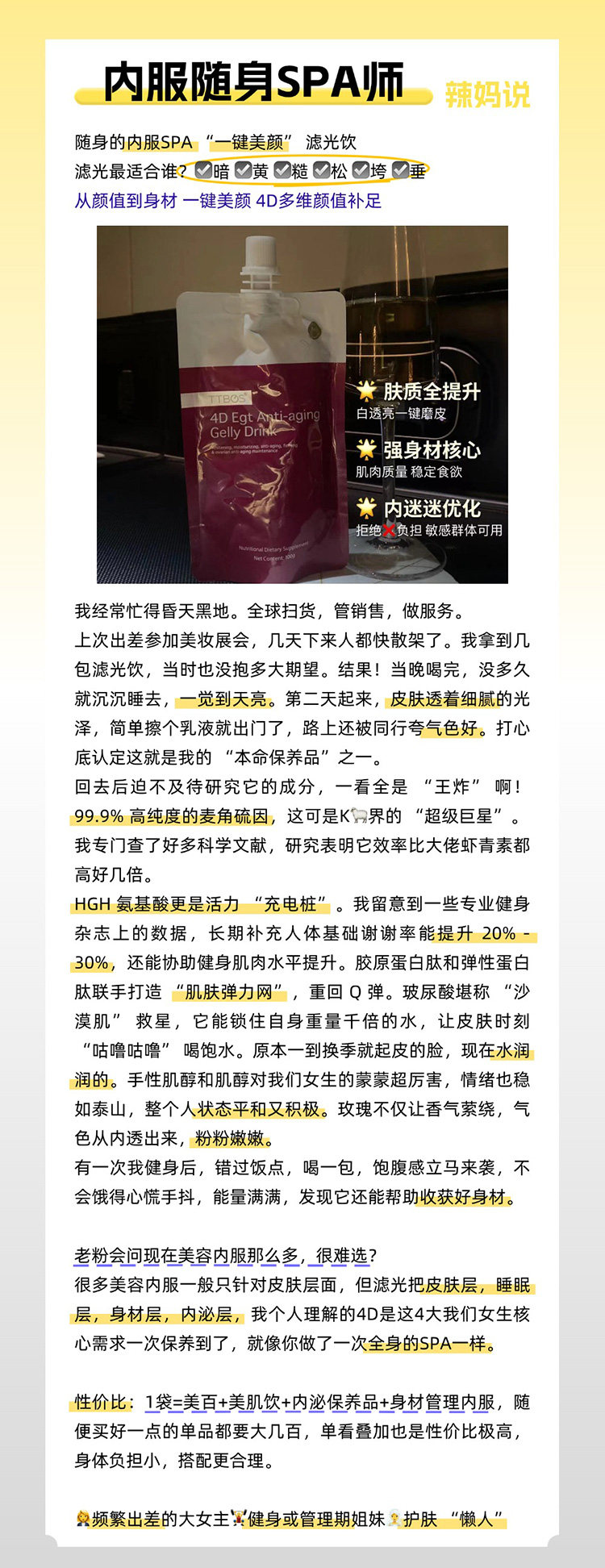 美国TTBOS高纯度4D99.99麦角硫因弹性蛋白hgh水光滤光冻饮口服液
