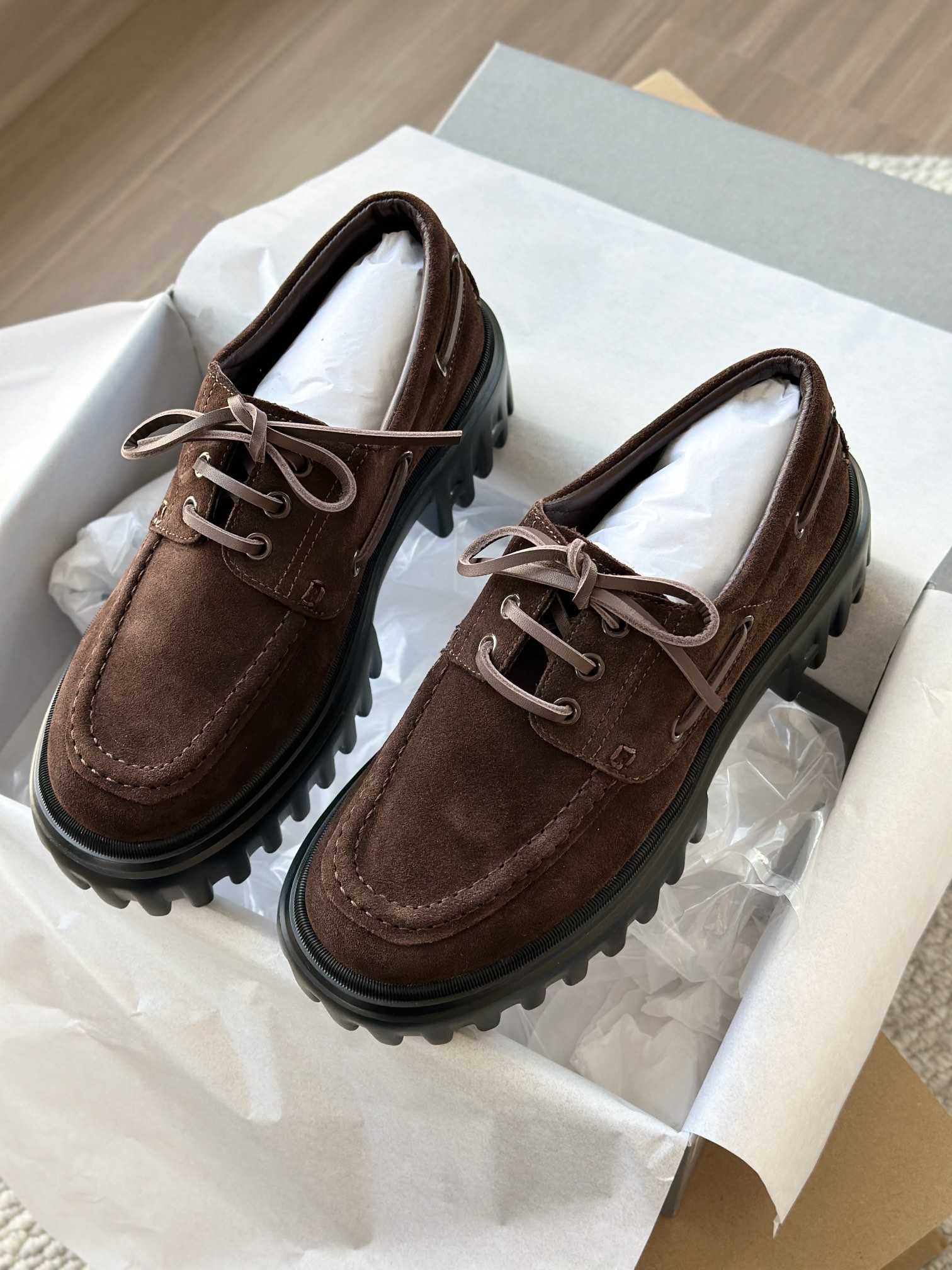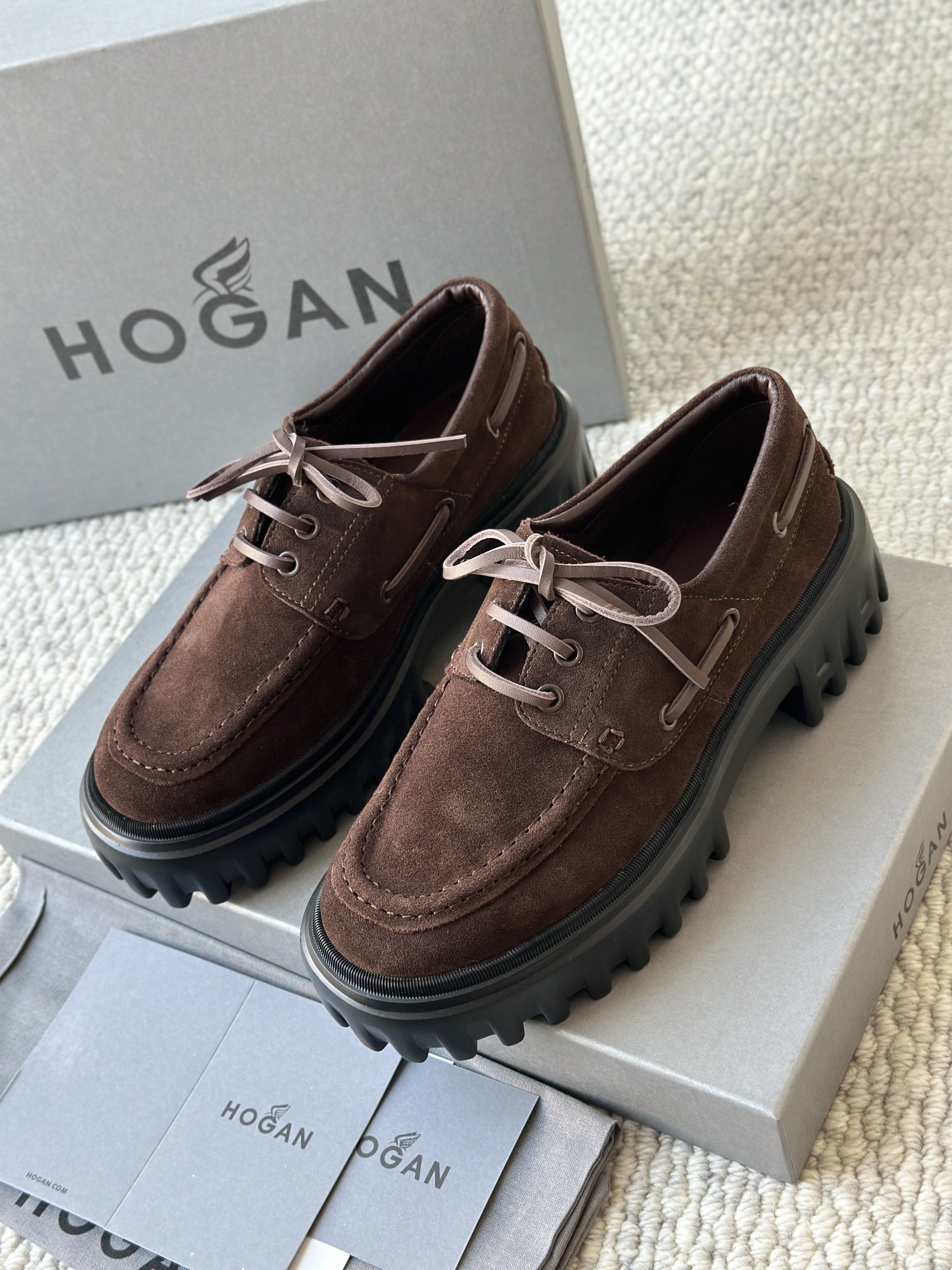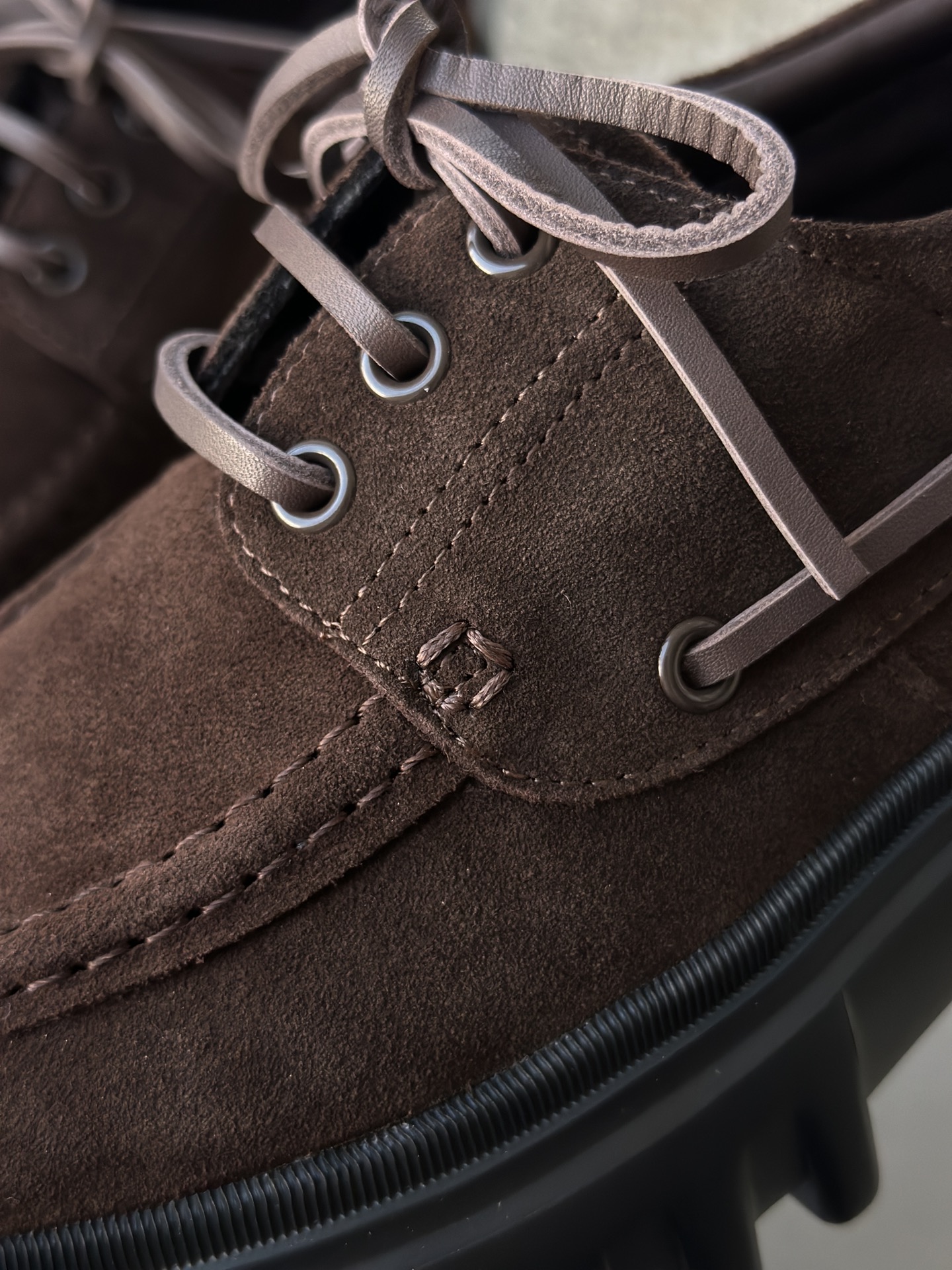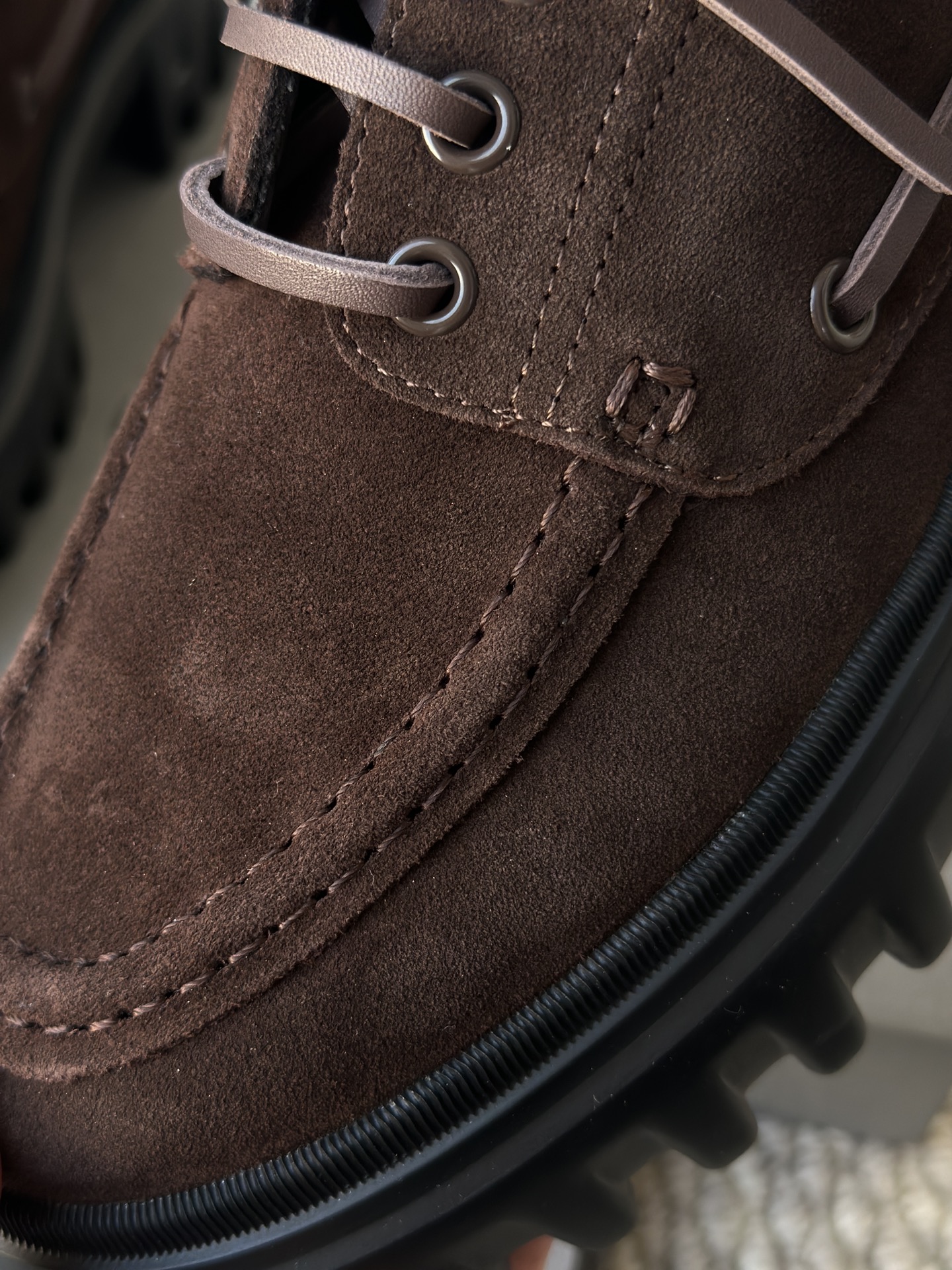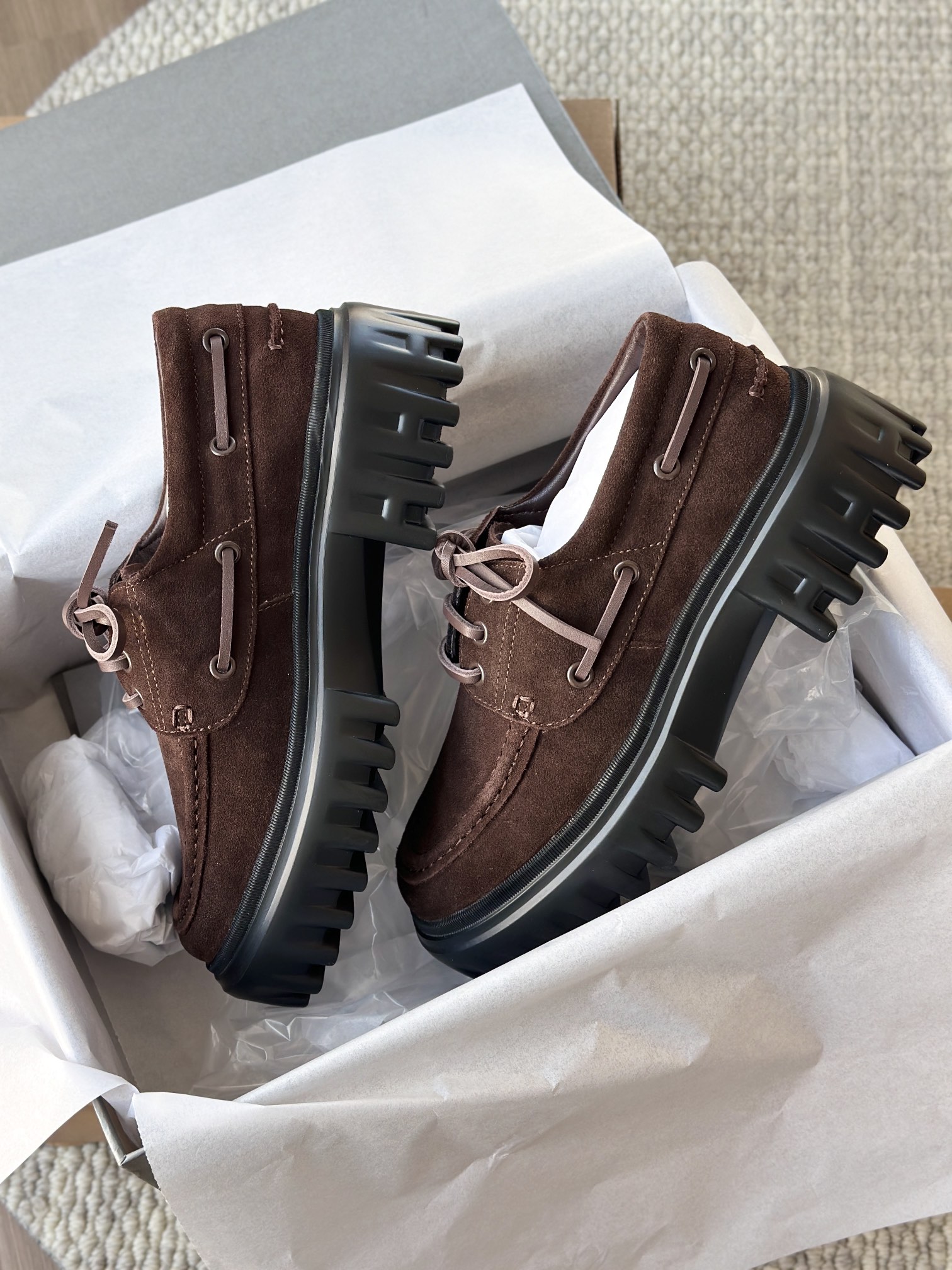 棕色和磨砂的麂皮不要太搭!! 摸起来简直像云朵一样柔软☁️ 鞋带绕鞋一周,设计超吸睛!! 自带时尚感!上脚古灵精怪的 有设计感又不会太浮夸,质感hen在线~