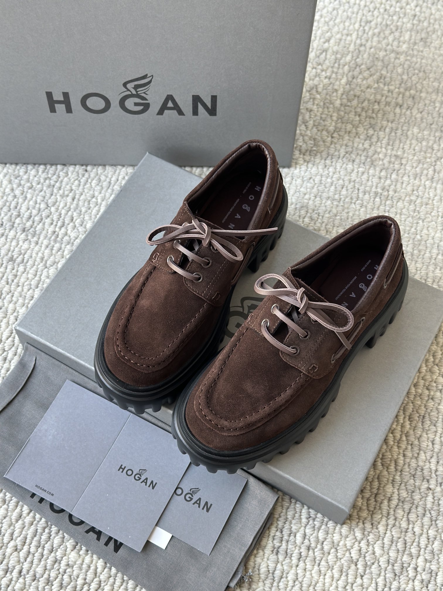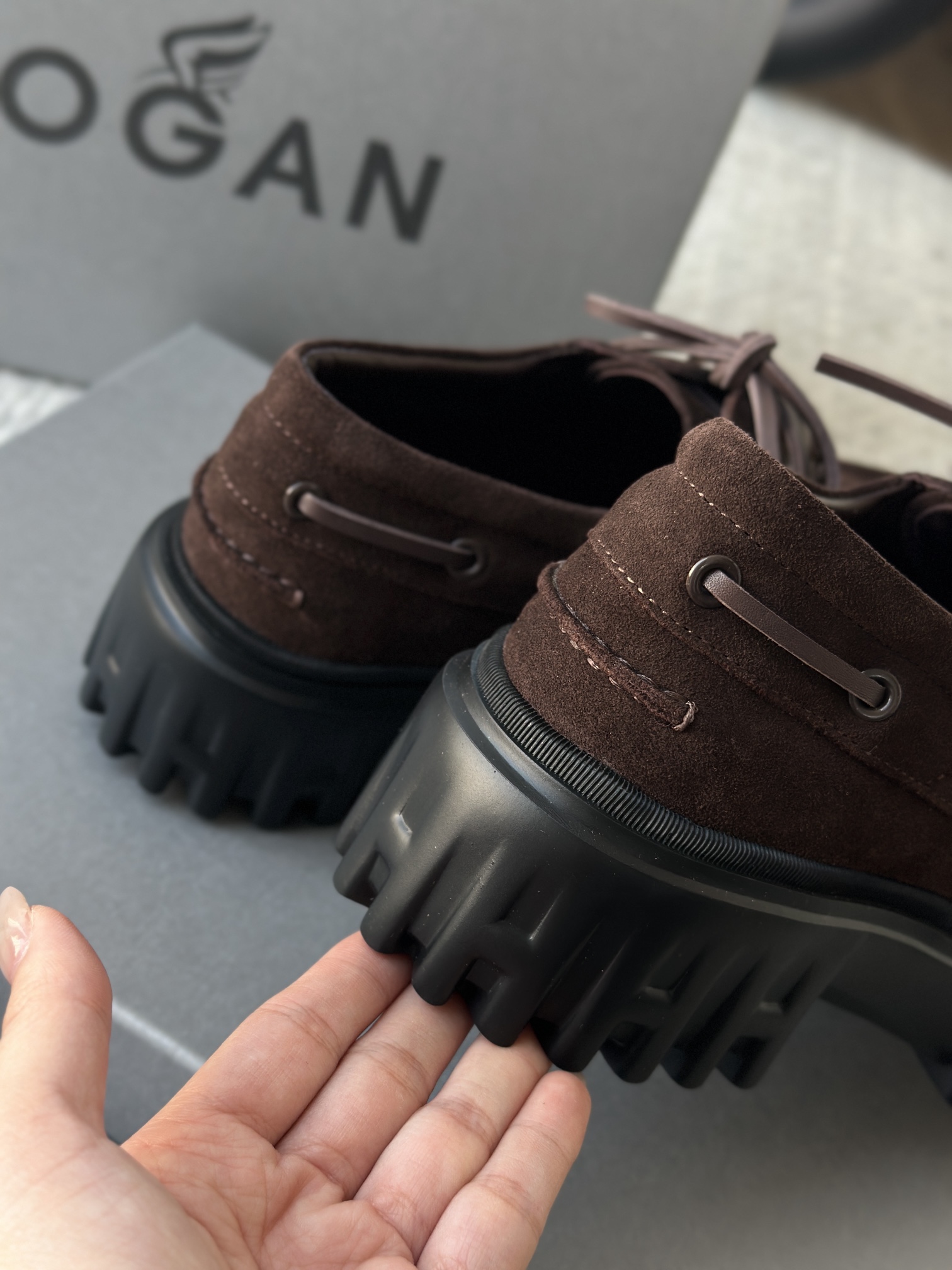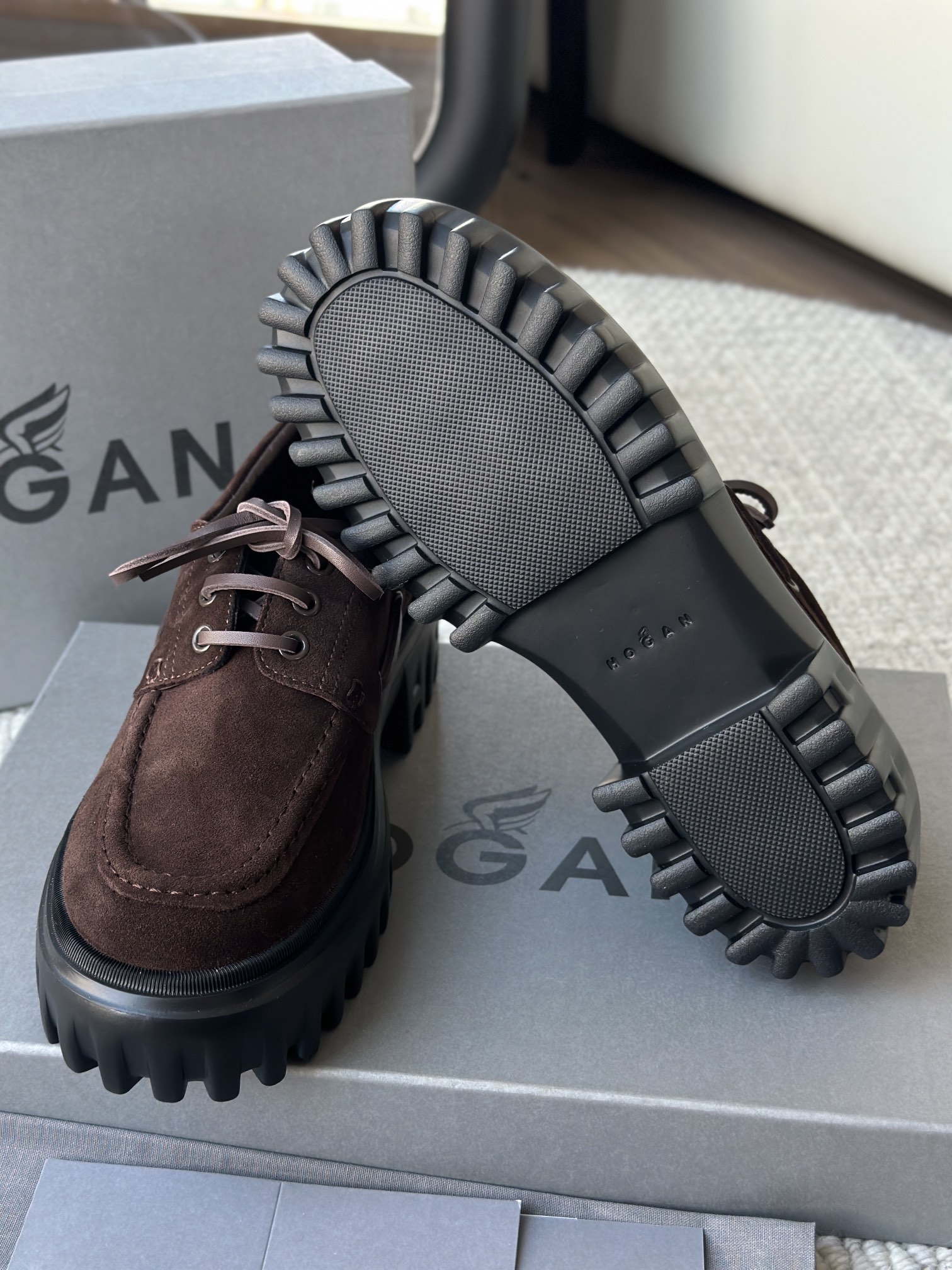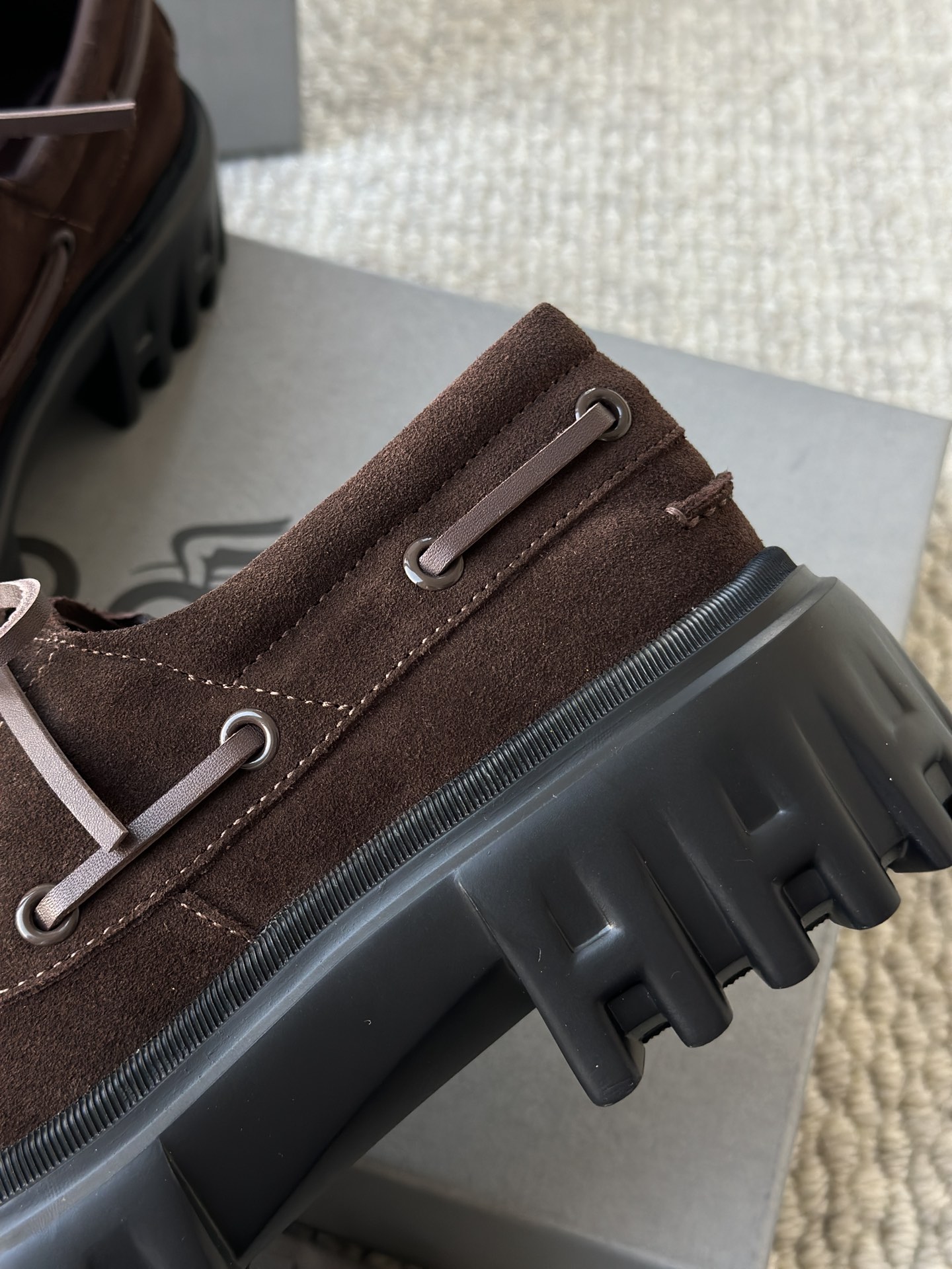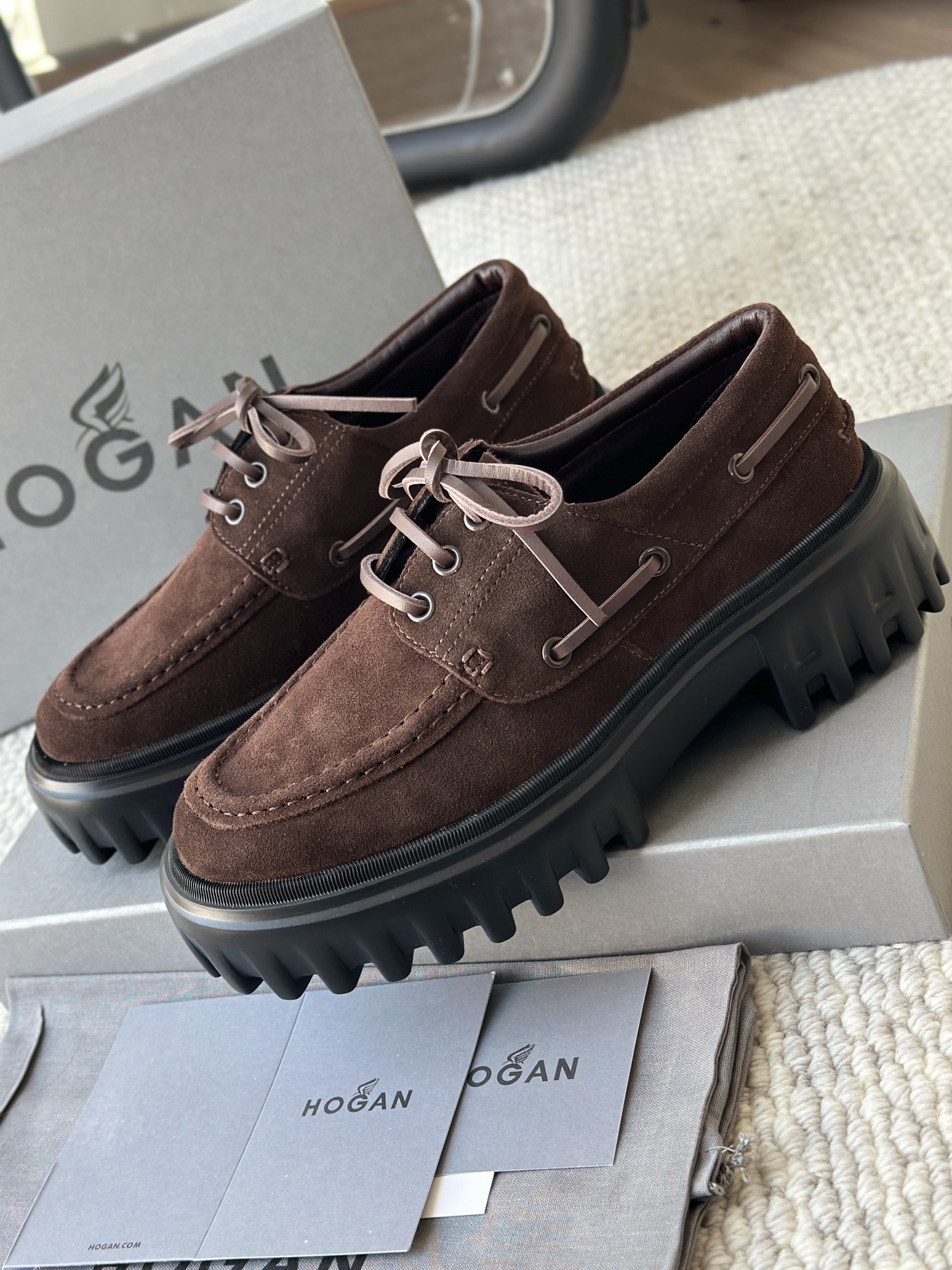 棕色和磨砂的麂皮不要太搭!! 摸起来简直像云朵一样柔软☁️ 鞋带绕鞋一周,设计超吸睛!! 自带时尚感!上脚古灵精怪的 有设计感又不会太浮夸,质感hen在线~