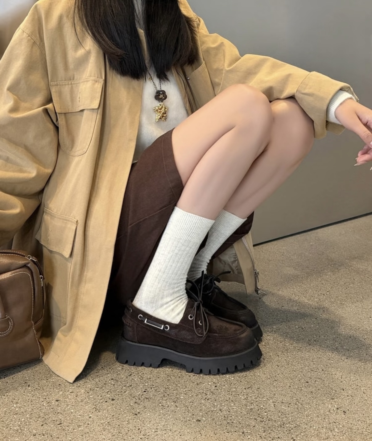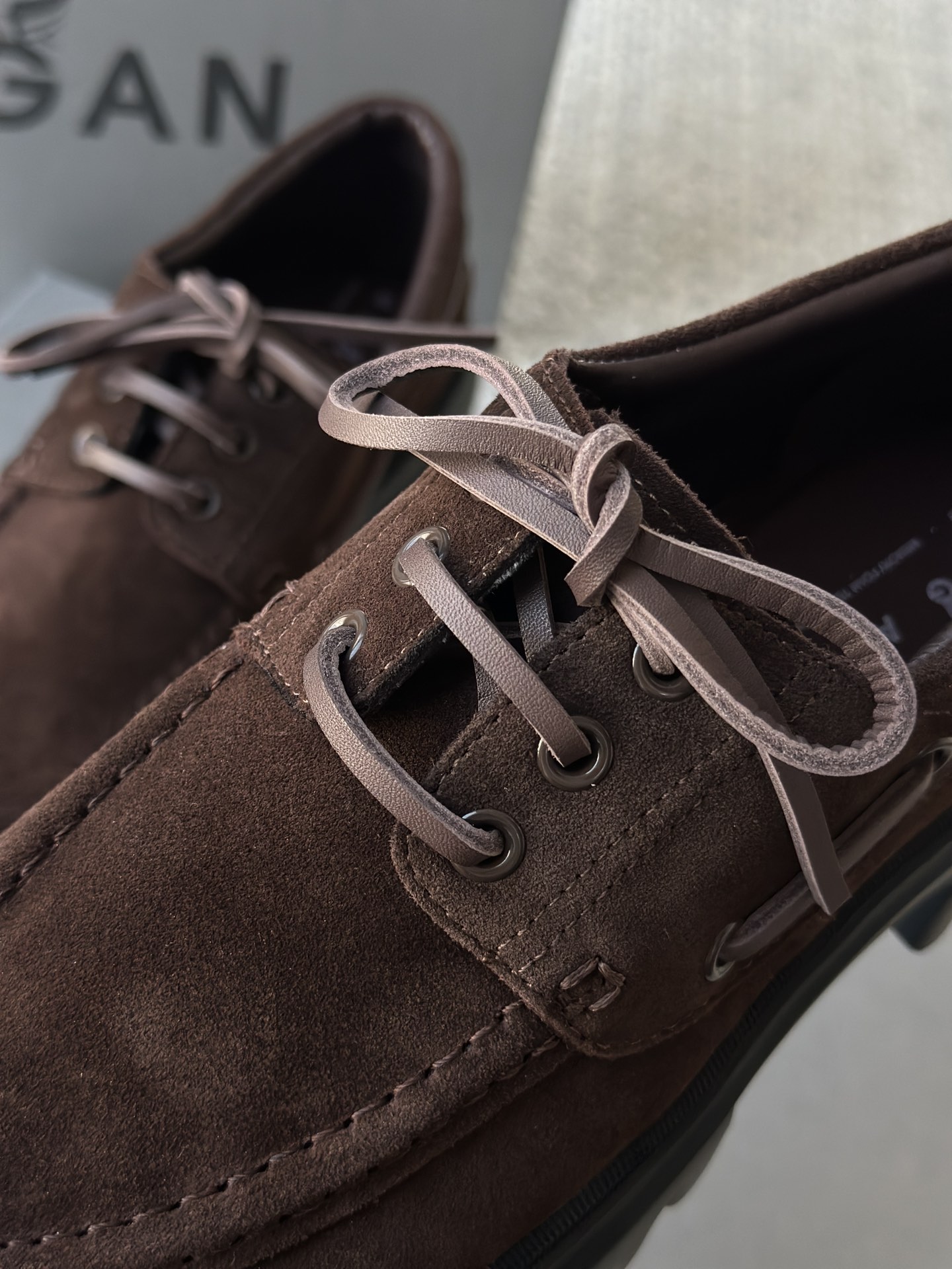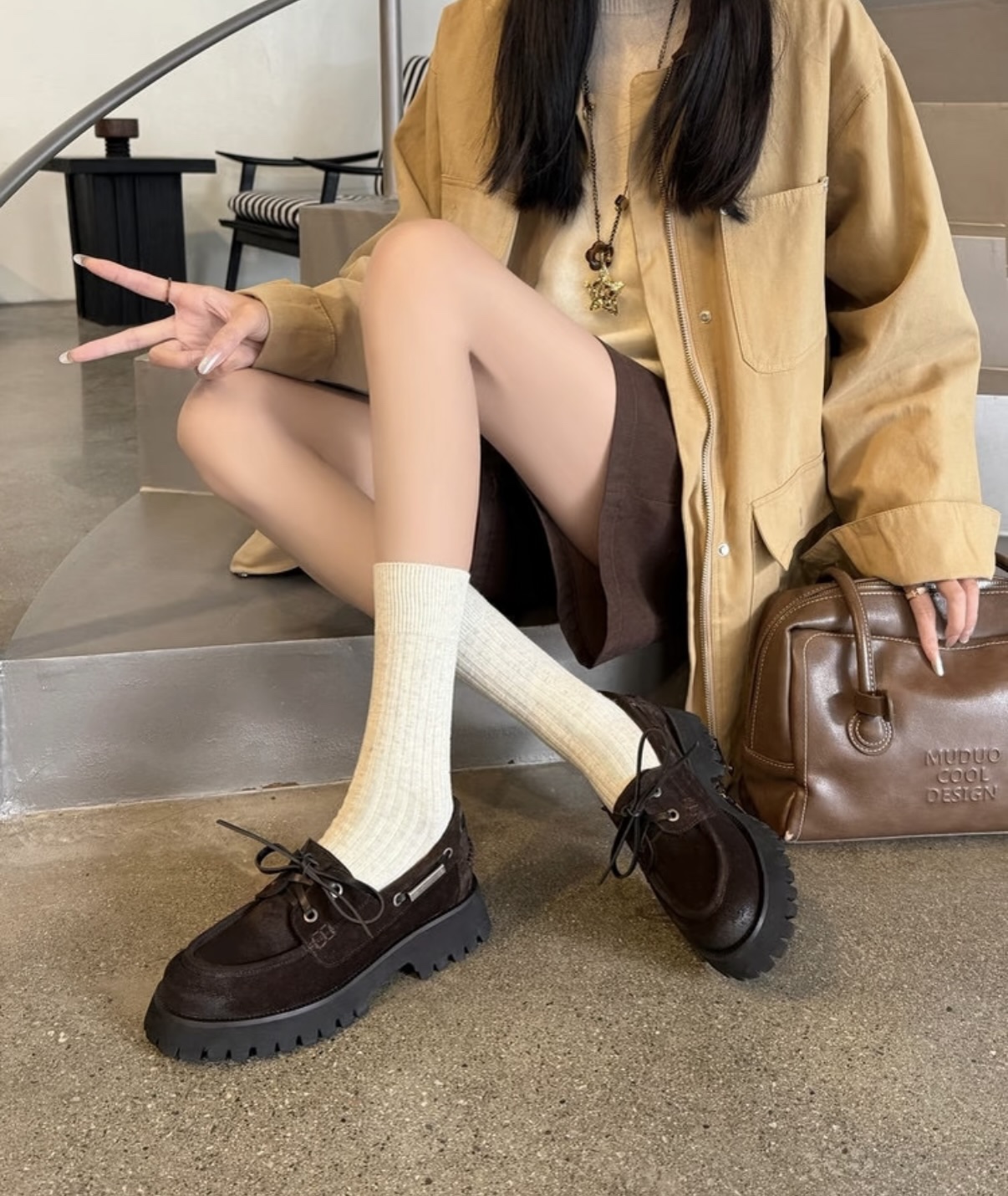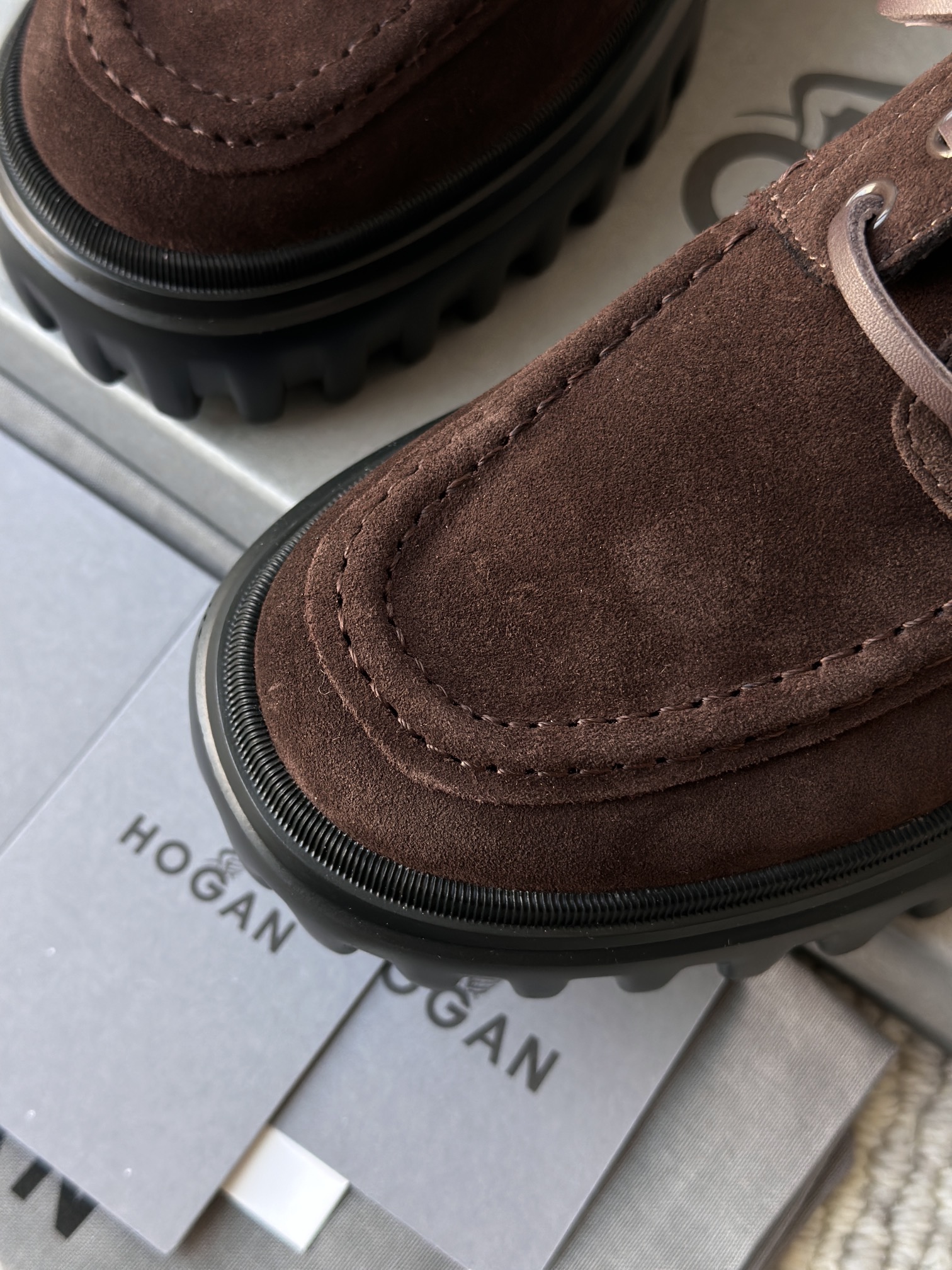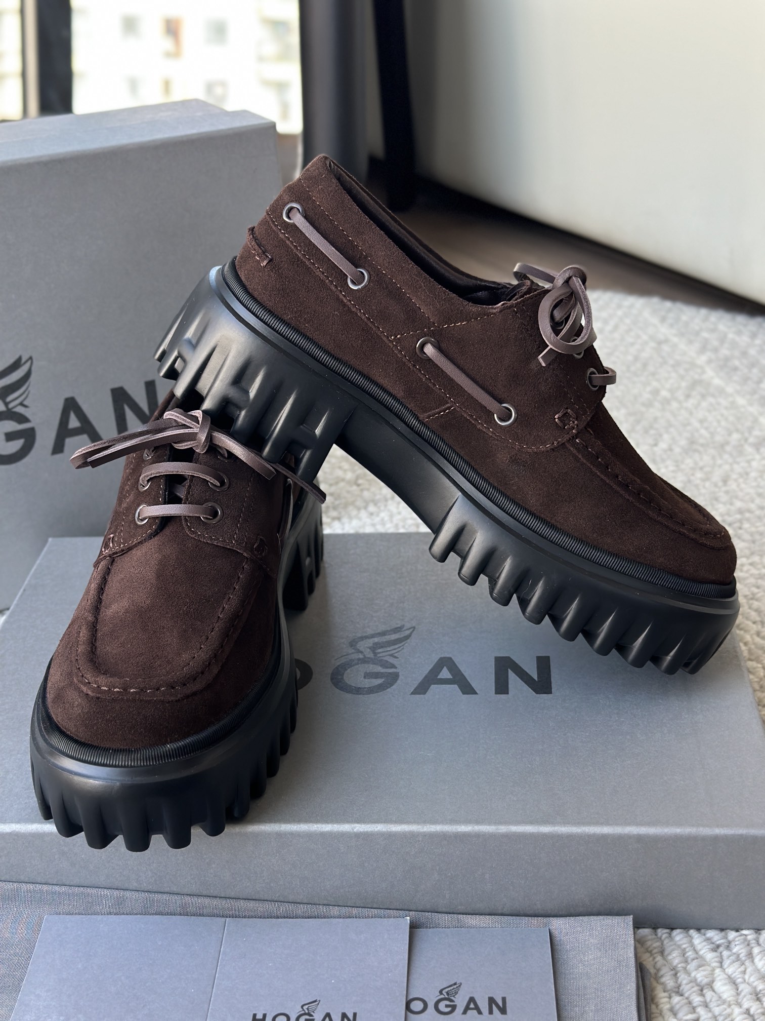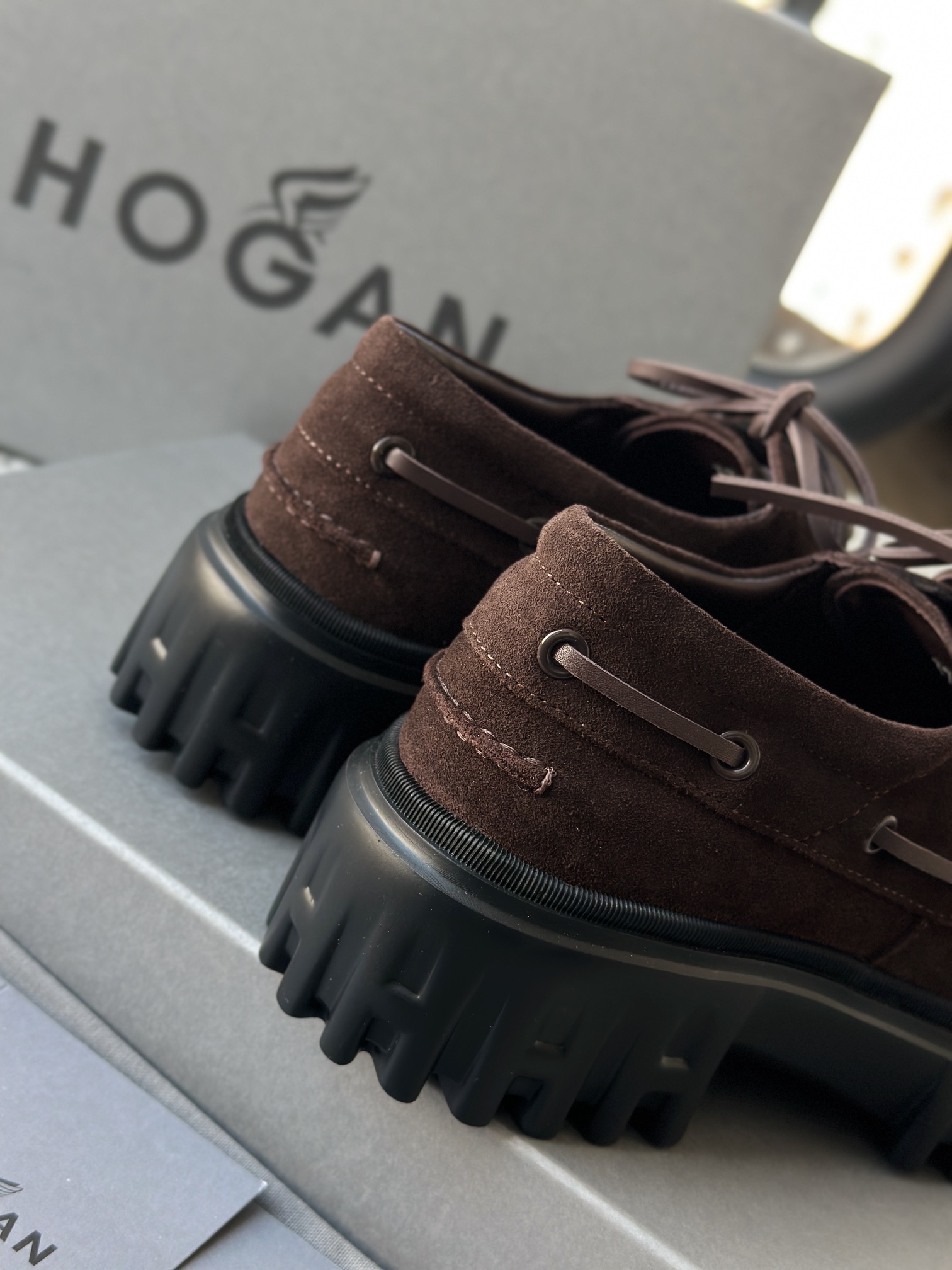 棕色和磨砂的麂皮不要太搭!! 摸起来简直像云朵一样柔软☁️ 鞋带绕鞋一周,设计超吸睛!! 自带时尚感!上脚古灵精怪的 有设计感又不会太浮夸,质感hen在线~