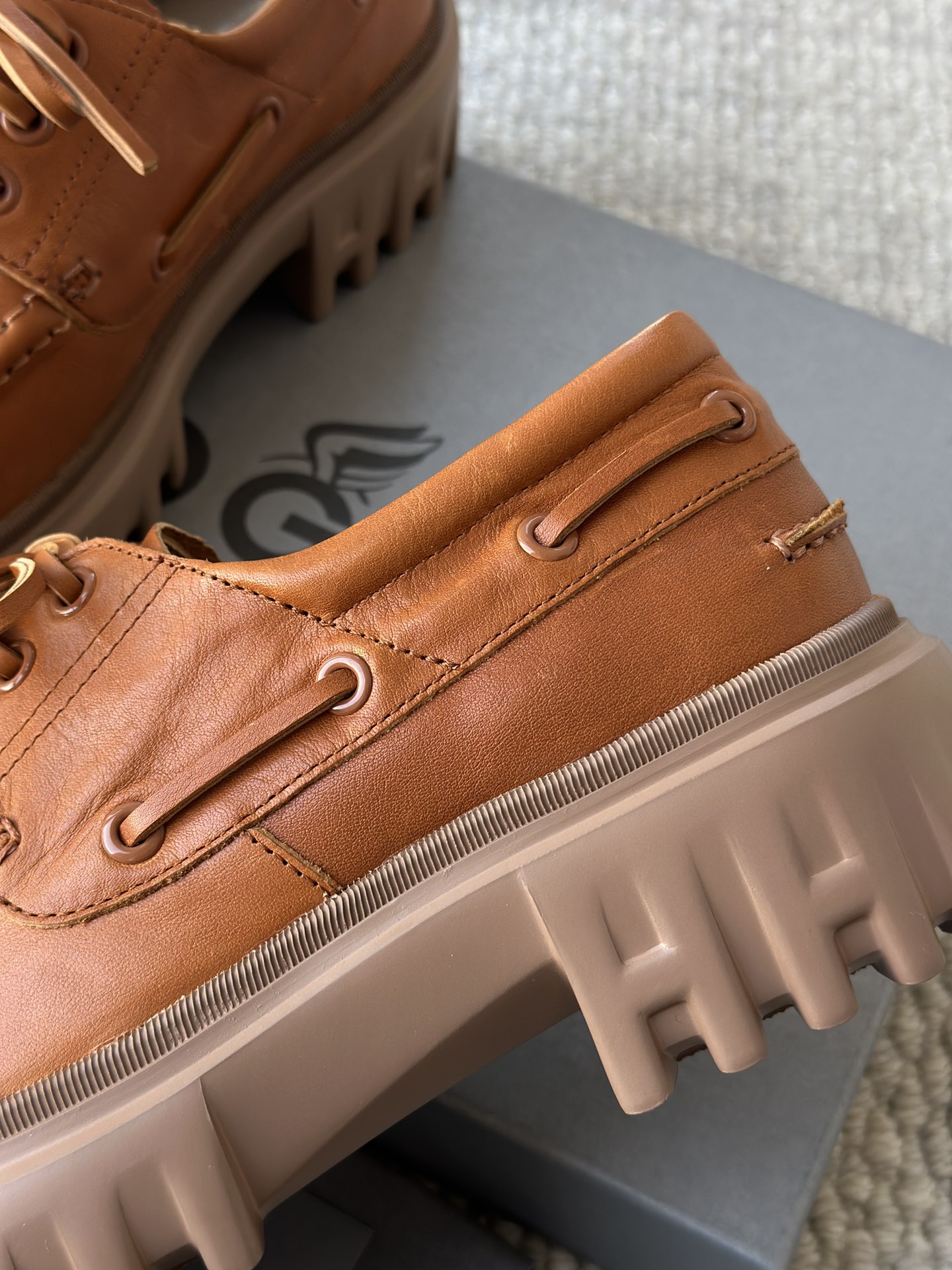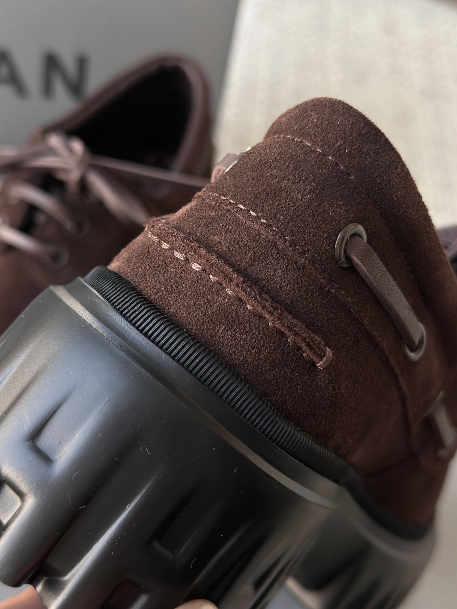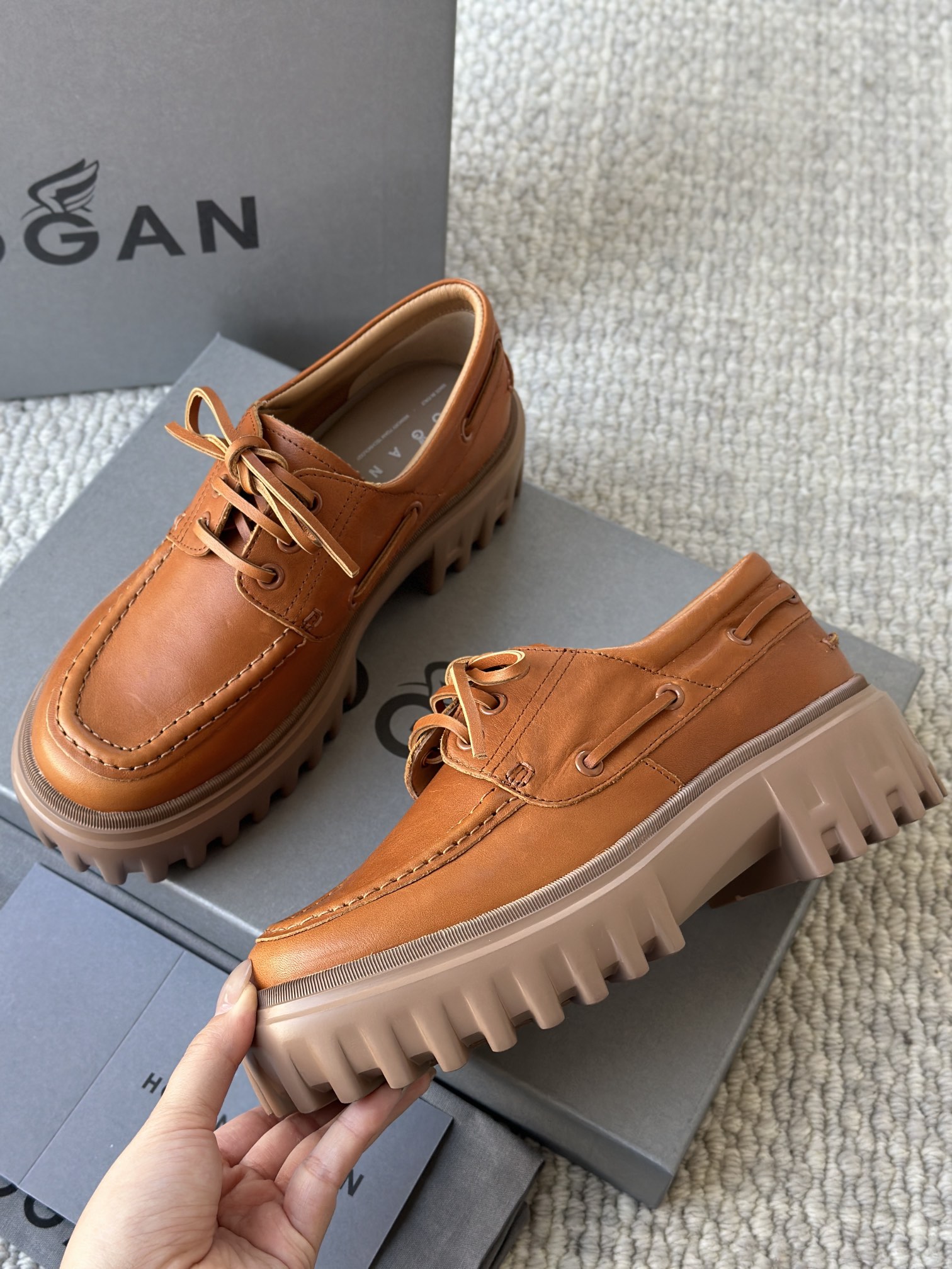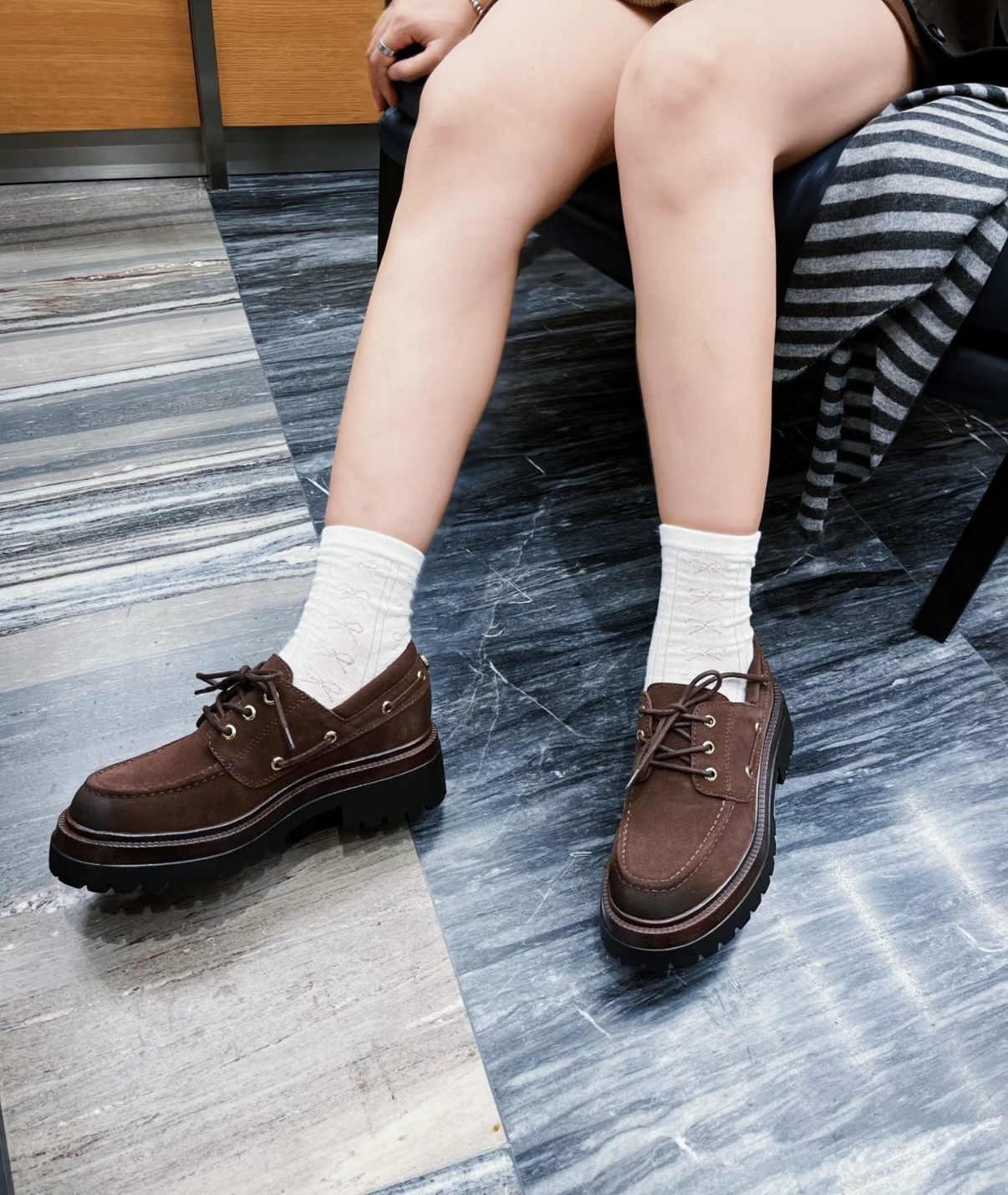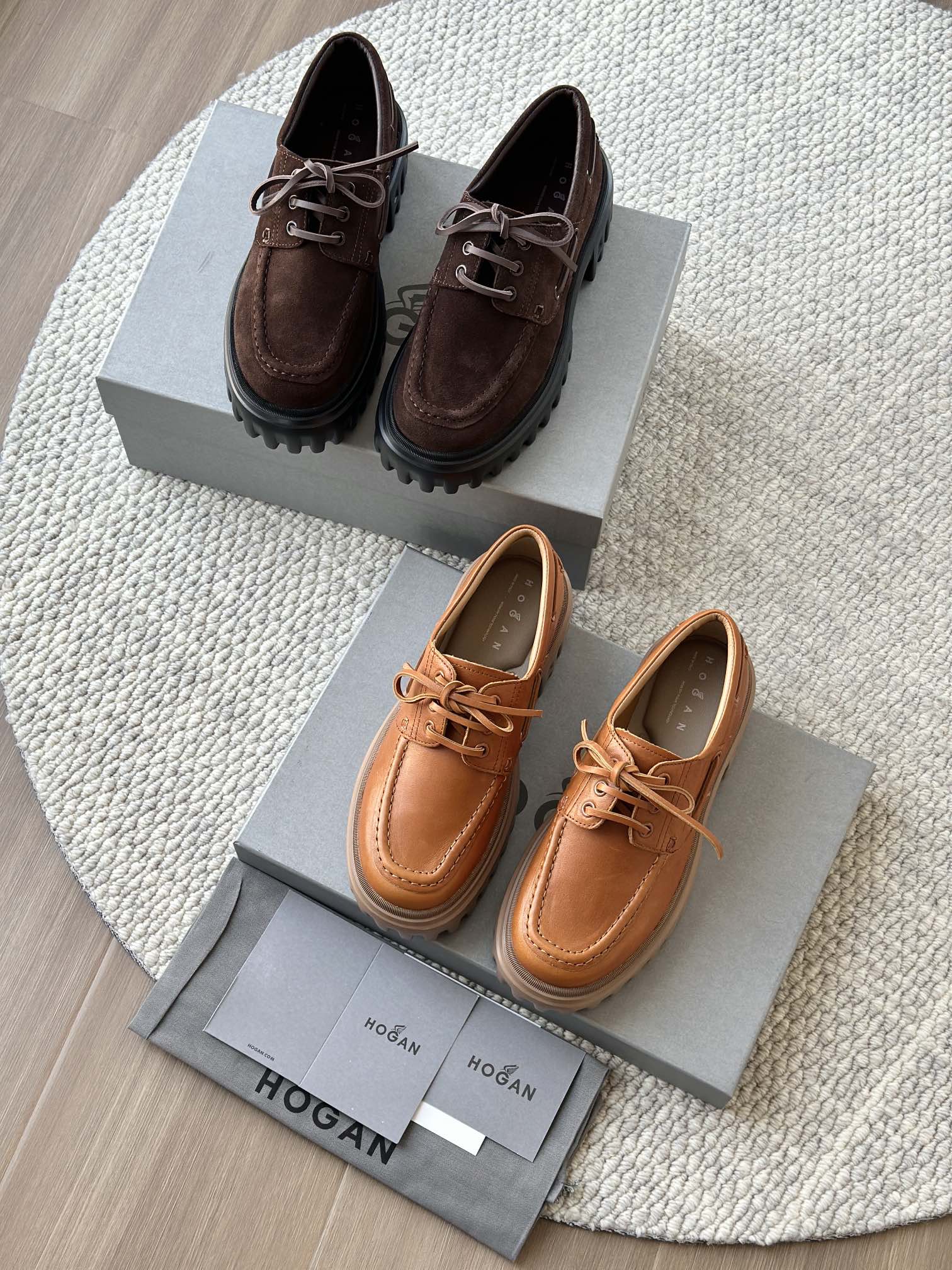 棕色和磨砂的麂皮不要太搭!! 摸起来简直像云朵一样柔软☁️ 鞋带绕鞋一周,设计超吸睛!! 自带时尚感!上脚古灵精怪的 有设计感又不会太浮夸,质感hen在线~