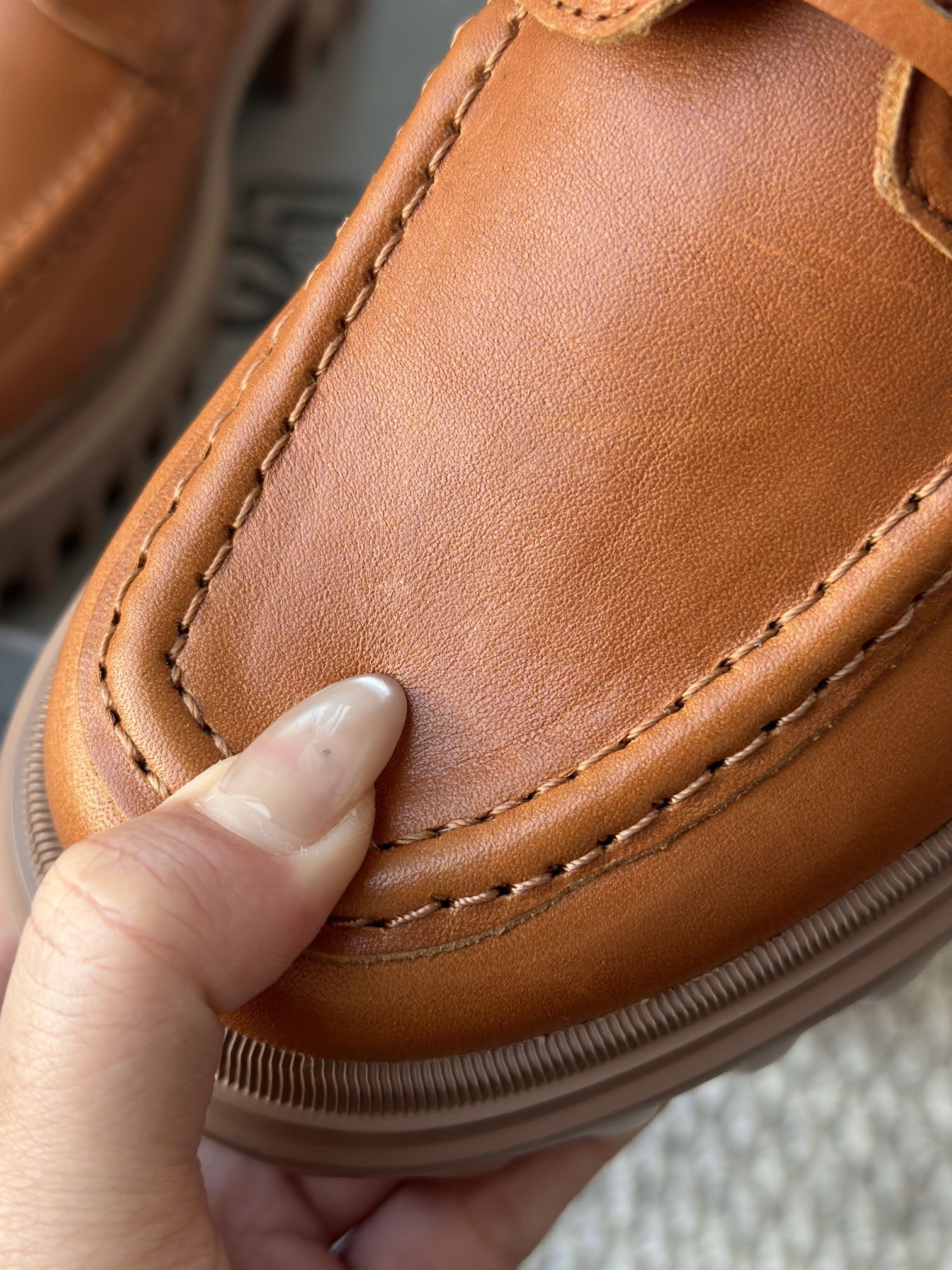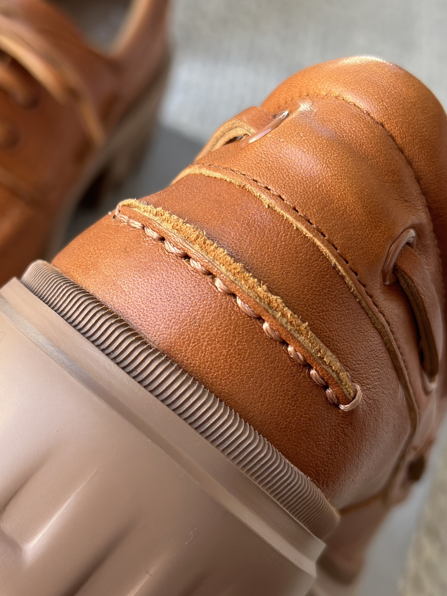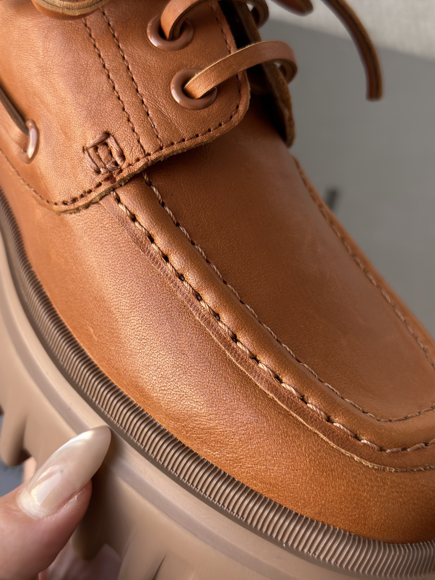 纯手工马克缝线剪裁的小方形鞋头 保证穿着舒适 不挤脚 有很好的脚感体验
