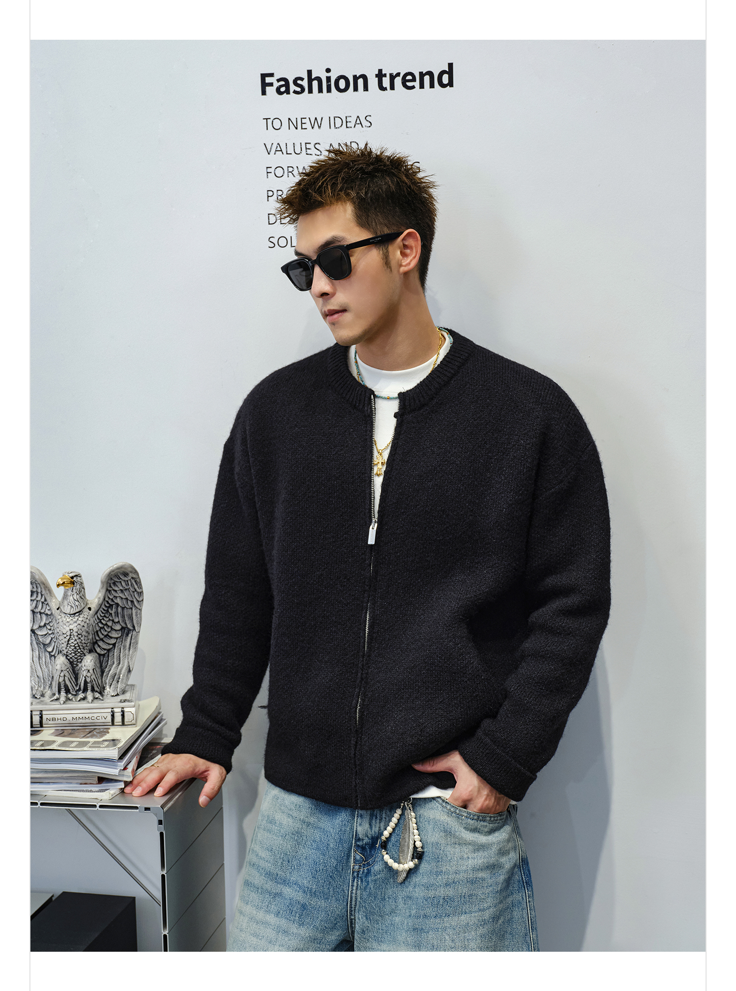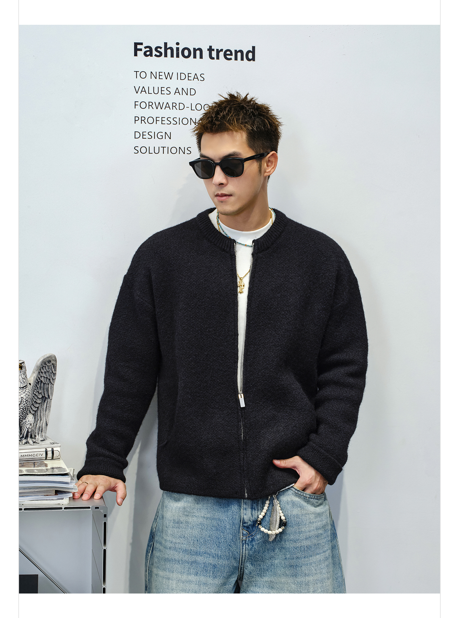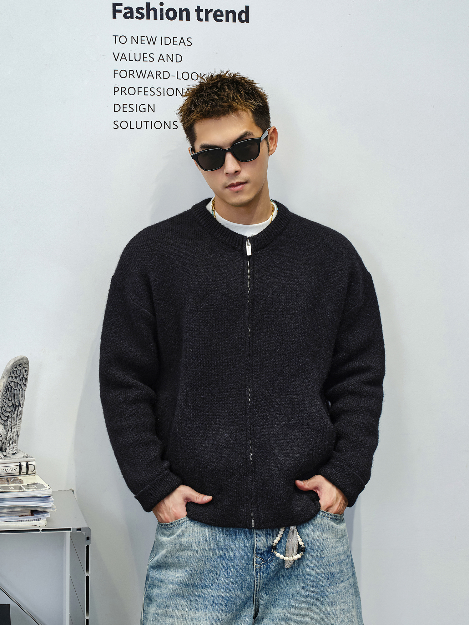 徐太浪【cleanfit 基础百搭】黑色圆领开衫毛衣男秋冬男装针织衫