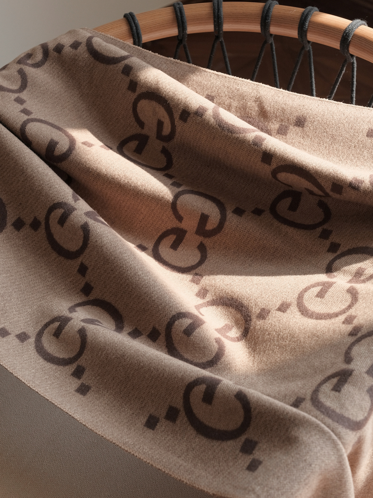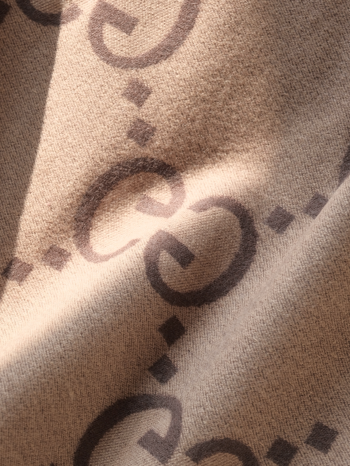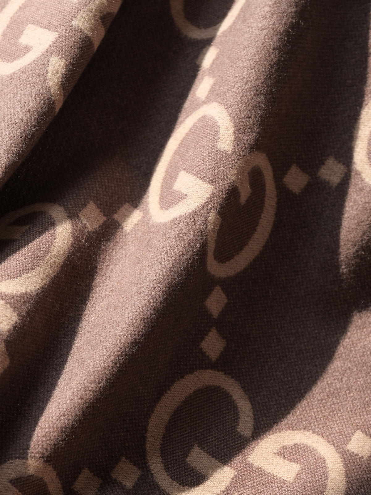 日常配饰融入代表性品牌元素后散发高雅不凡的魅力。这款柔软棉质提花围巾采用对比鲜明的拼色,交替排布具有辨识度的GG图案