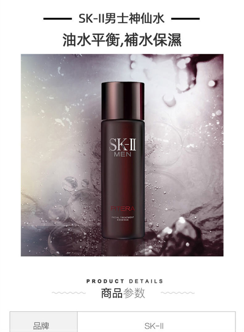 SK-II的皇牌产品终于为男士带来合适的护肤系列。SK-II男士焕活护肤精华露蕴含超过90%天然萃取物Pitera,它是SK-II所有产品的特有成分。使用一段时间,就能令男士肌肤变得顺滑、紧致、减少油光,展现澄明活肌。