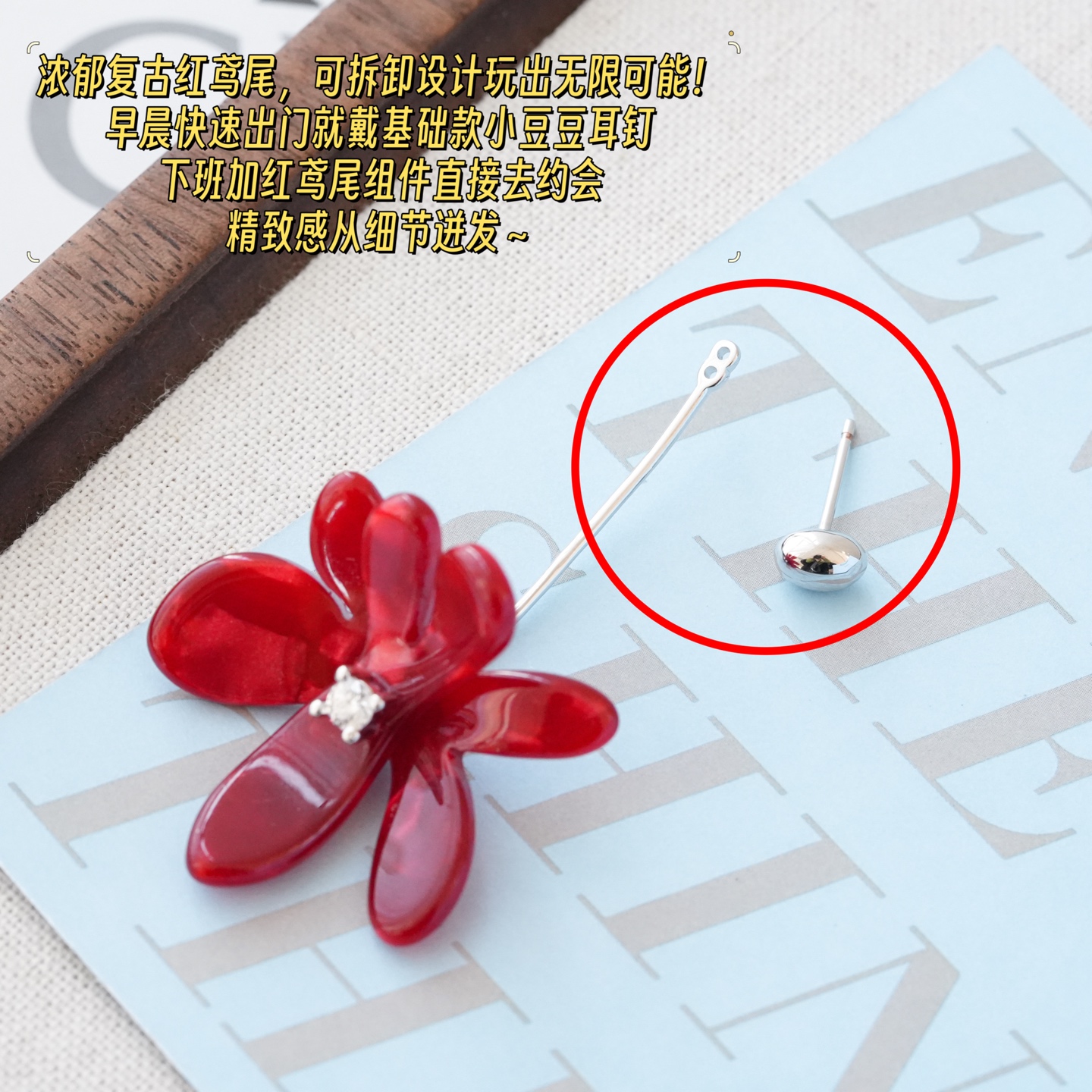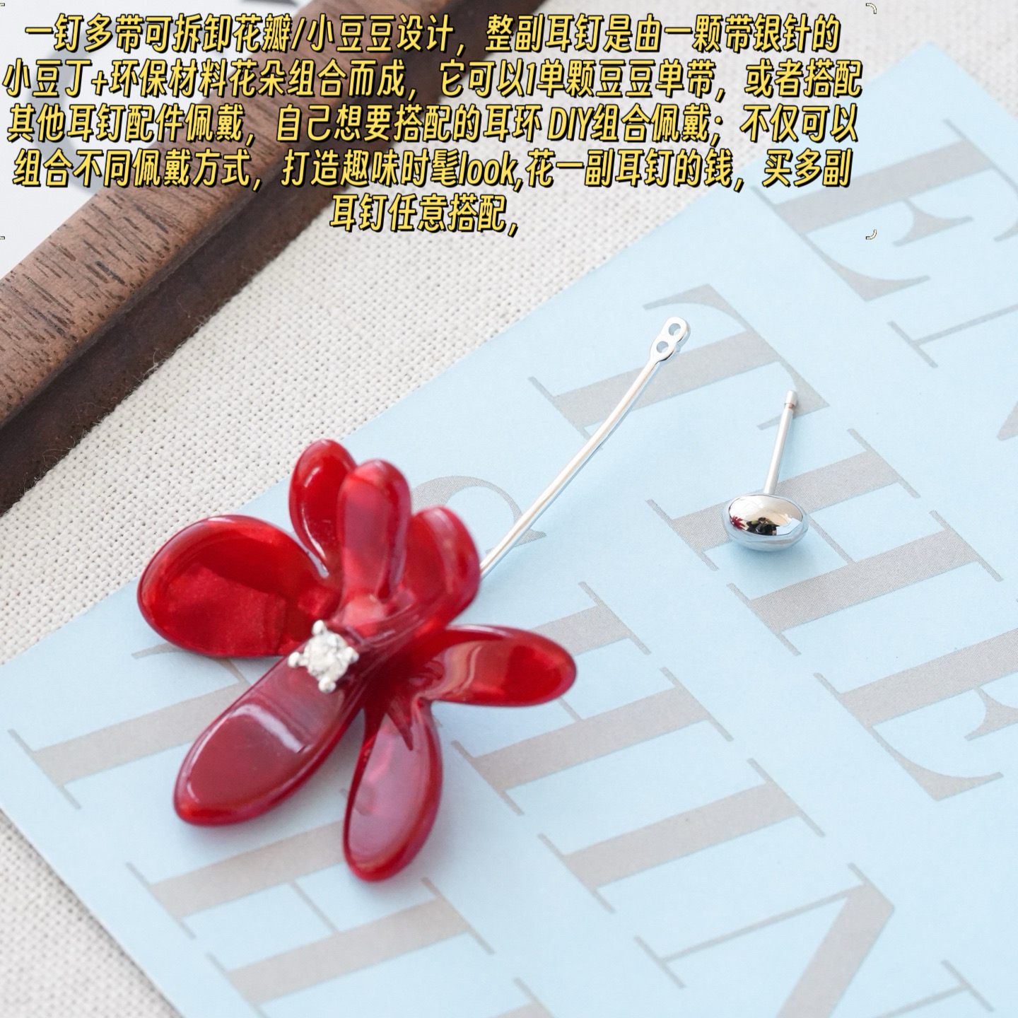 细节2️⃣ 一钉多带可拆卸花瓣/小豆豆设计,整副耳钉是由一颗带银针的小豆丁+环保材料花朵组合而成,它可以1单颗豆豆单带,或者搭配其他耳钉配件佩戴,自己想要搭配的耳环 DIY组合佩戴;不仅可以组合不同佩戴方式,打造趣味时髦look,花一副耳钉的钱,买多副耳钉任意搭配,性价比上无可挑剔!早晨快速出门就戴基础款小豆豆耳钉🤗 下班加红鸢尾组件直接去约会🍷 精致感从细节迸发~