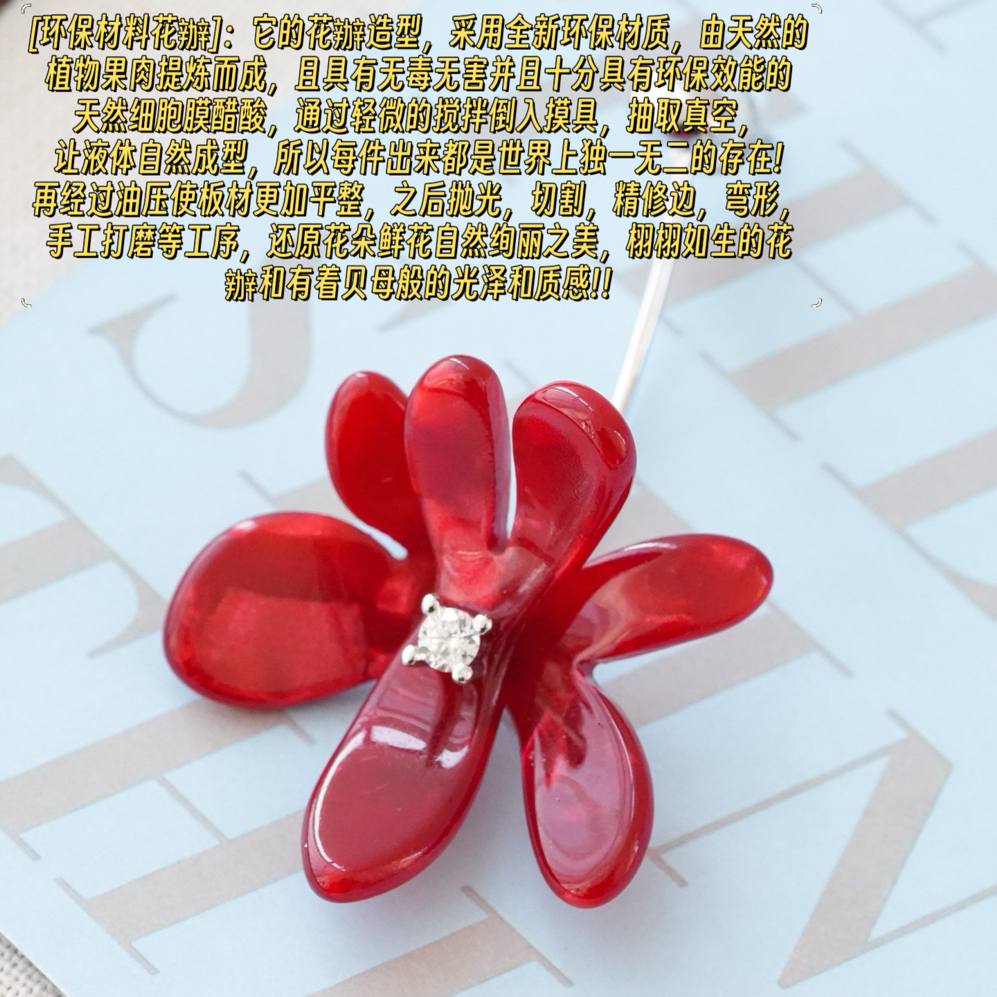 细节1️⃣ 环保材料花辦 它的花辦造型,采用全新环保材质,由天然的植物果肉提炼而成,且具有无毒无害并且十分具有环保效能的天然细胞膜醋酸,通过轻微的搅拌倒入摸具,抽取真空,让液体自然成型,所以每件出来都是世界上独一无二的存在!再经过油压使板材更加平整,之后抛光,切割,精修边,弯形,手工打磨等工序,还原花朵鲜花自然绚丽之美,栩栩如生的花辦和有着贝母般的光泽和质感!!