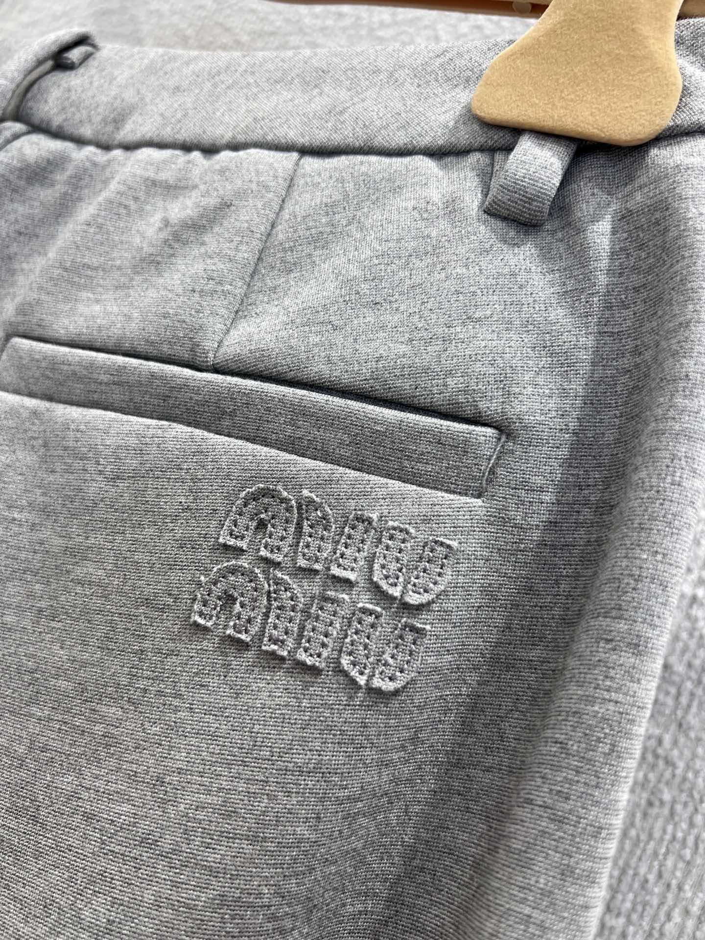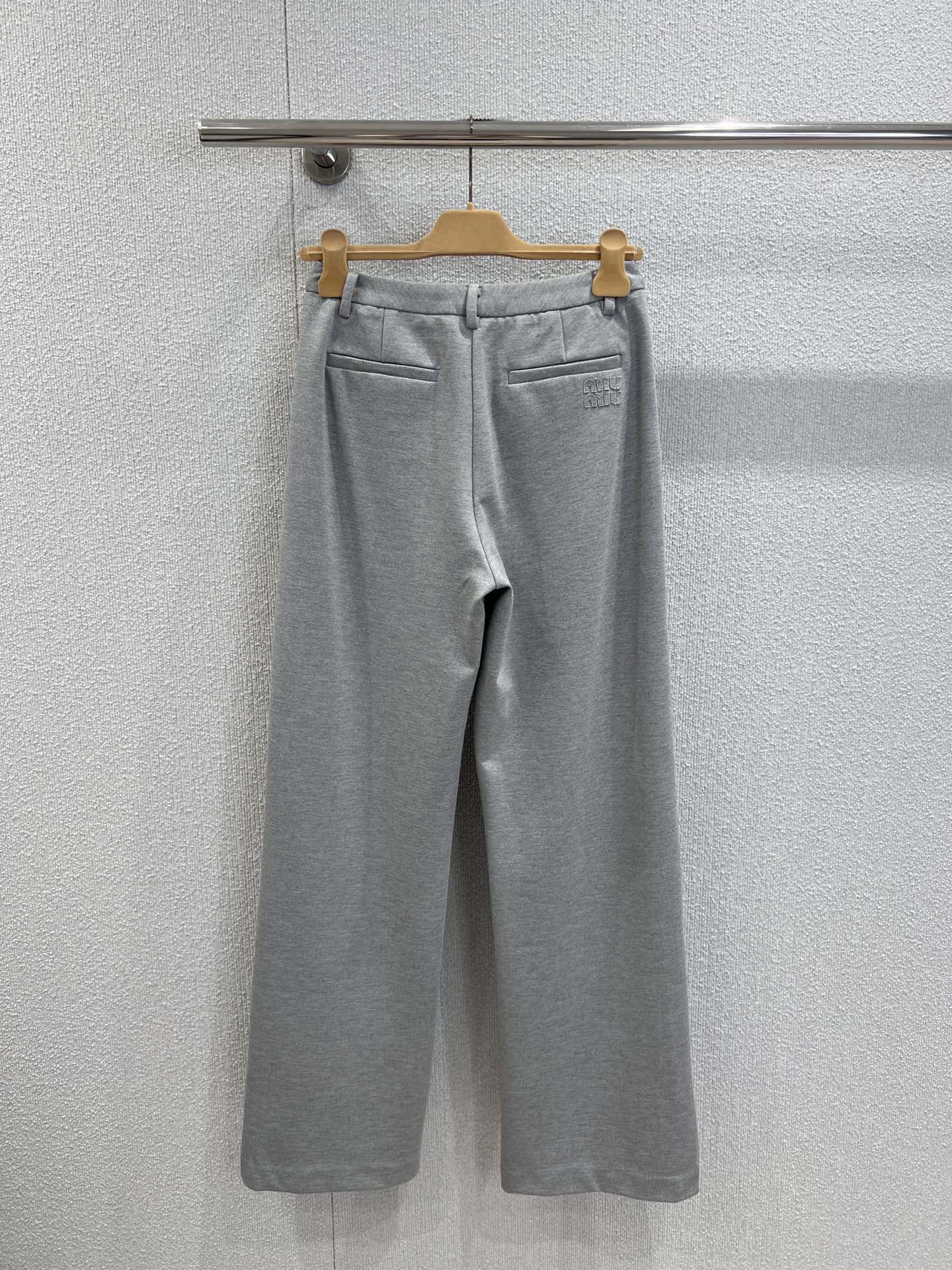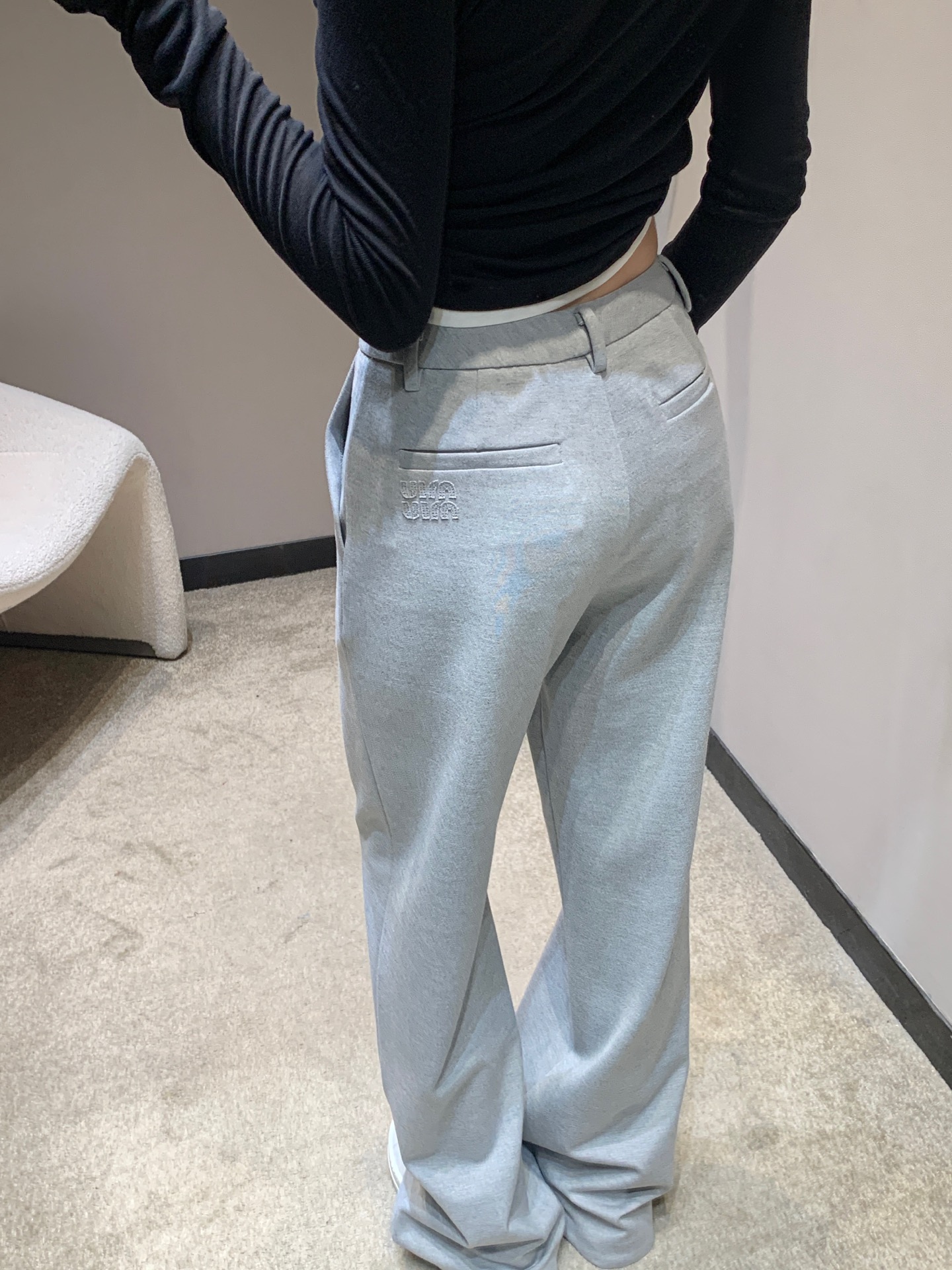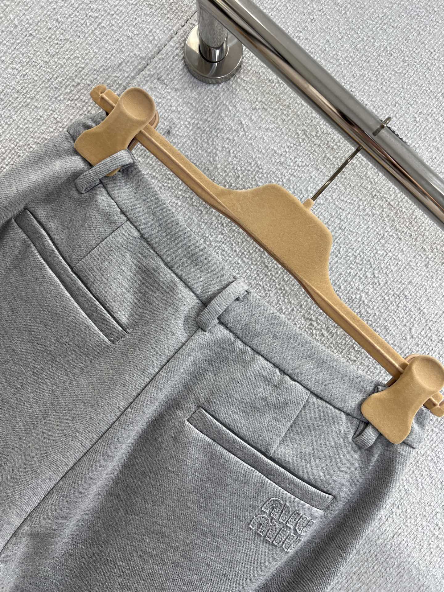 MiuMi* 25FW秋冬新款 腰带环休闲长裤丨⚠独家yb开发!高版出品!浅灰色调柔和又高级,如同冬日清晨的薄雾,自带清冷氛围感,轻松适配各种风格的上衣。经典的腰带环设计暗藏巧思,可搭配腰带打造腰线,也可随性敞开,释放松弛的慵懒感;后腰处的品牌标识低调又精致,都能展现毫不费力的高级感。