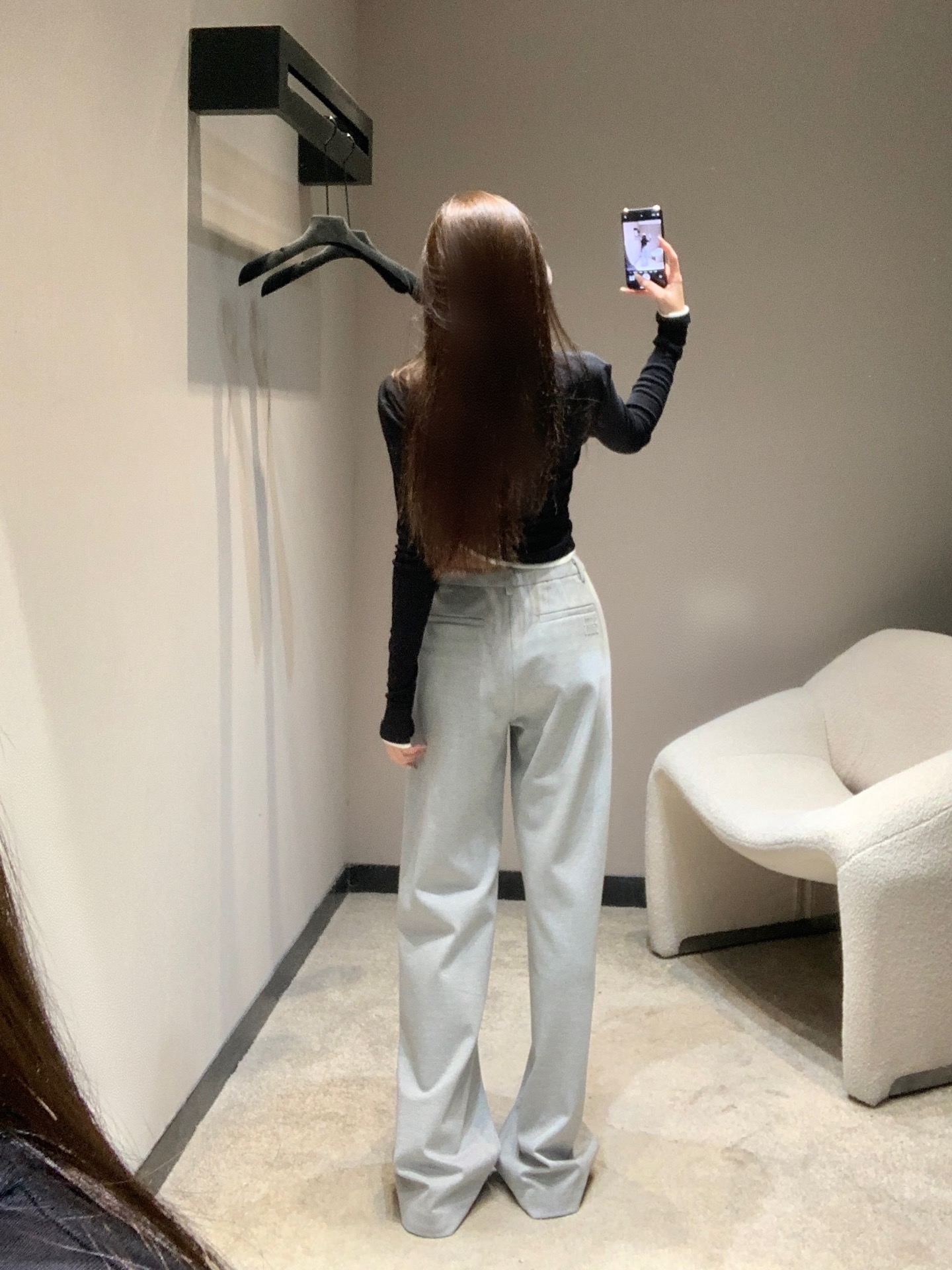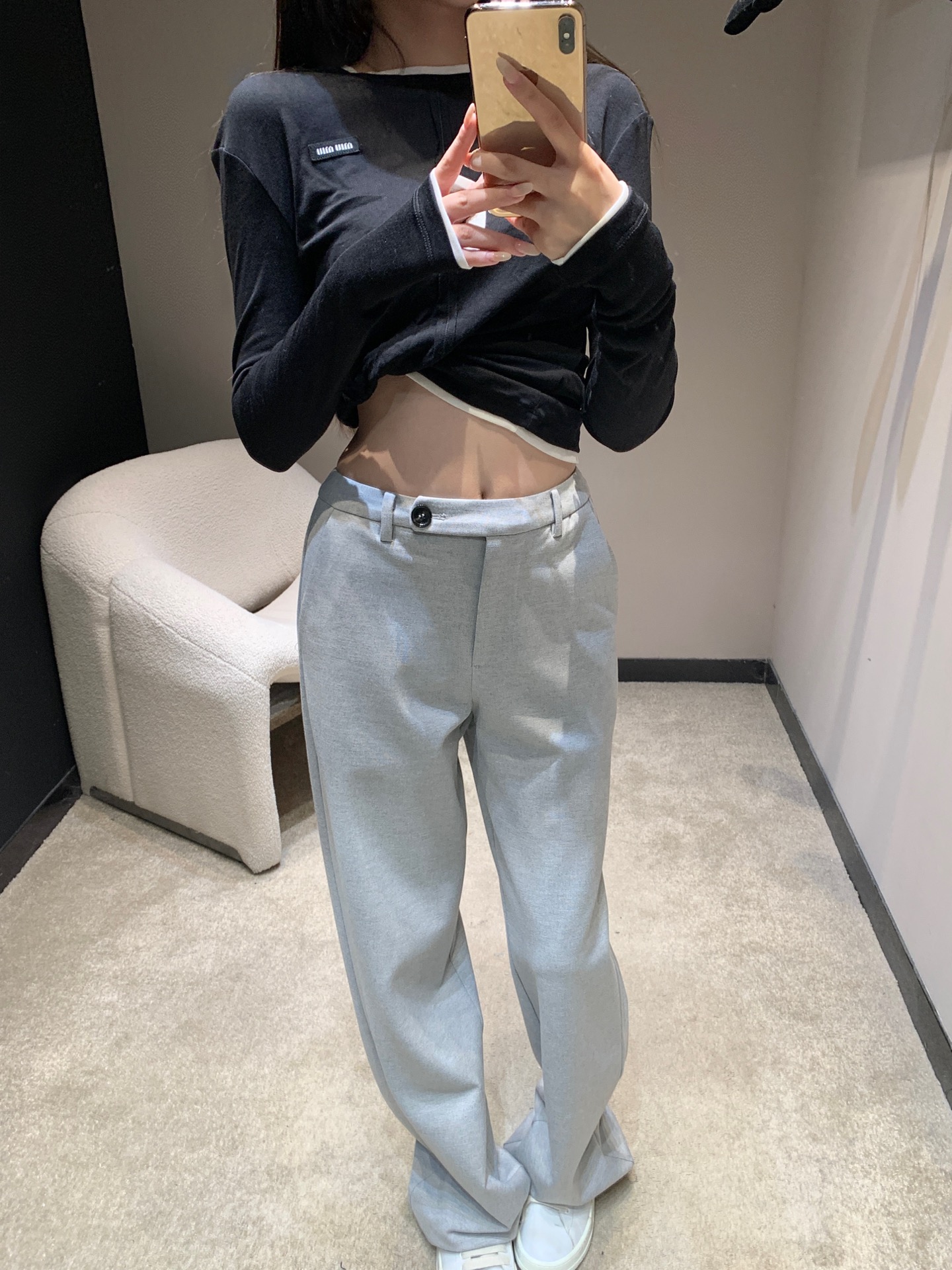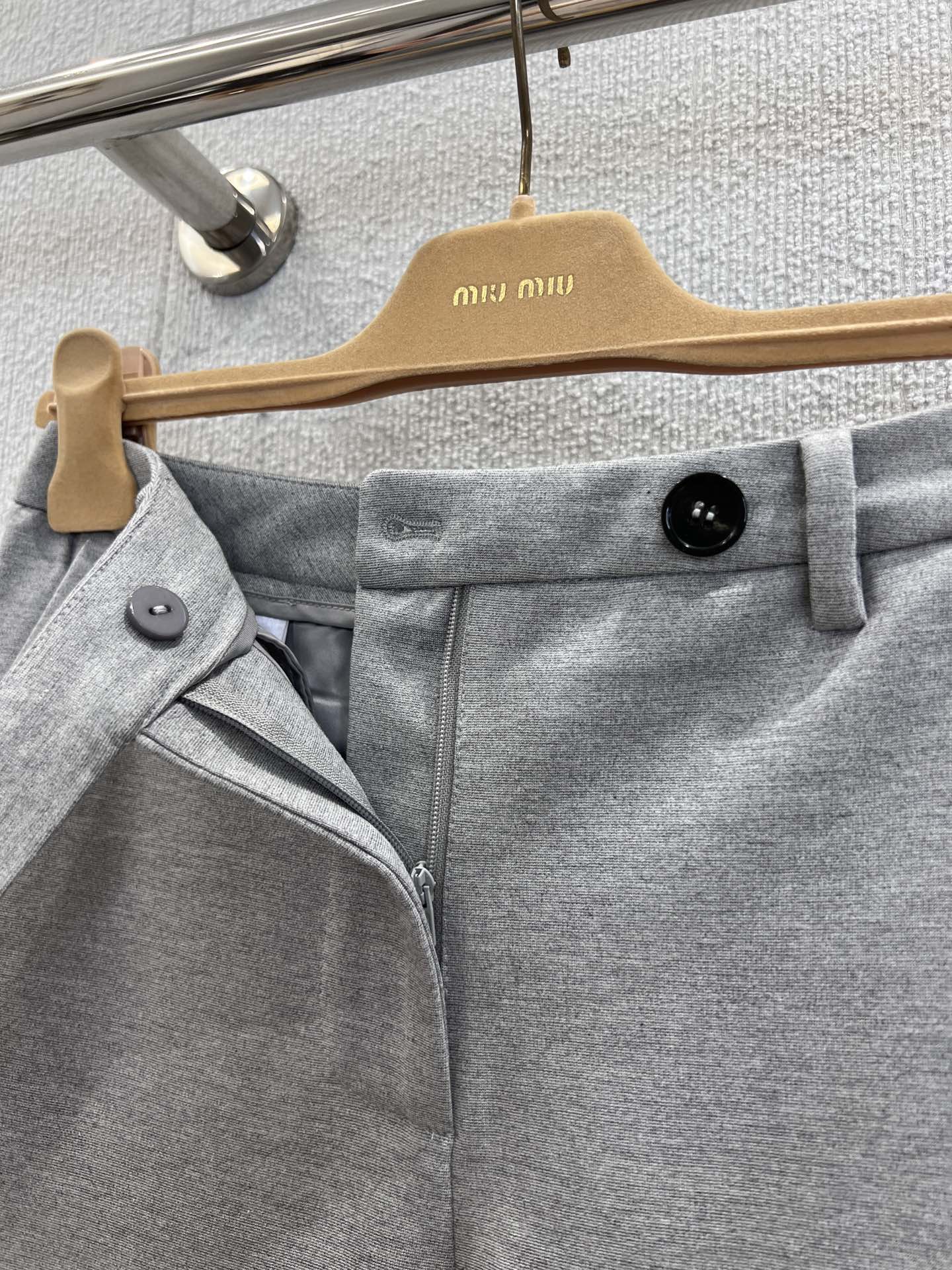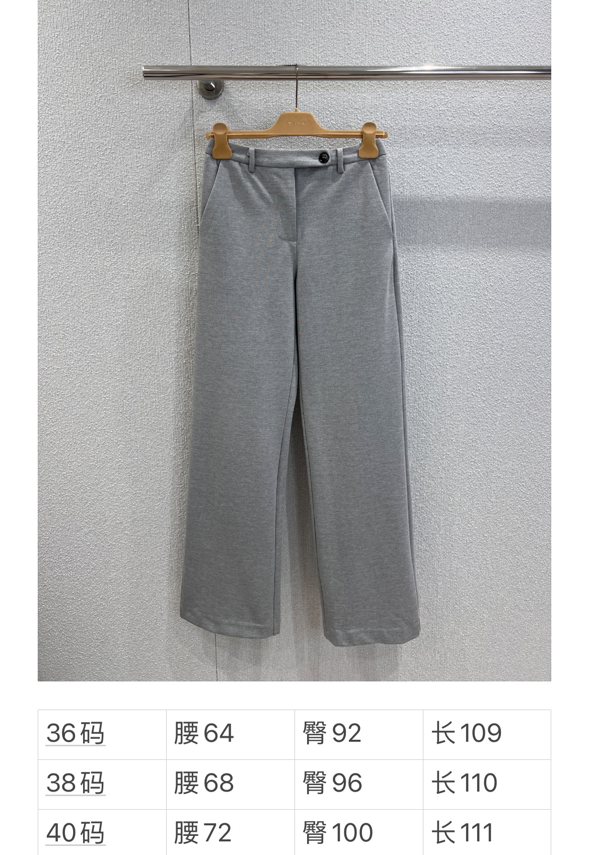 MiuMi* 25FW秋冬新款 腰带环休闲长裤丨⚠独家yb开发!高版出品!浅灰色调柔和又高级,如同冬日清晨的薄雾,自带清冷氛围感,轻松适配各种风格的上衣。经典的腰带环设计暗藏巧思,可搭配腰带打造腰线,也可随性敞开,释放松弛的慵懒感;后腰处的品牌标识低调又精致,都能展现毫不费力的高级感。