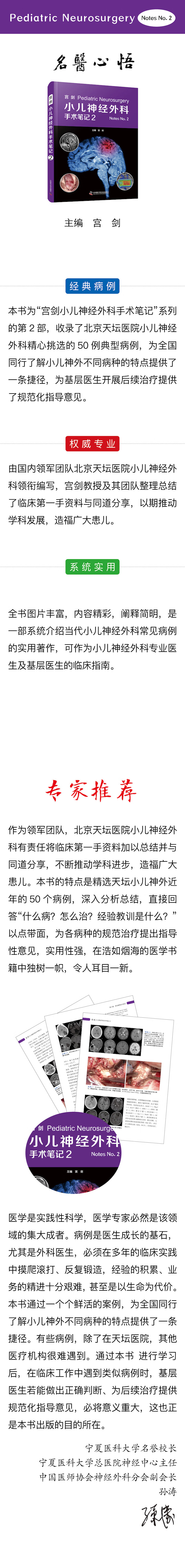 本书由北京天坛医院小儿神经外科主任宫剑教授主编,是继《宫剑小儿神经外科手术笔记 1》之后,宫剑教授及其团队“十年十部手术笔记”出版计划中的第 2 部。宫剑教授专注于儿童颅内肿瘤及各类先天性疾病外科治疗近 20 年,带领团队每年完成手术千余例,数量及质量均达到国际先进水平。本书上篇为每年千余例临床病例中精心挑选的 50例典型病例,详细介绍患儿的主诉、临床症状和体征、术前术后影像学特点、手术操作要点、术后病理及蛋白基因检测结果、术后转归等,结合国内外最新研究进展,总结出该病种的治疗经验与手术体会。下篇则汇总了宫剑教授及马振宇主任接受神外新媒体的最新访谈,就部分病例的天坛诊疗规范进行了详细解读,对小儿神外的历史进行了系统回顾。本书是第一手临床资料总结,实用性强,适合作为日常临床诊疗工作的参考资料,也适于广大患儿家长参考阅读。