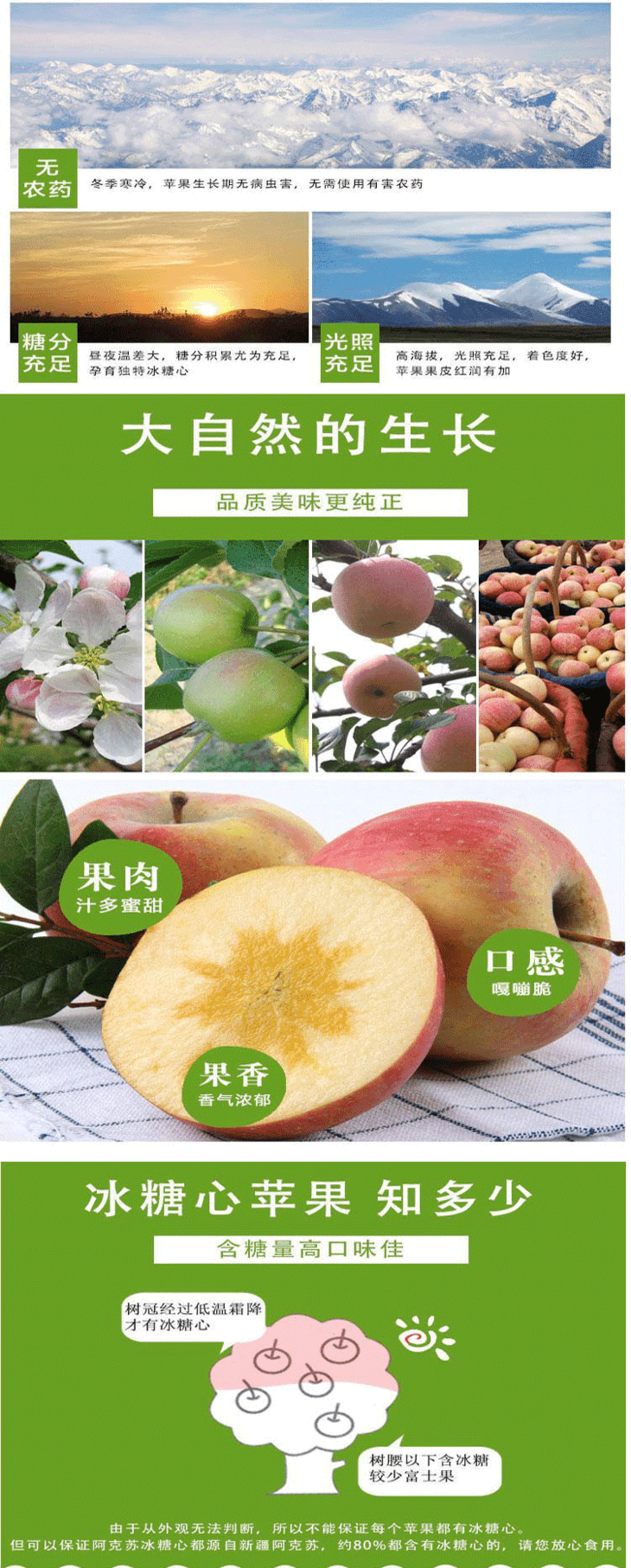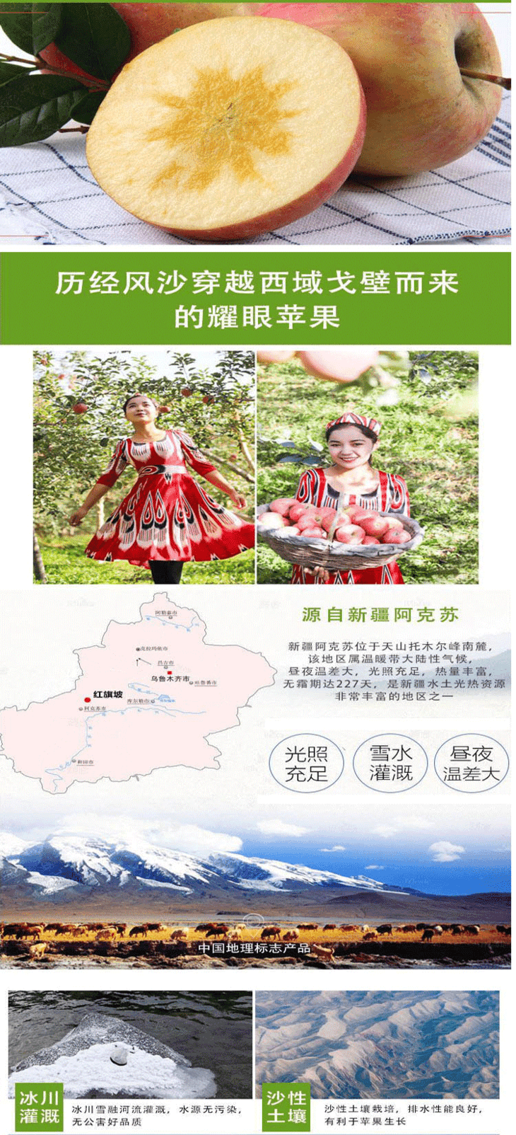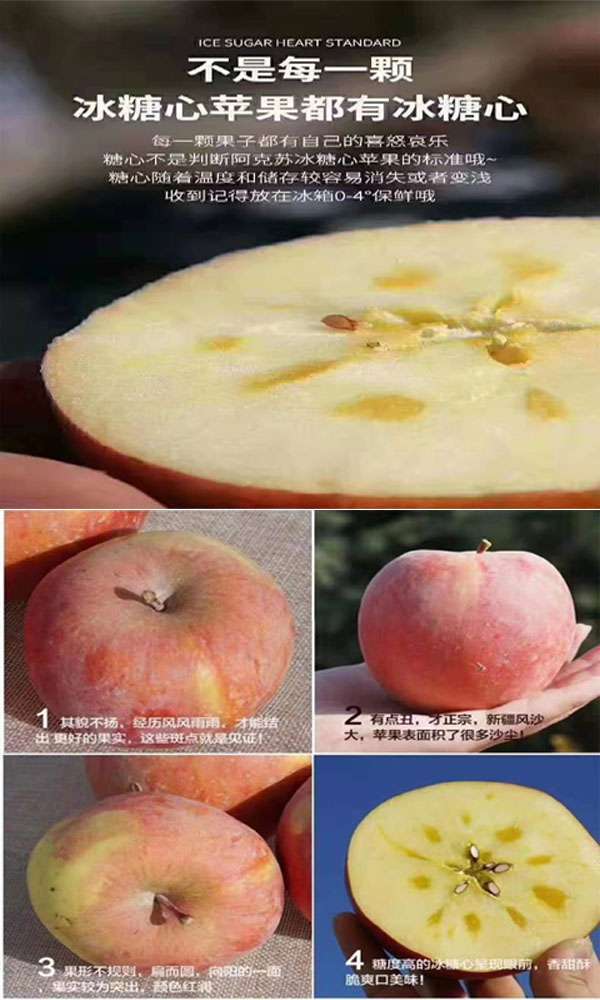 “吐鲁番的葡萄哈密的瓜,阿克苏的苹果人人夸”是流传在新疆的一句歌谣。阿克苏高海拔区域昼夜温差大、光照充足、土壤肥沃,使苹果含糖量高,糖度在18度左右,口味特别甜、脆。