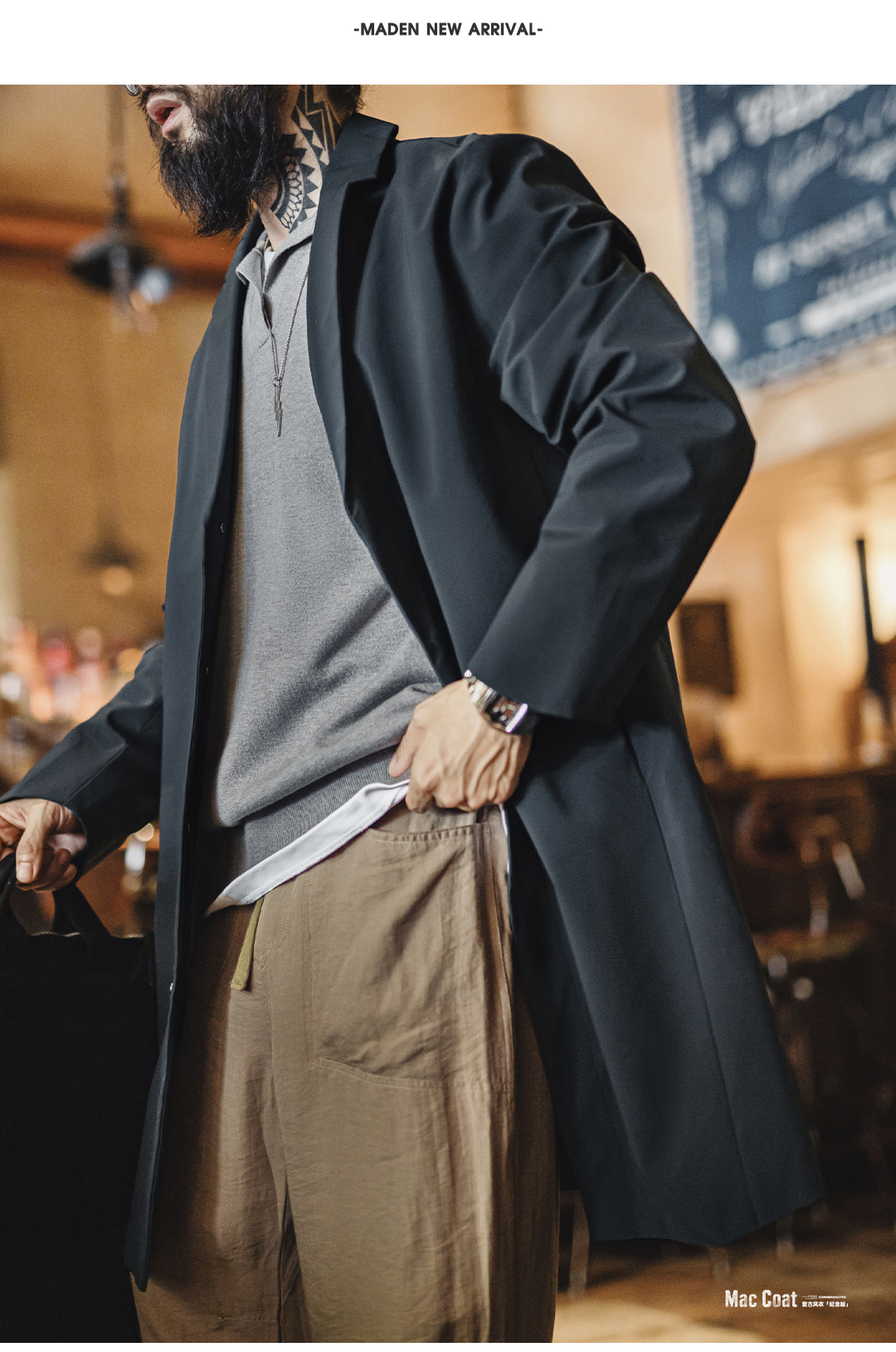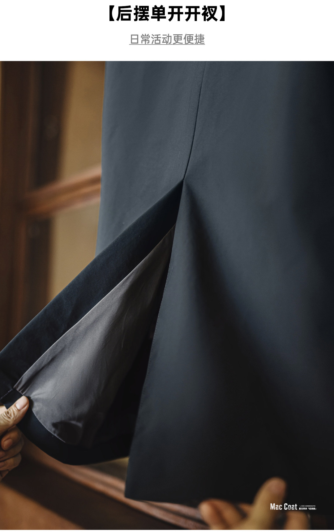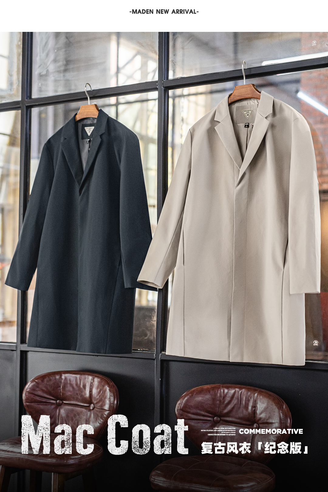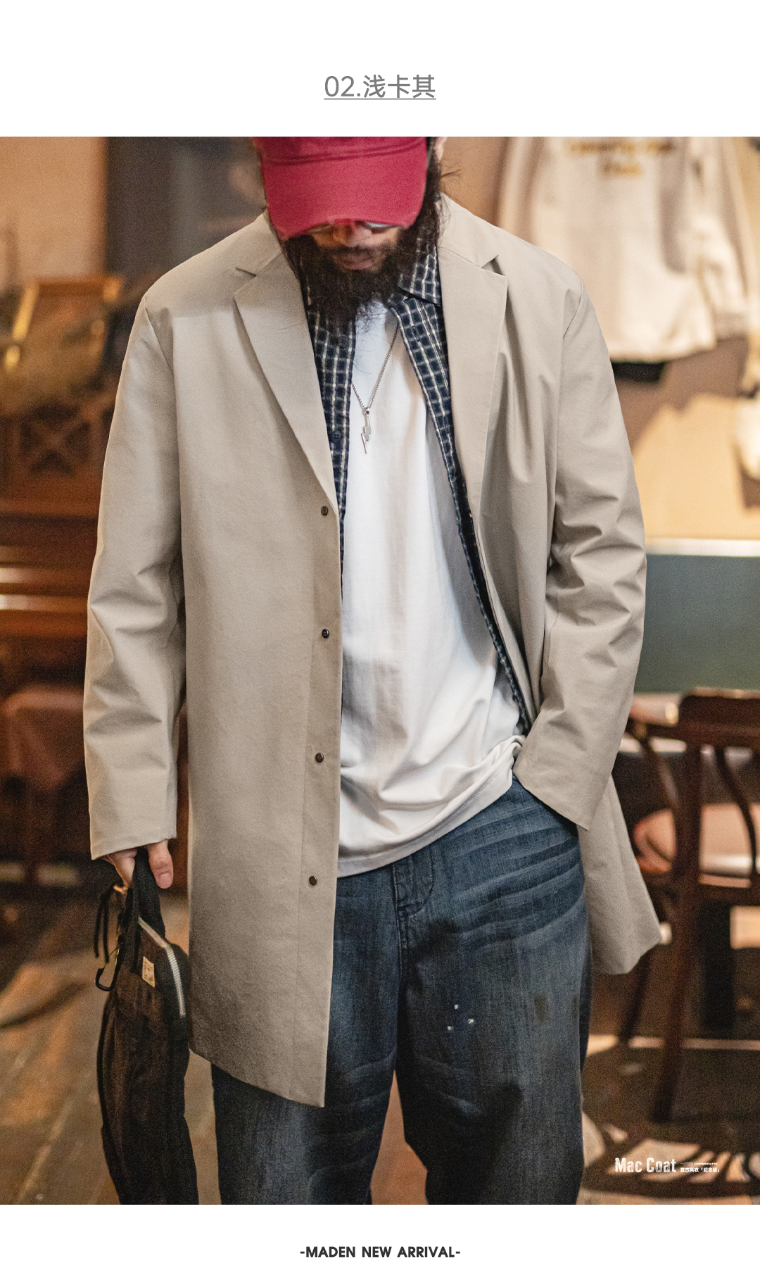 马登工装美式复古薄款通勤风衣英伦中长款蓝色翻领大衣外套男春季