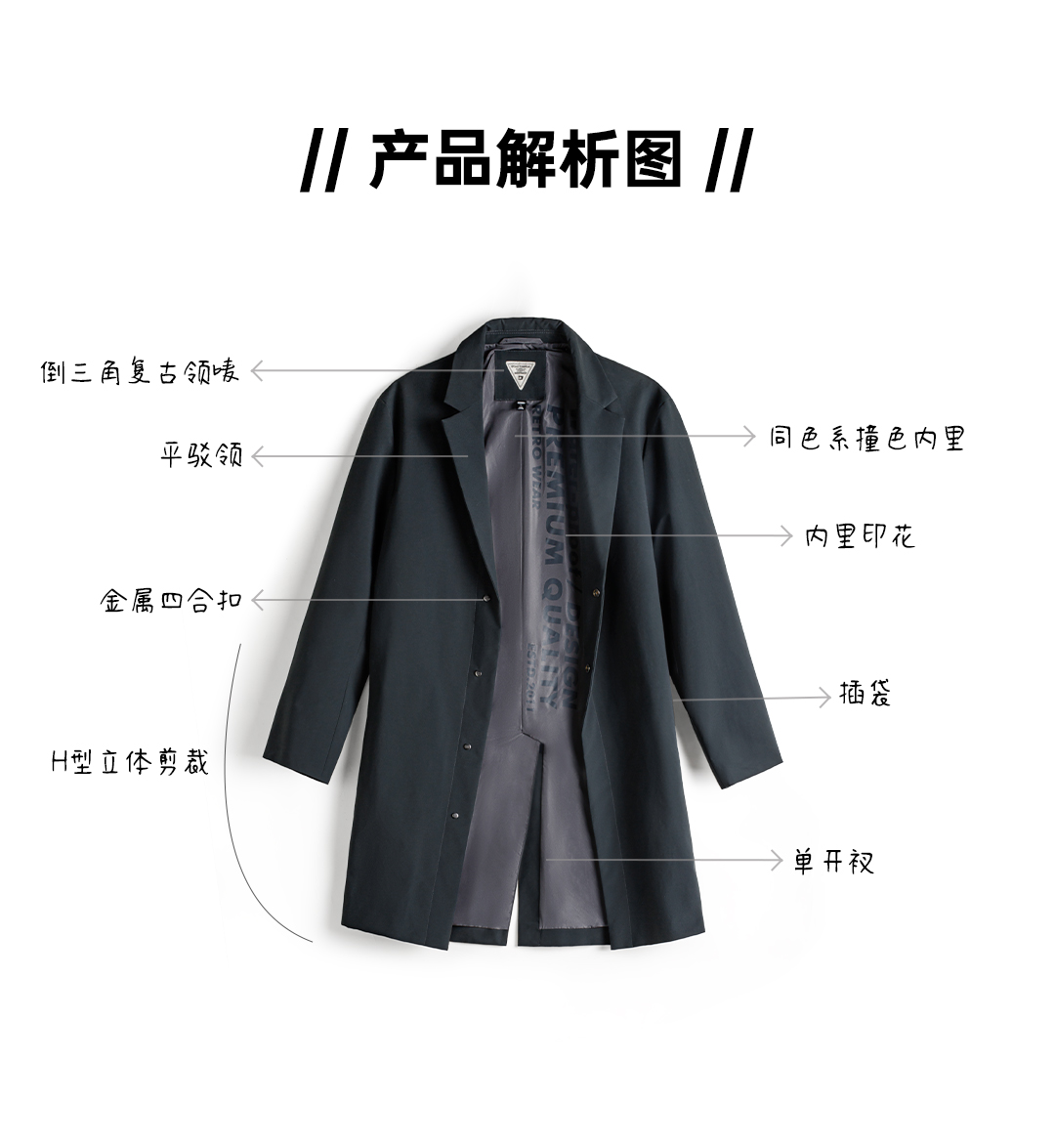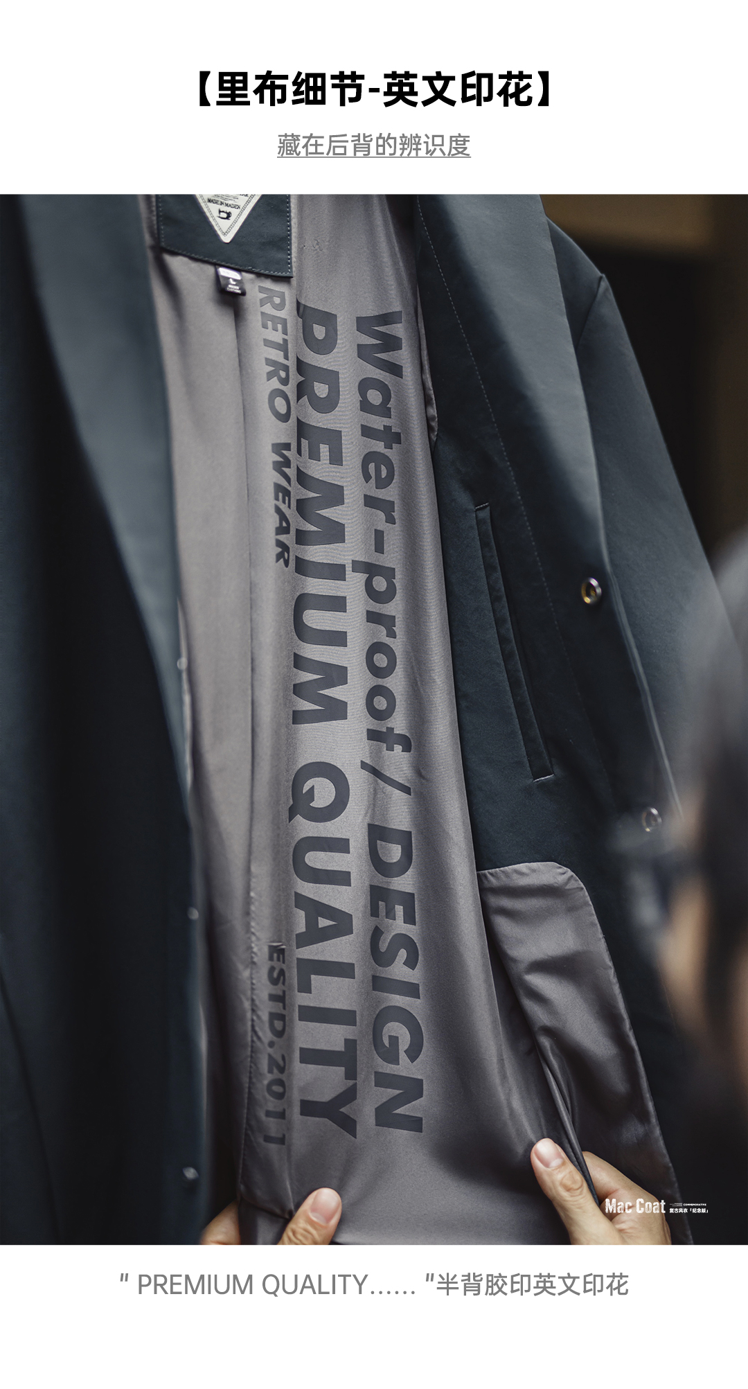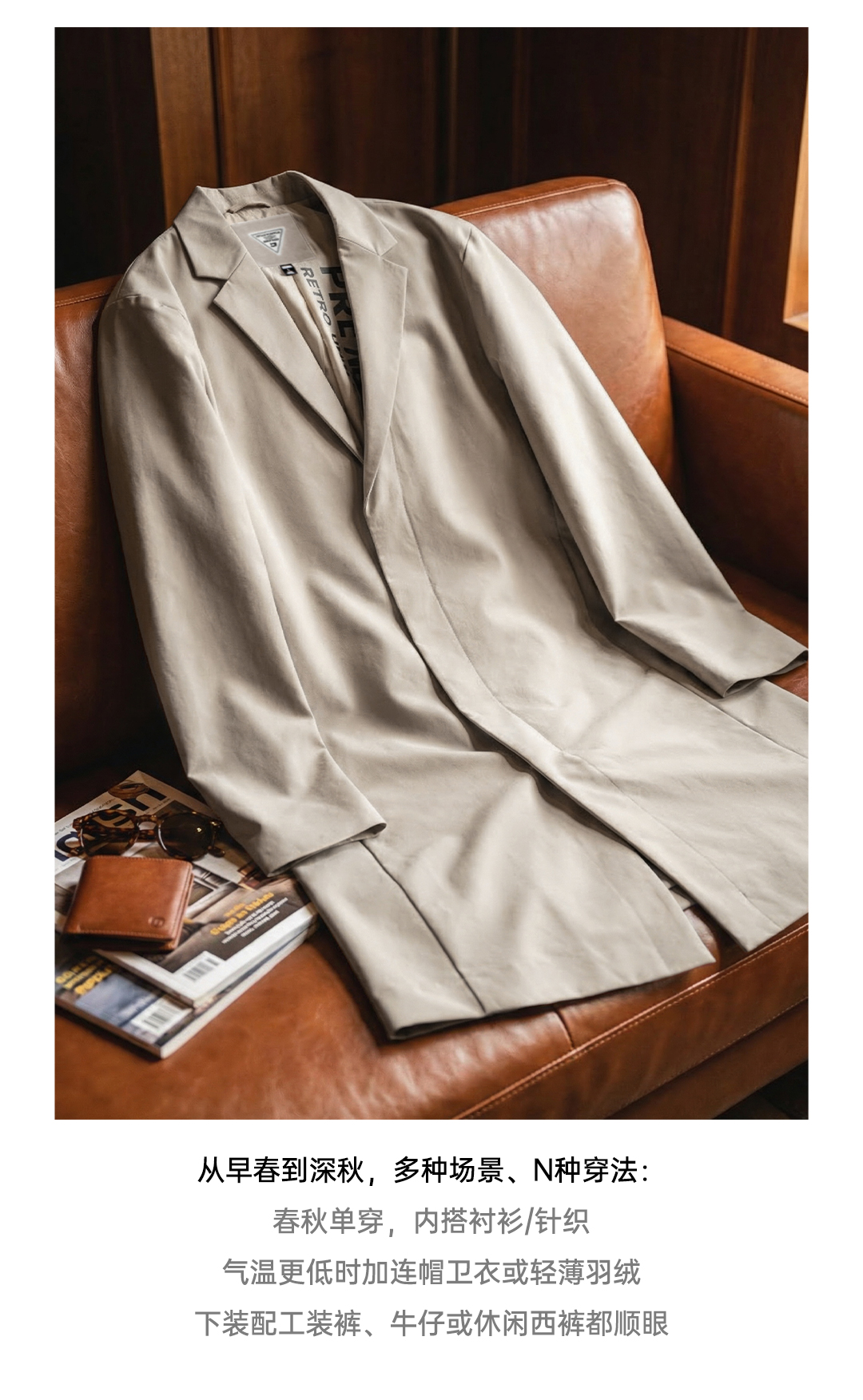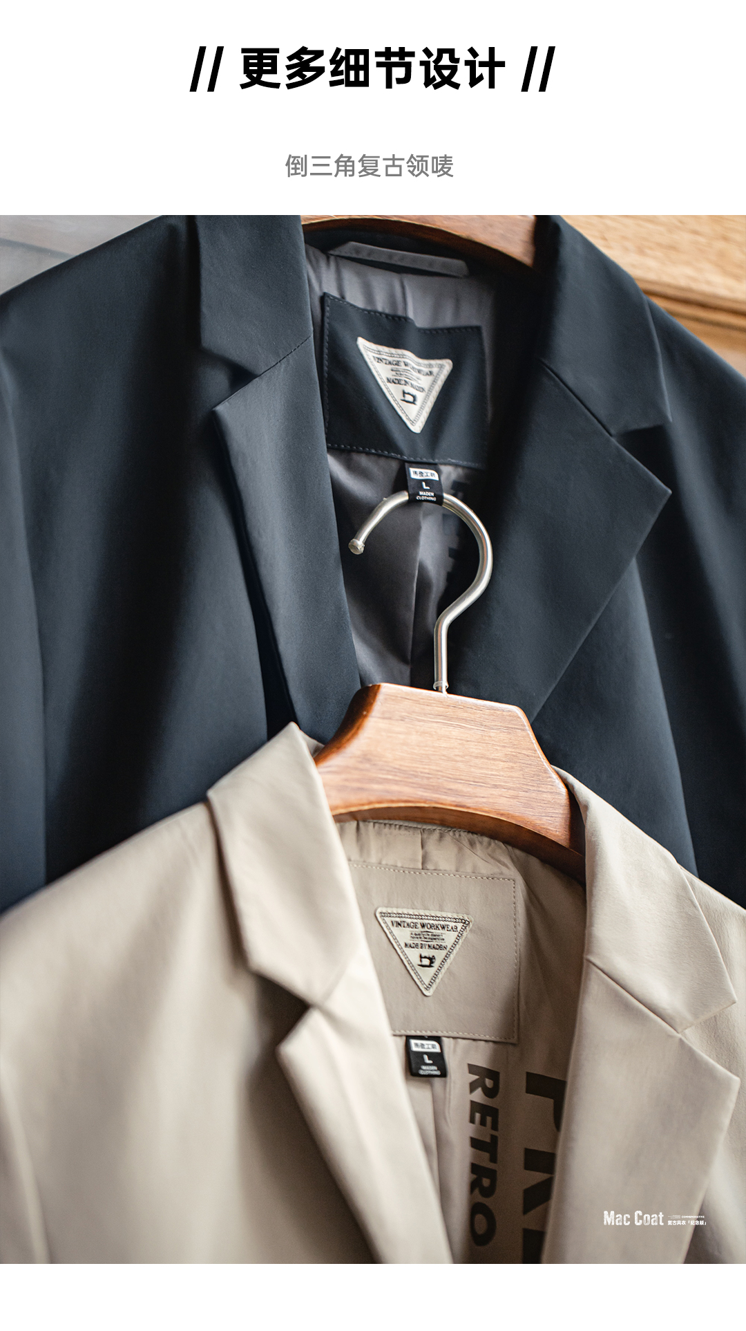 马登工装美式复古薄款通勤风衣英伦中长款蓝色翻领大衣外套男春季