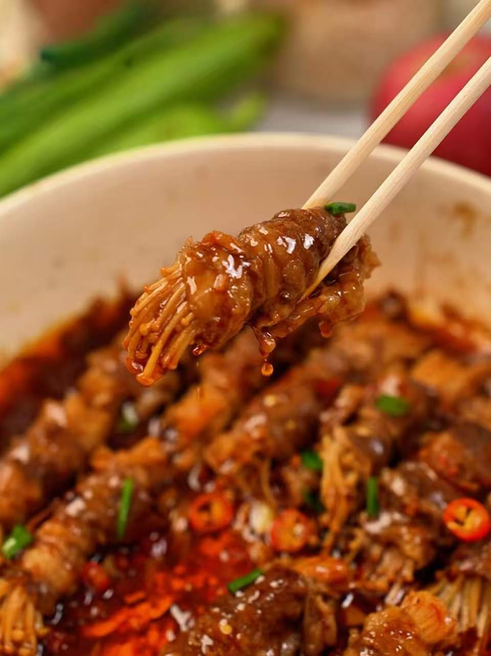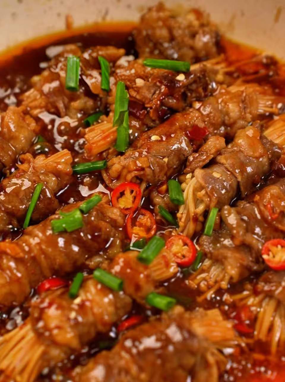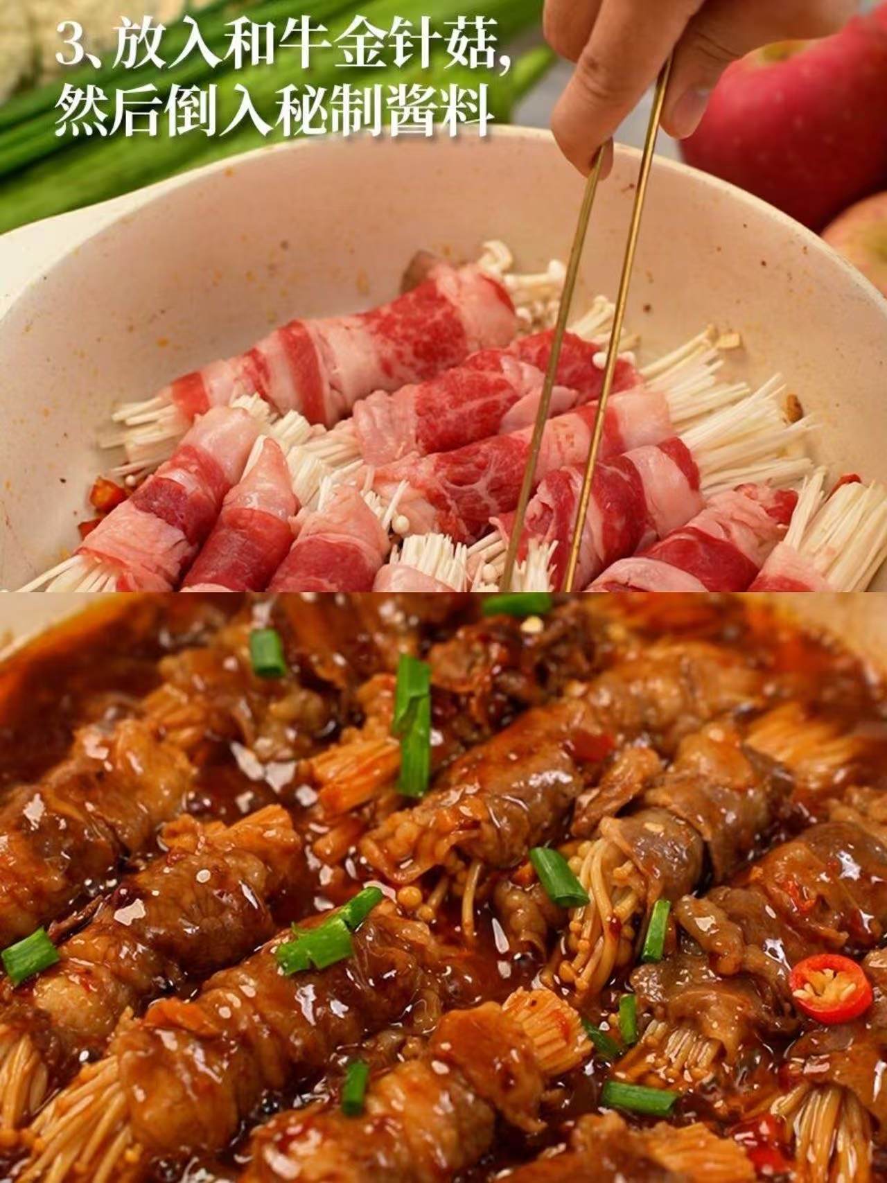 焦香的牛肉裹上脆爽的金针菇