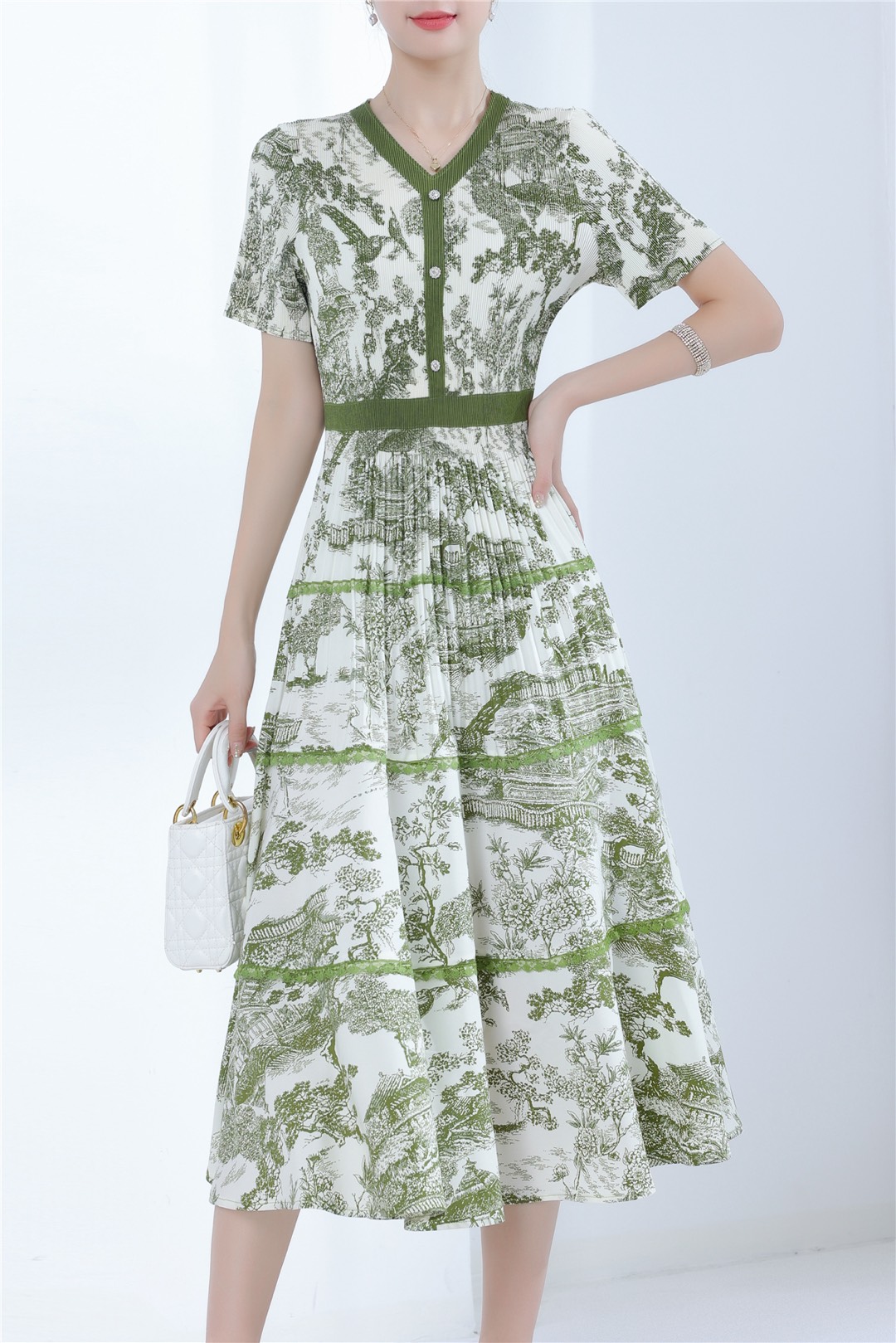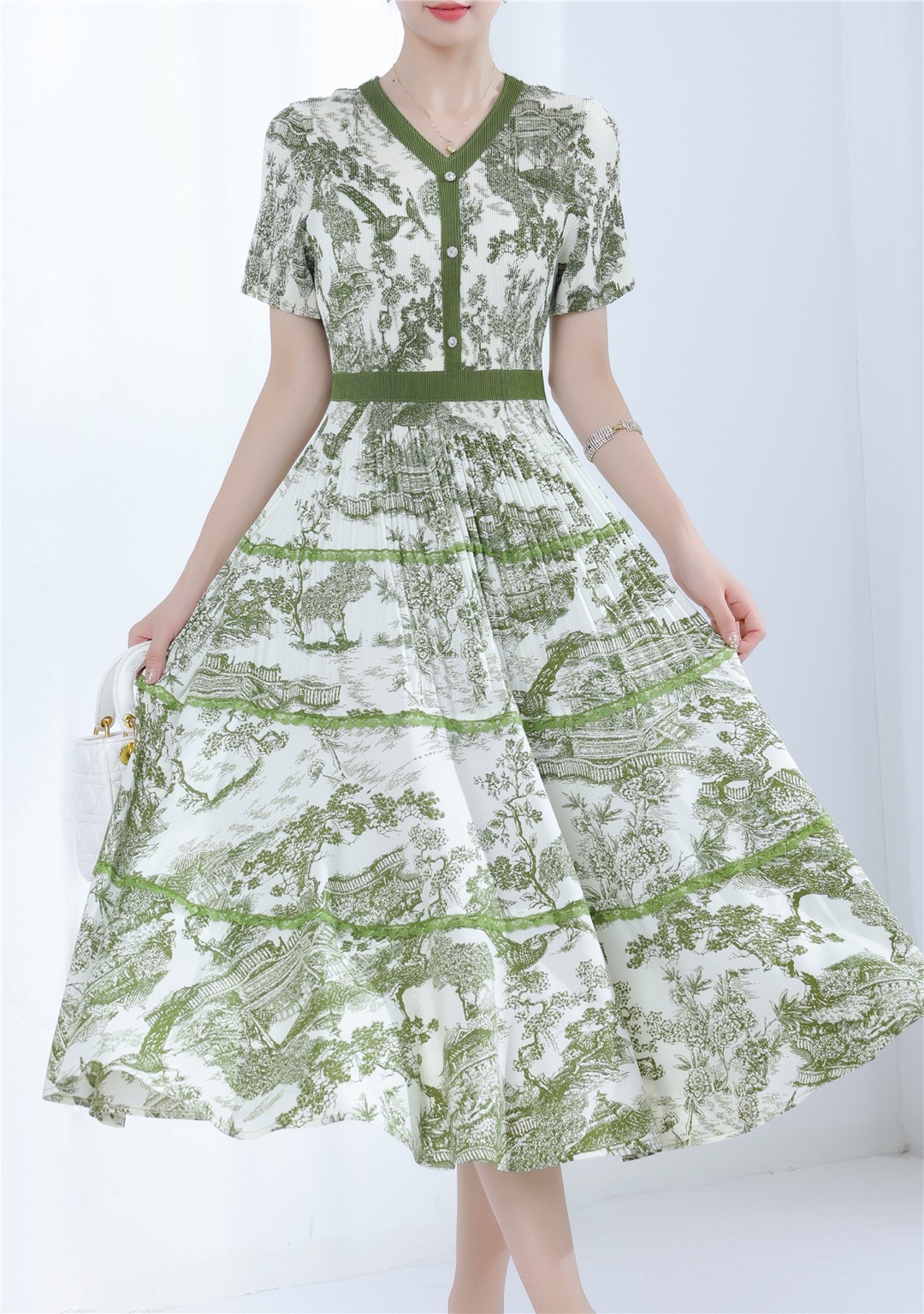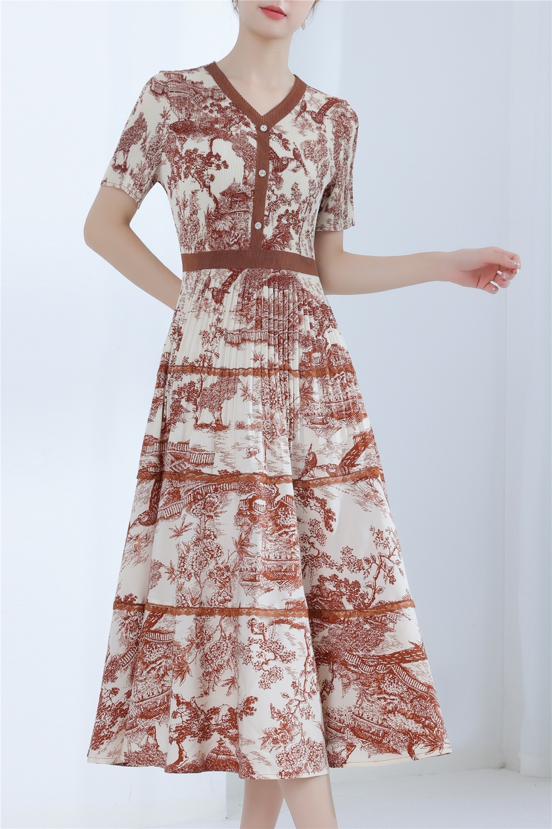 HJ2S97_棠梨褐色/庭芜绿色_连衣裙_春夏_气质中式印花 V 领三宅褶皱显瘦 A 字大摆裙_高级女装_BERNIEELEN 伯妮斯茵